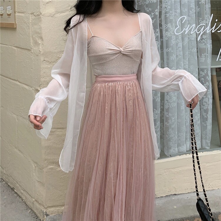 Платье-комбинация, кардиган, розовые румяна, летний комплект, популярно в интернете, в западном стиле, 2020 года, новая коллекция