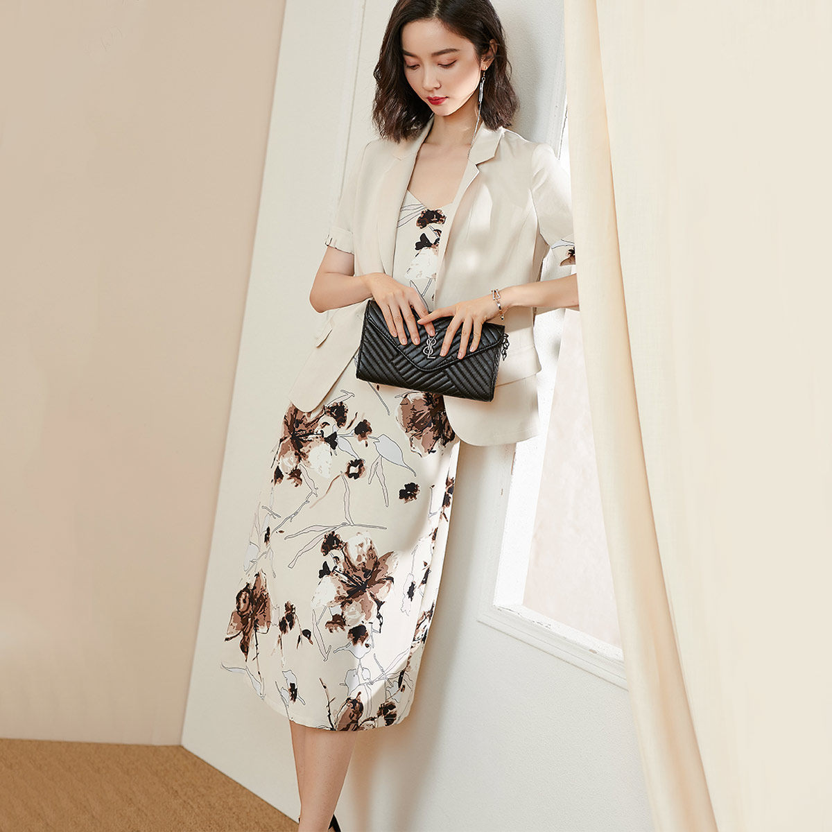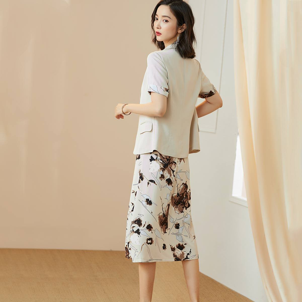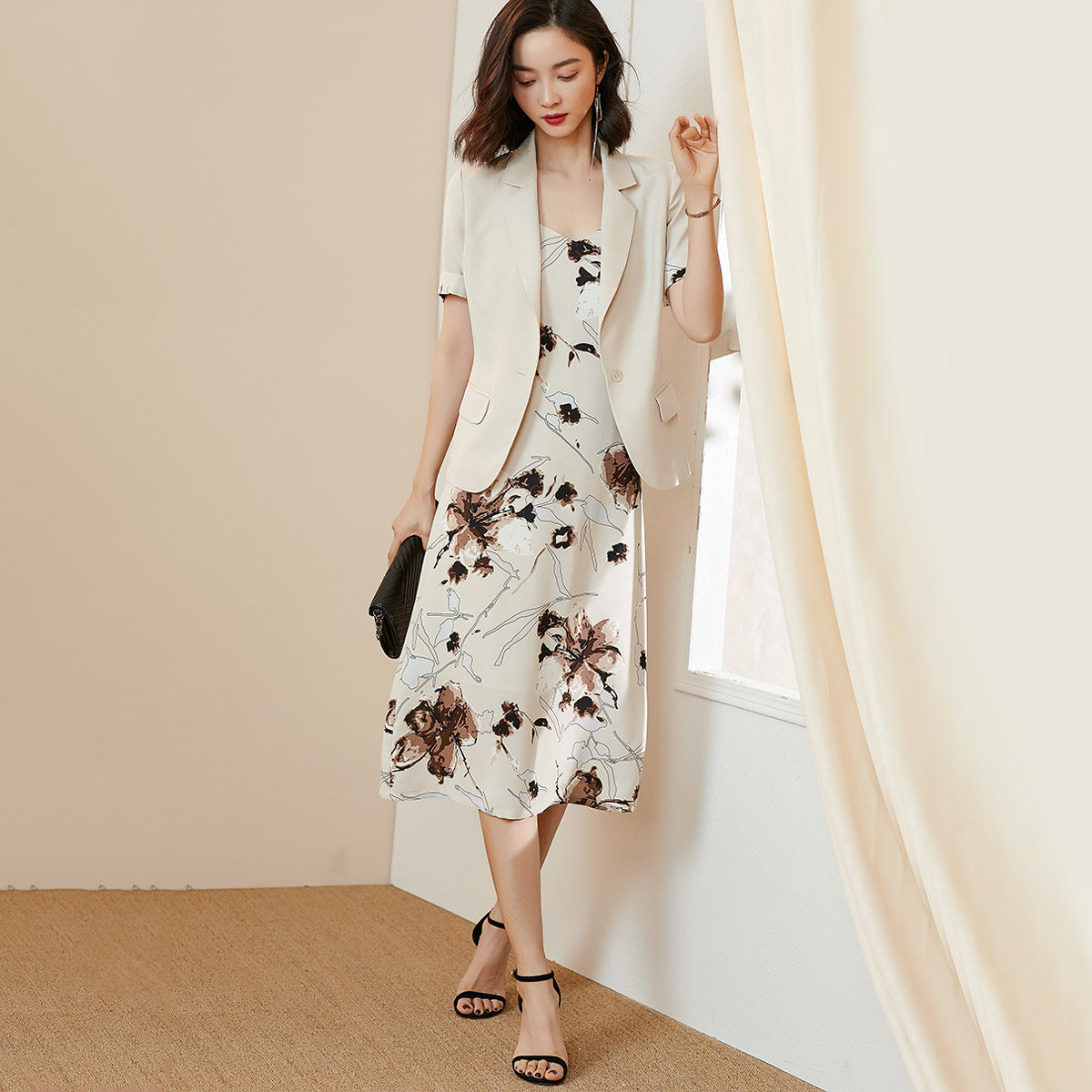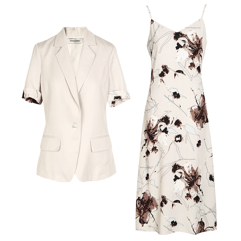 Летний комплект, пиджак классического кроя, костюм, платье-комбинация, сезон 2021, короткий рукав, в цветочек