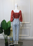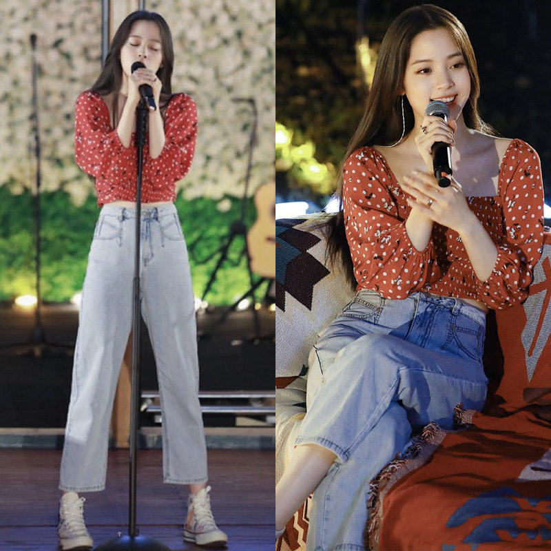 Нана, красный короткий комплект, синие прямые свободные джинсы, штаны, квадратный вырез, свободный прямой крой