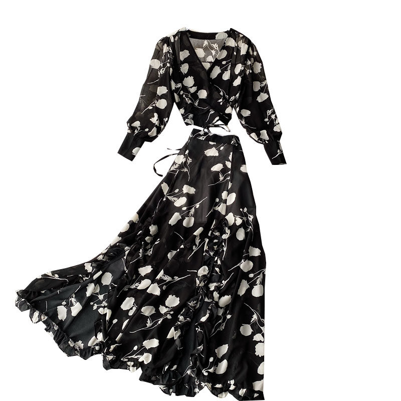 Приталенный комплект, шифоновый корсет, шифоновая длинная юбка, рукава фонарики, V-образный вырез, высокая талия