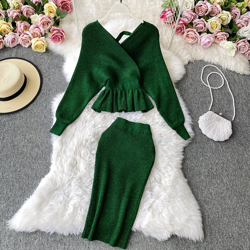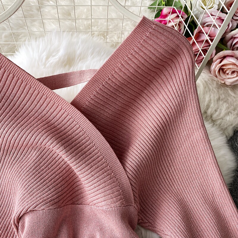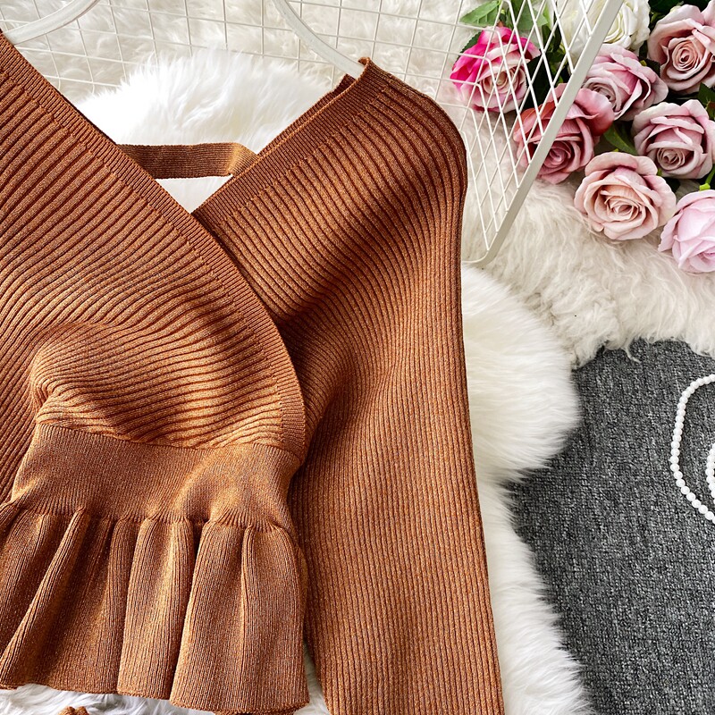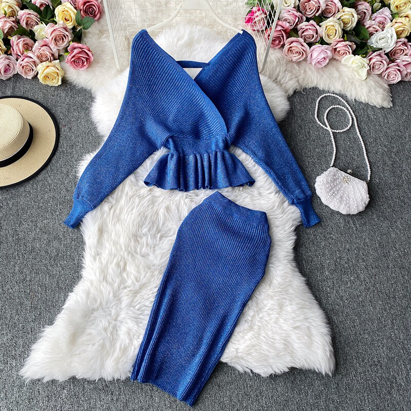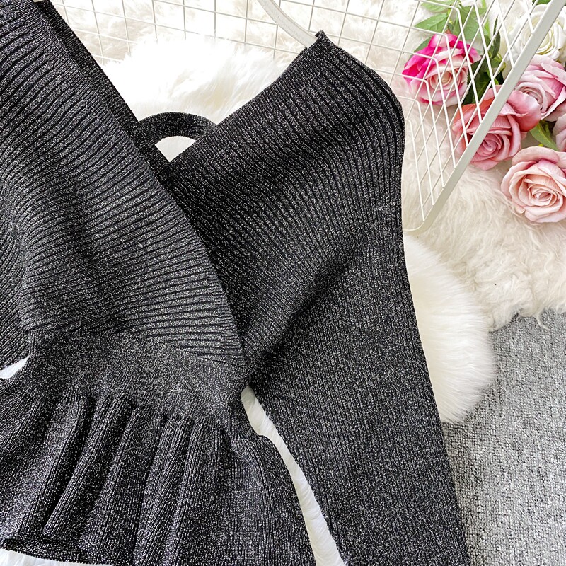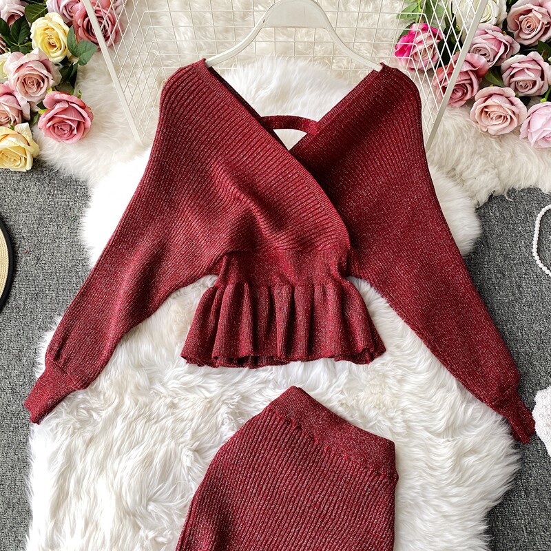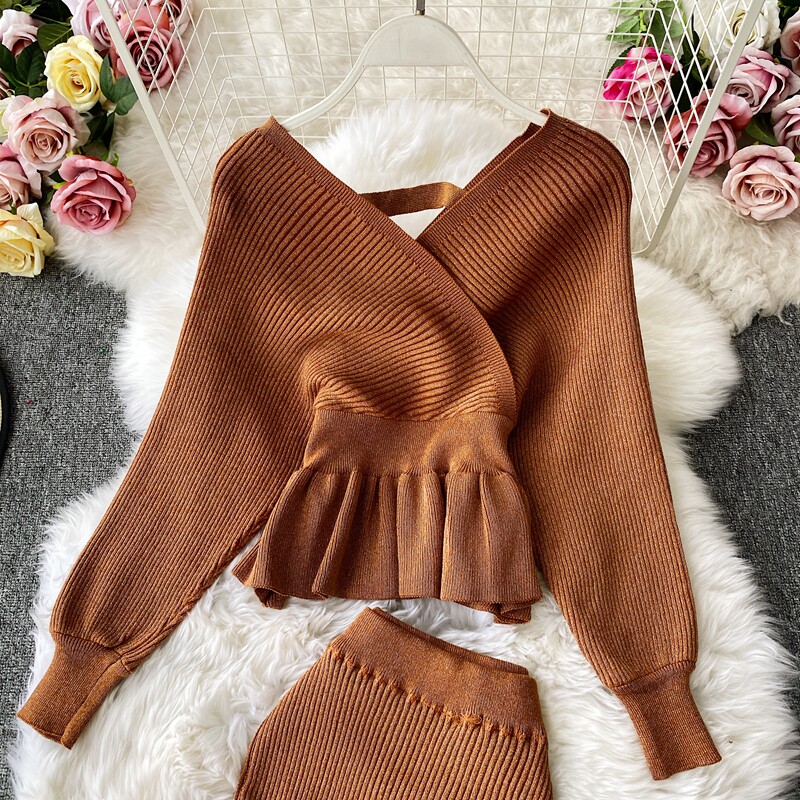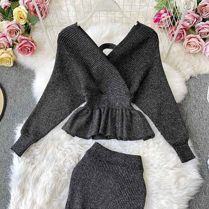 Демисезонный лонгслив, трикотажный свитер, поясная сумка, юбка, комплект, в корейском стиле, V-образный вырез, с открытой спиной, высокая талия