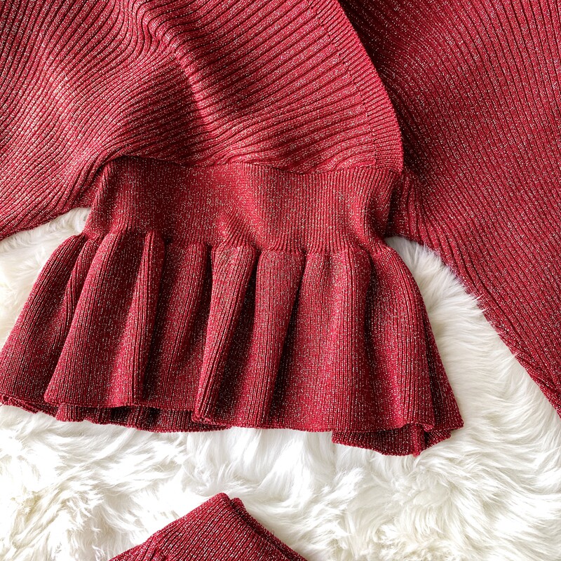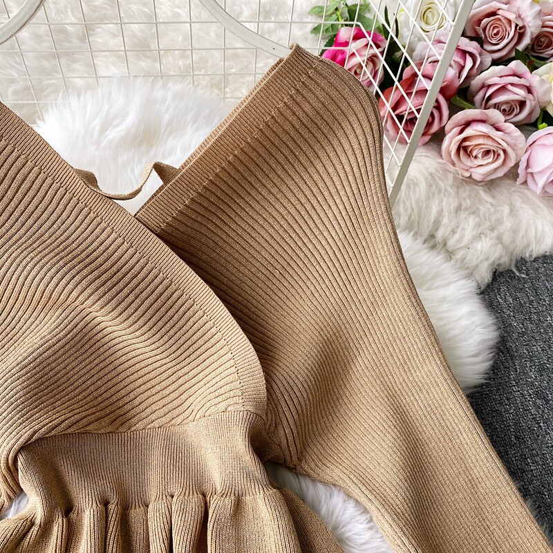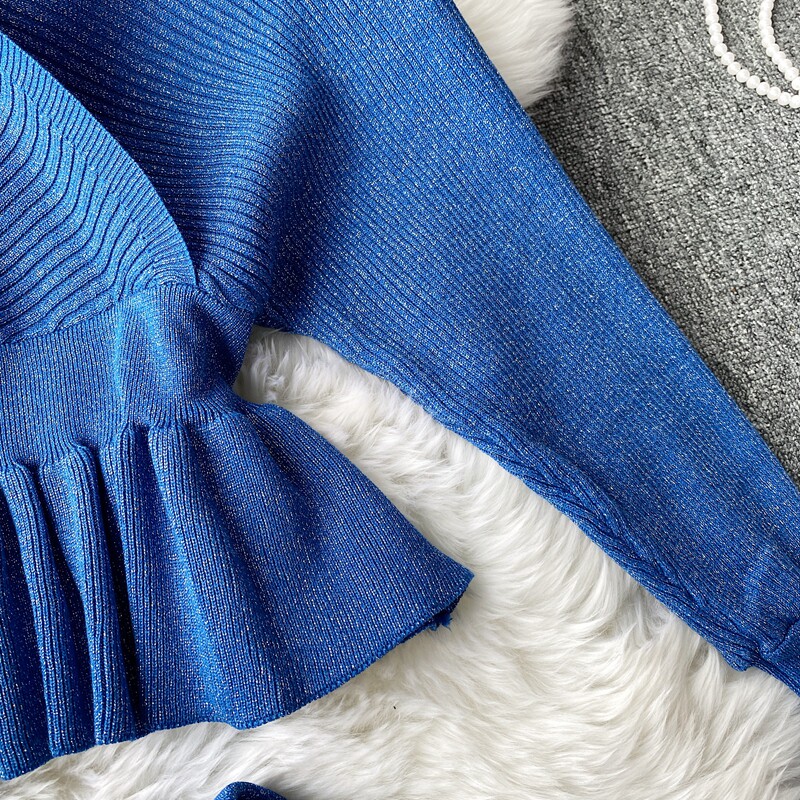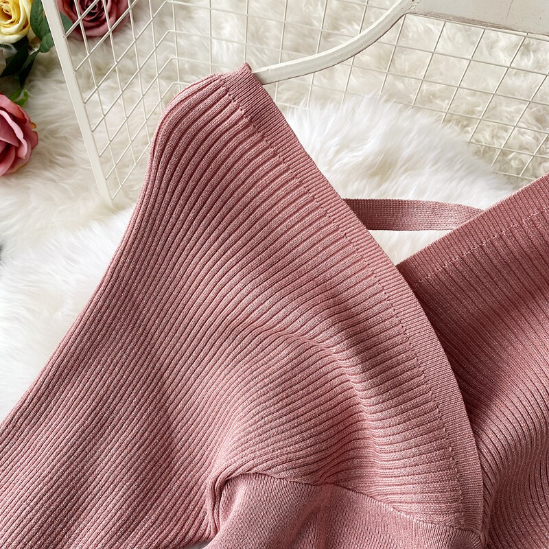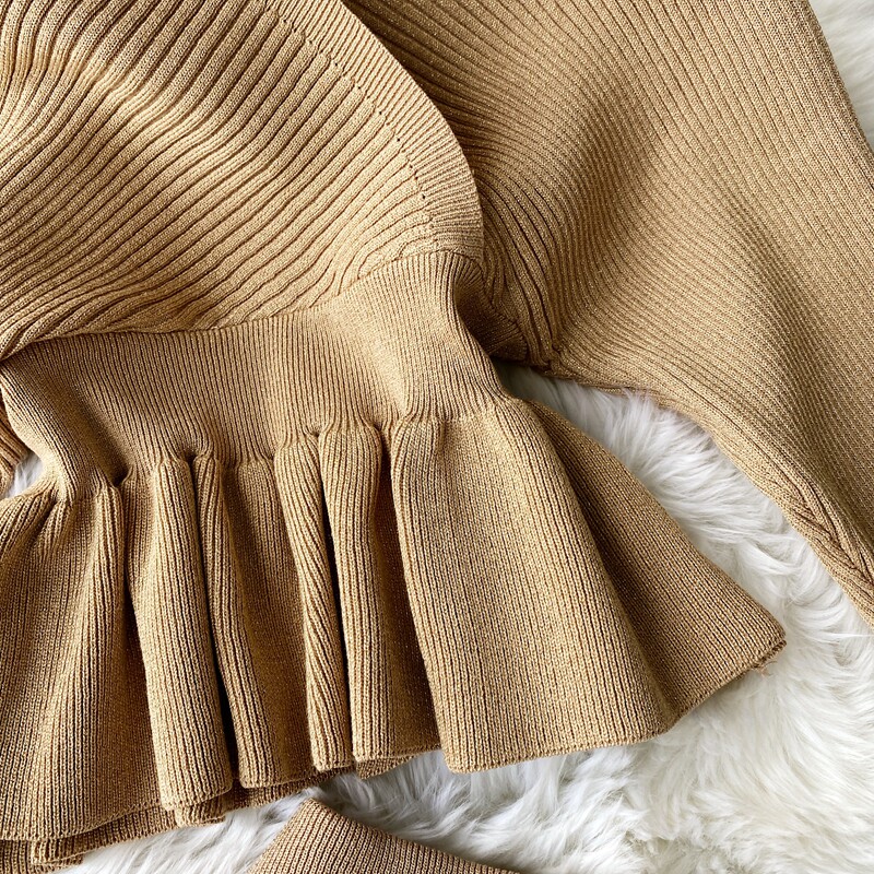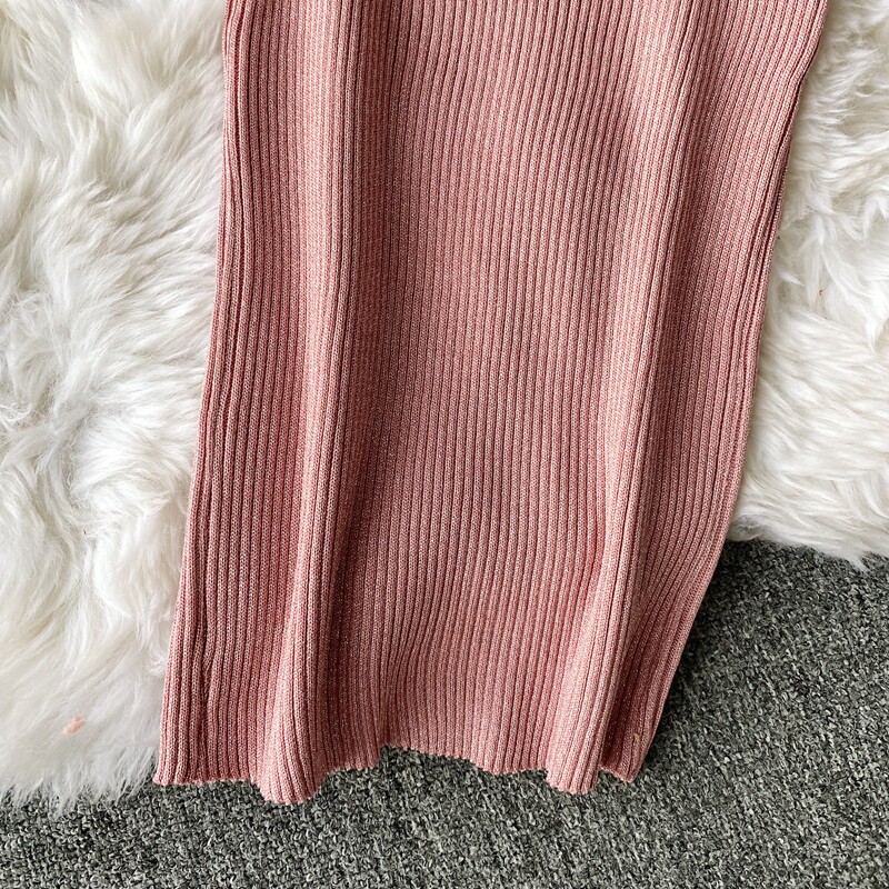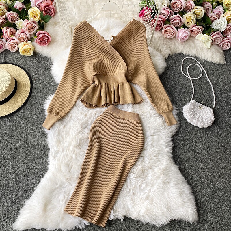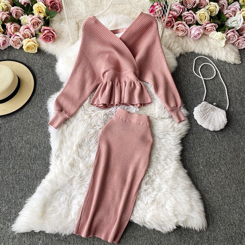 Демисезонный лонгслив, трикотажный свитер, поясная сумка, юбка, комплект, в корейском стиле, V-образный вырез, с открытой спиной, высокая талия