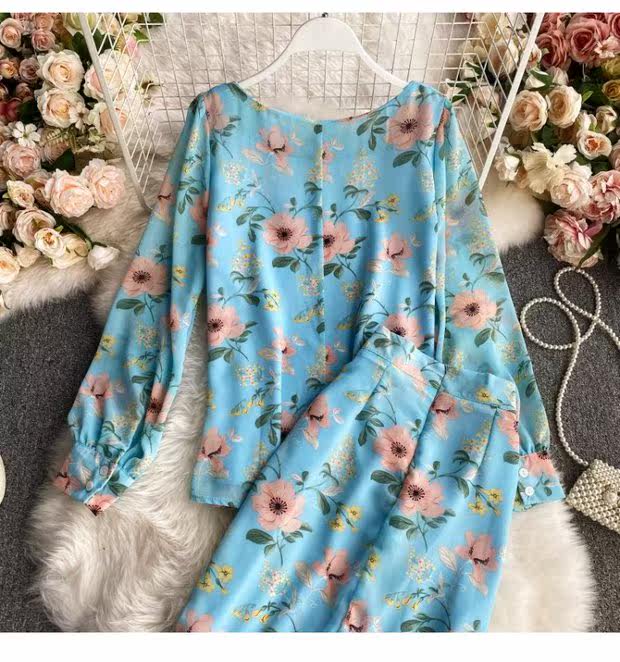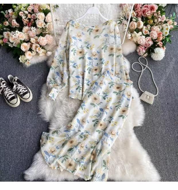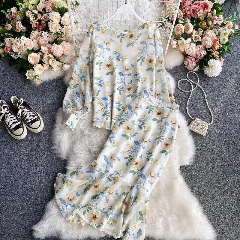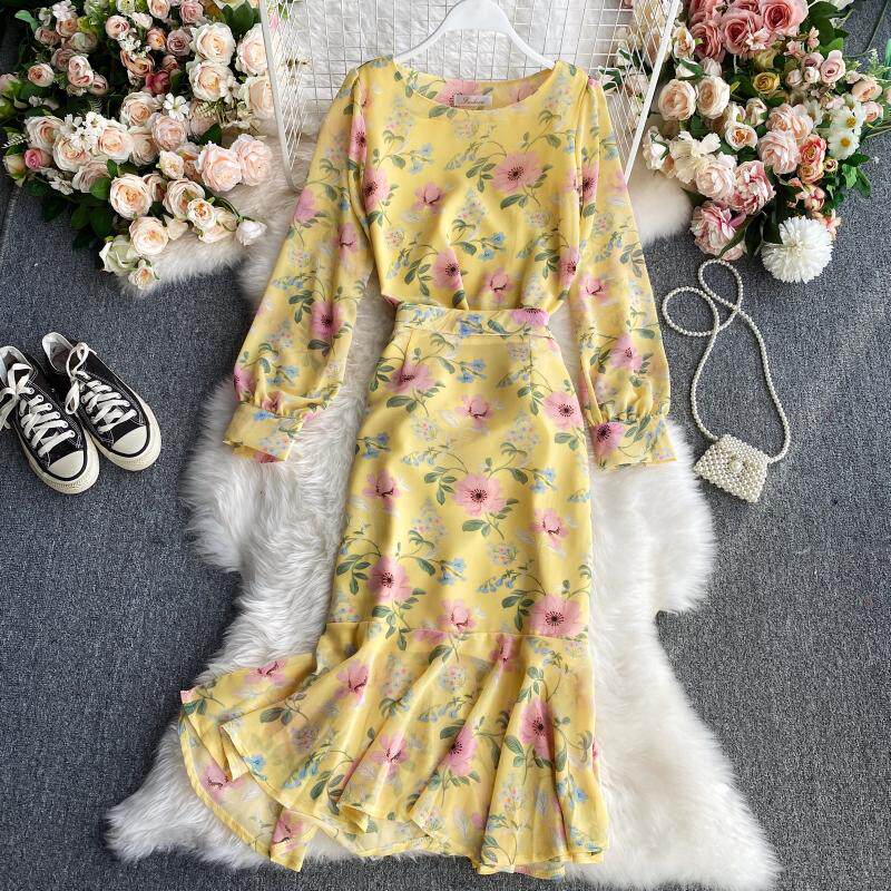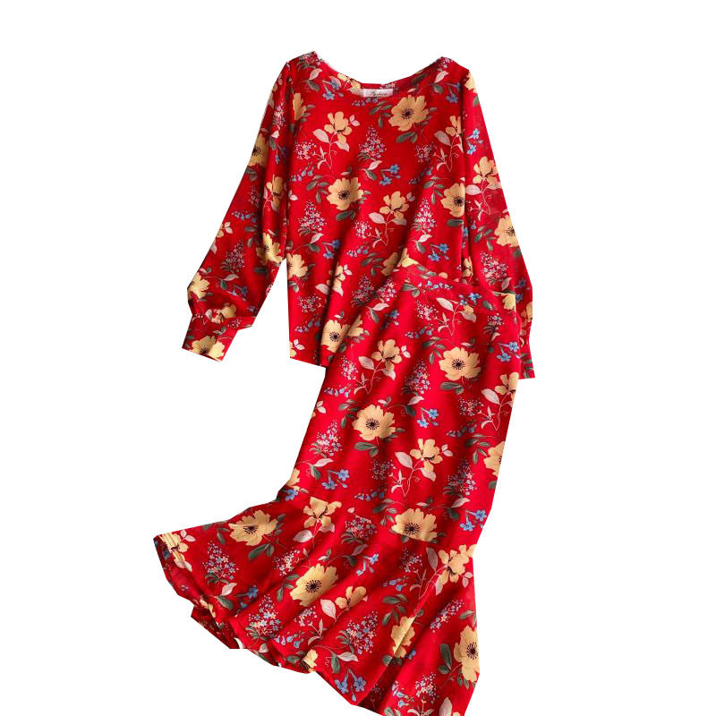 Комплект с круглым воротником, осенняя юбка, шифоновый лонгслив, высокая талия, крой «рыбий хвост»