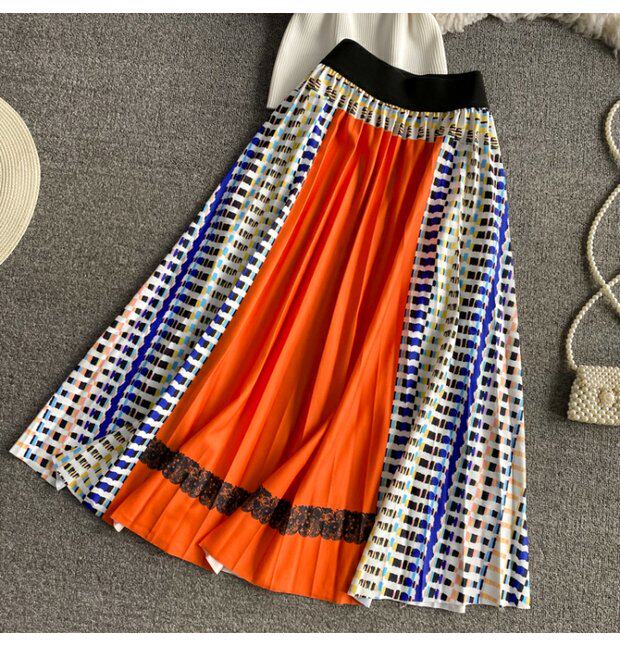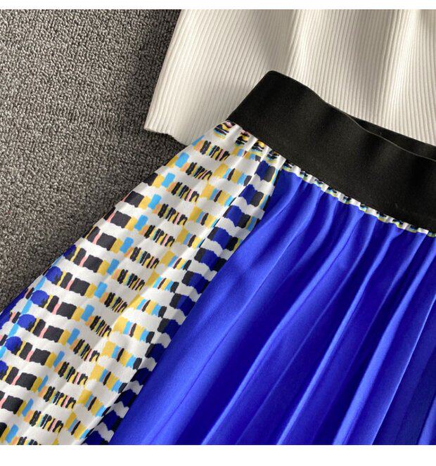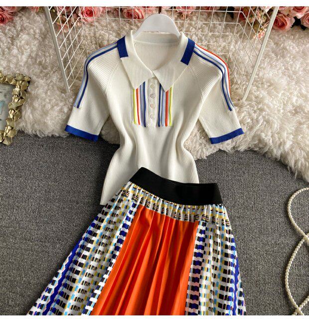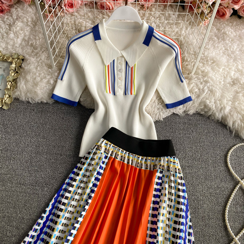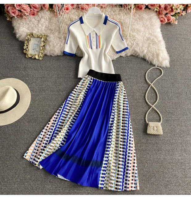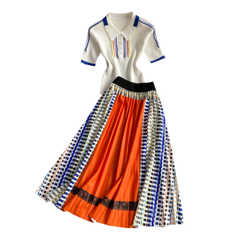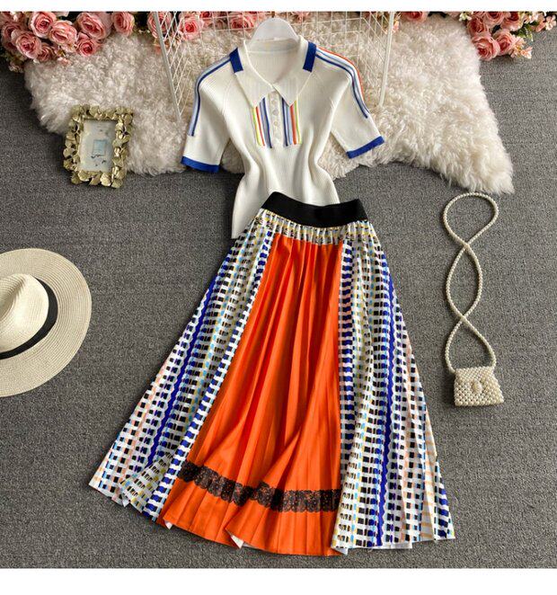 Приталенная длинная юбка в складку, трикотажный комплект, А-силуэт, средней длины, воротник поло