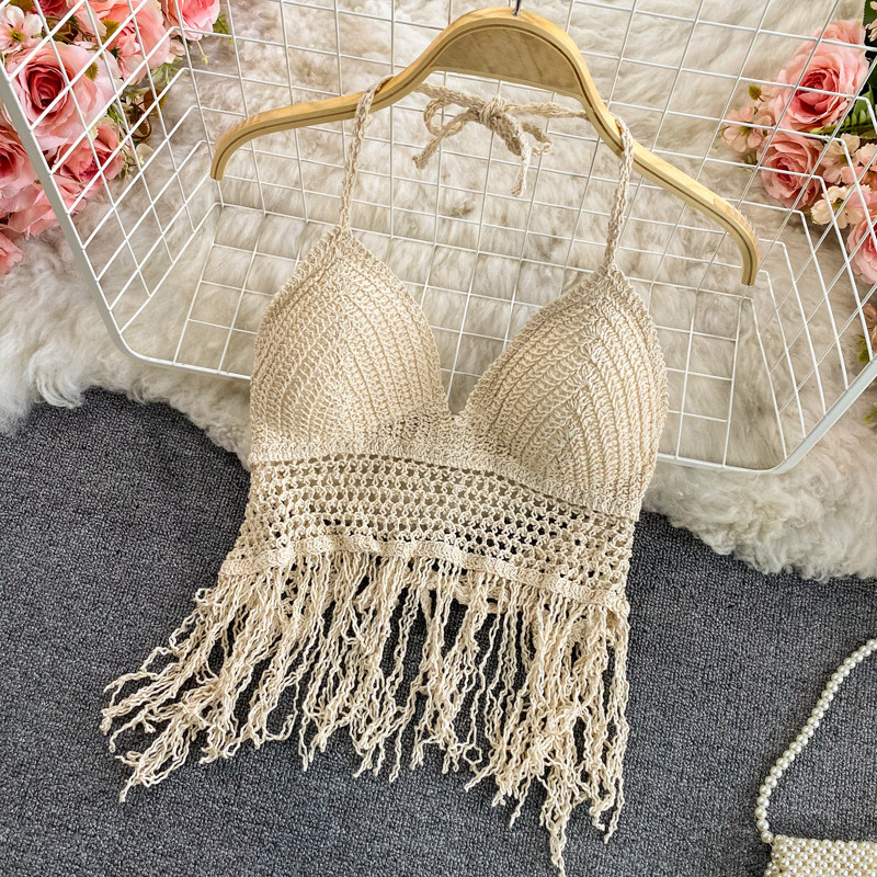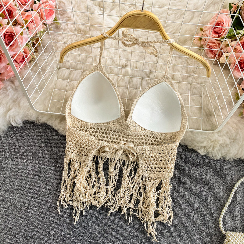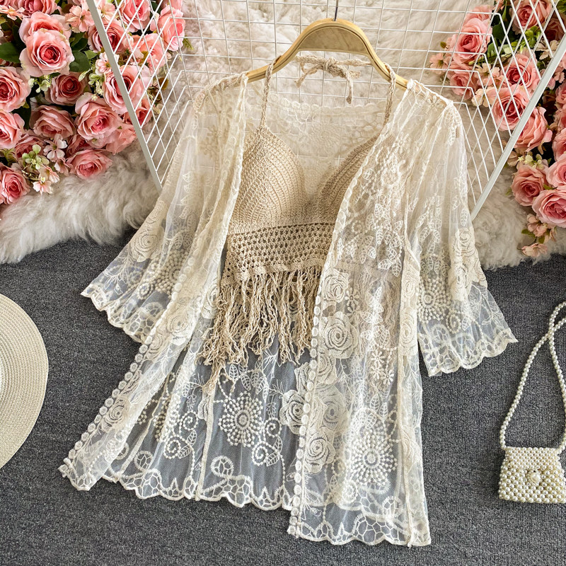 Бюстгальтер-топ с кисточками, кружевной топ с чашечками, кардиган, шорты, купальник, комплект, высокая талия, 3 предмета