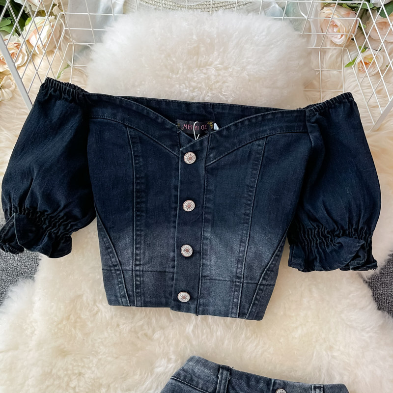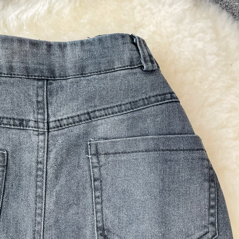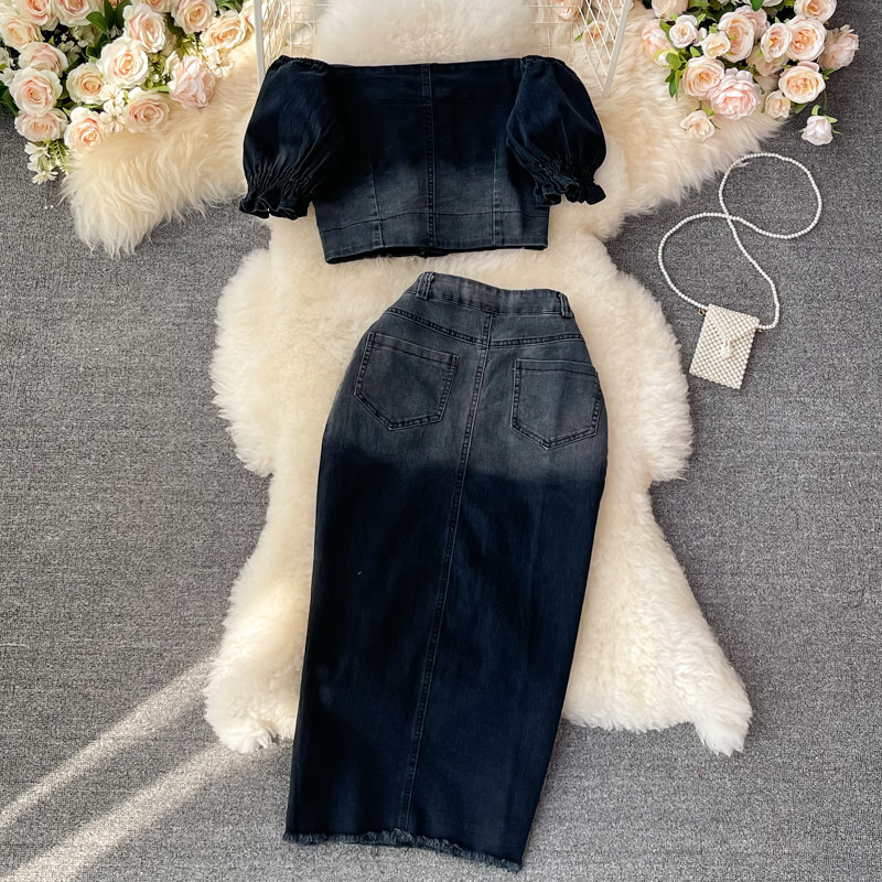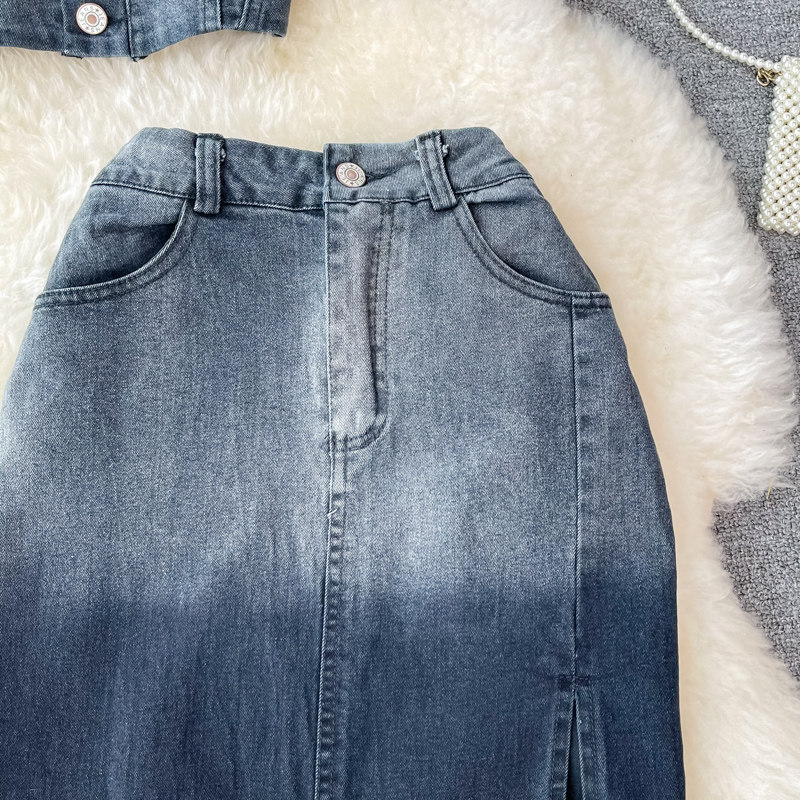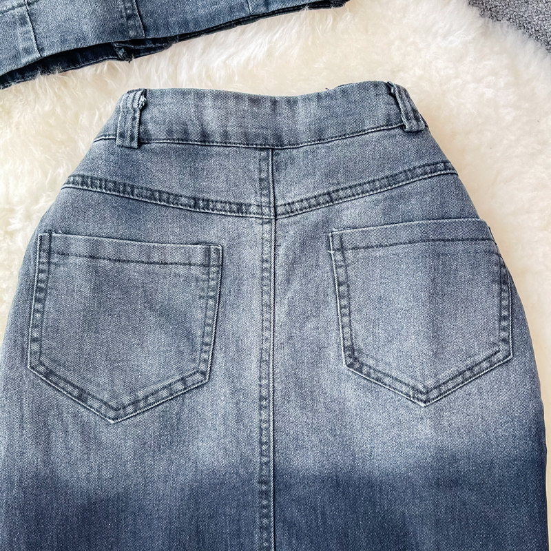 Длинная джинсовая юбка, длинная юбка, короткий комплект, высокая талия, А-силуэт, с акцентом на бедрах