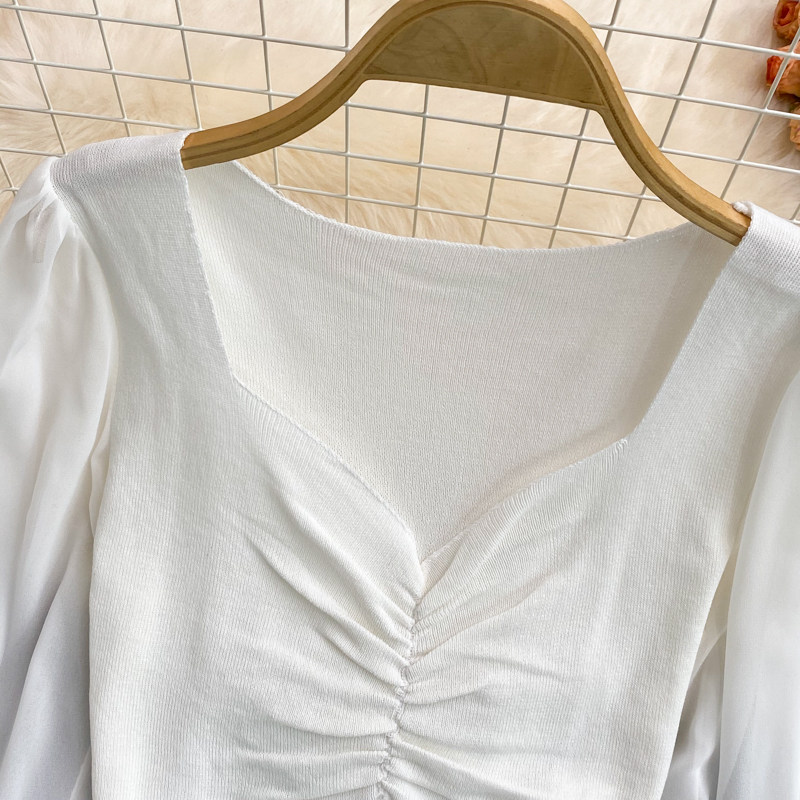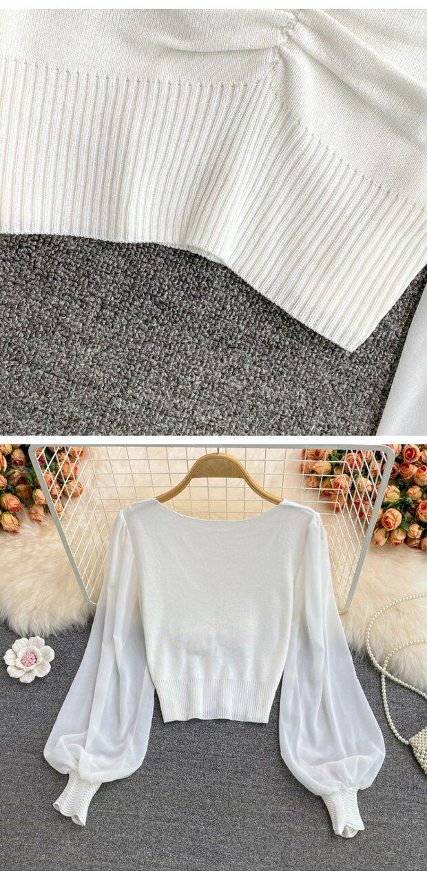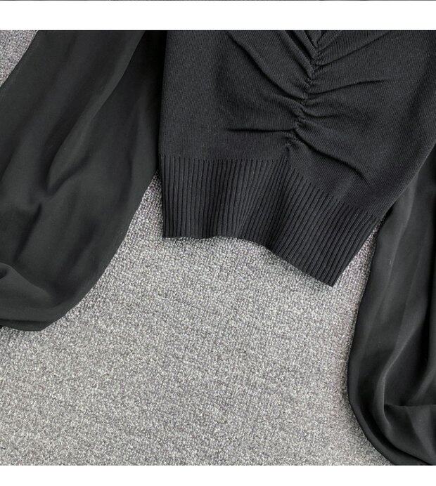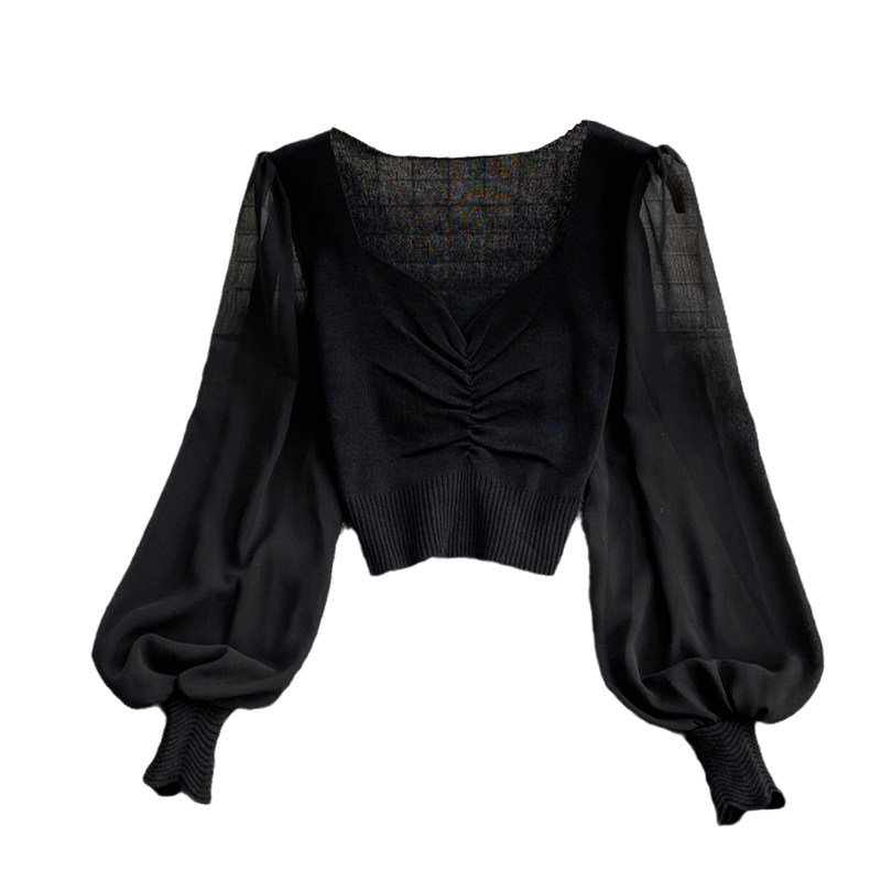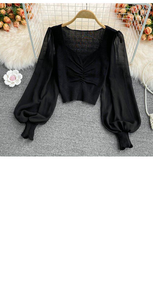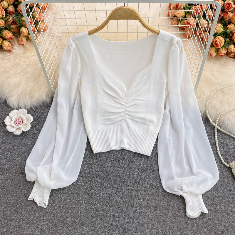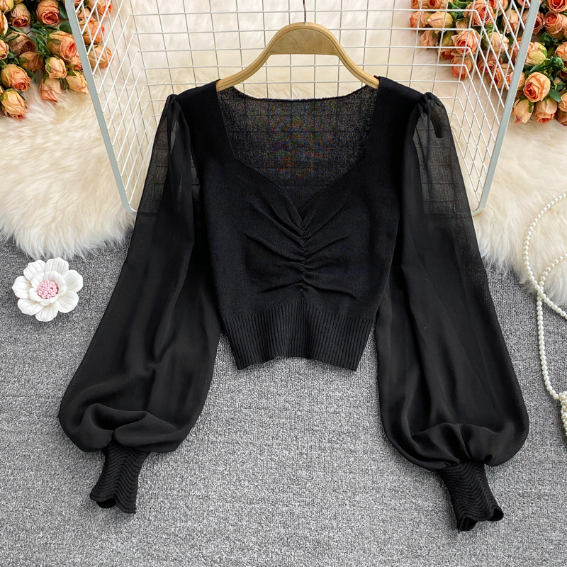Осенний шифоновый трикотажный приталенный короткий базовый приятный телу свитер, в корейском стиле, V-образный вырез, рукава фонарики