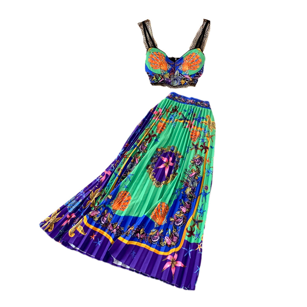 Кружевной комплект, майка, юбка в складку, высокая талия