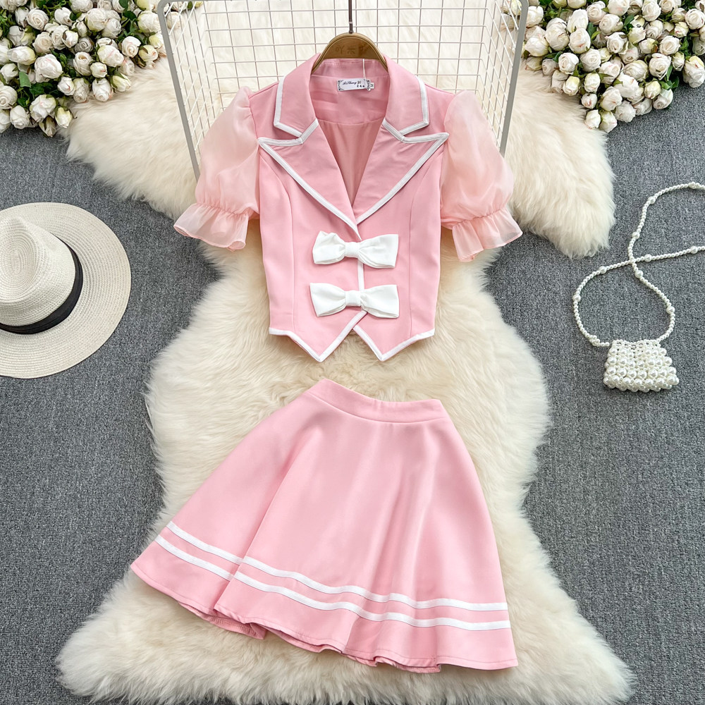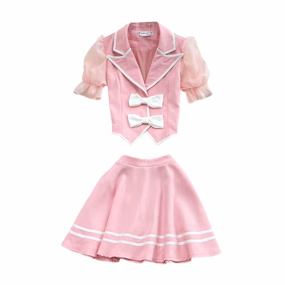 Комплект с бантиком, костюм, корсет, юбка, рукава фонарики, высокая талия