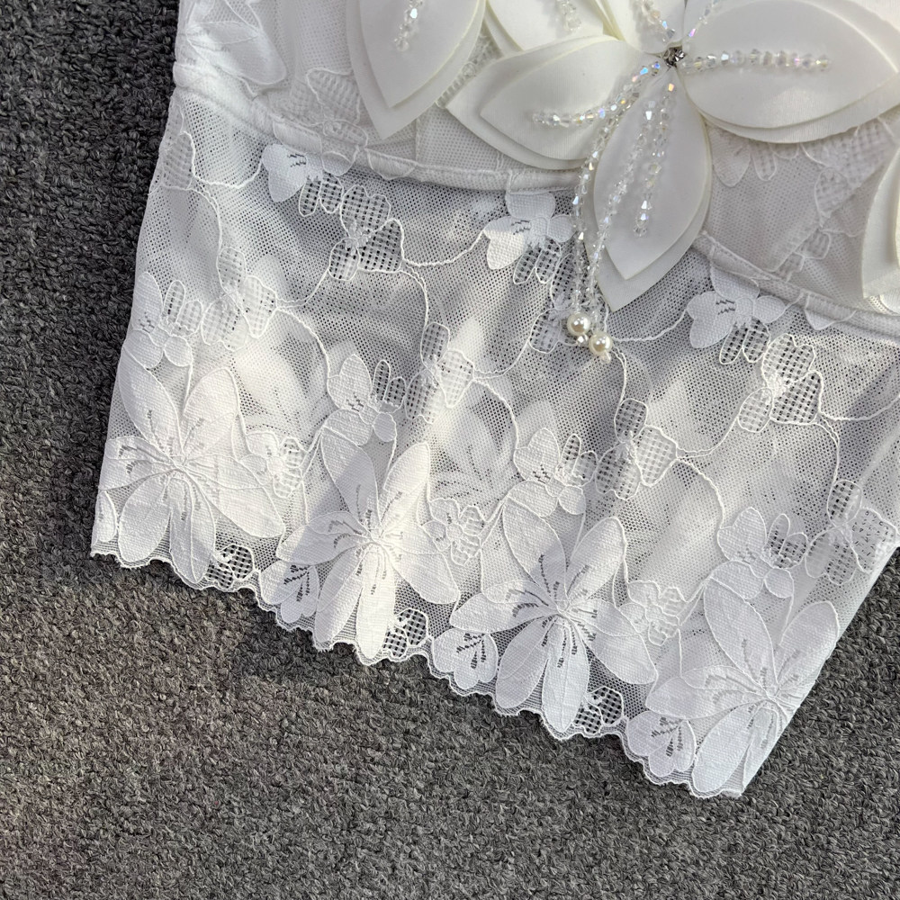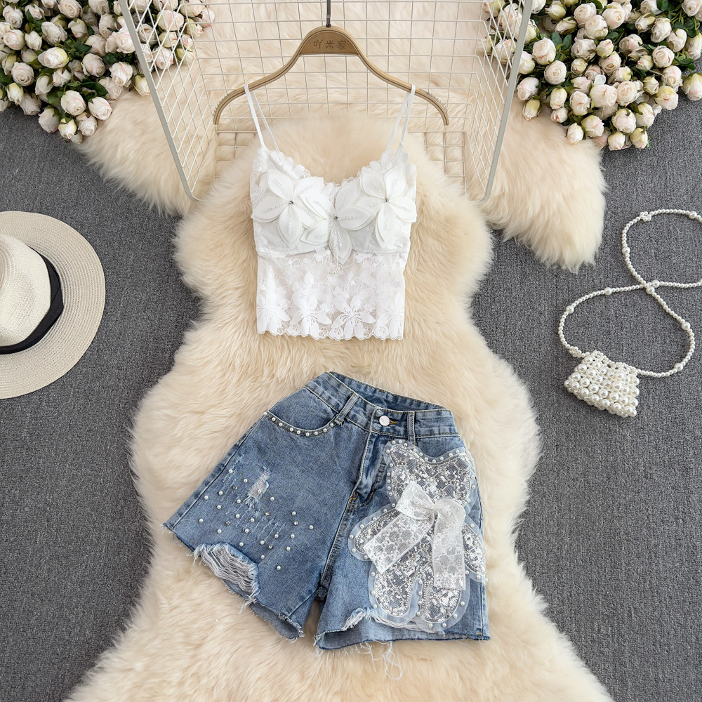Комплект, джинсовая юбка, шорты, штаны, кружевной топ с чашечками, высокая талия, свободный крой, А-силуэт