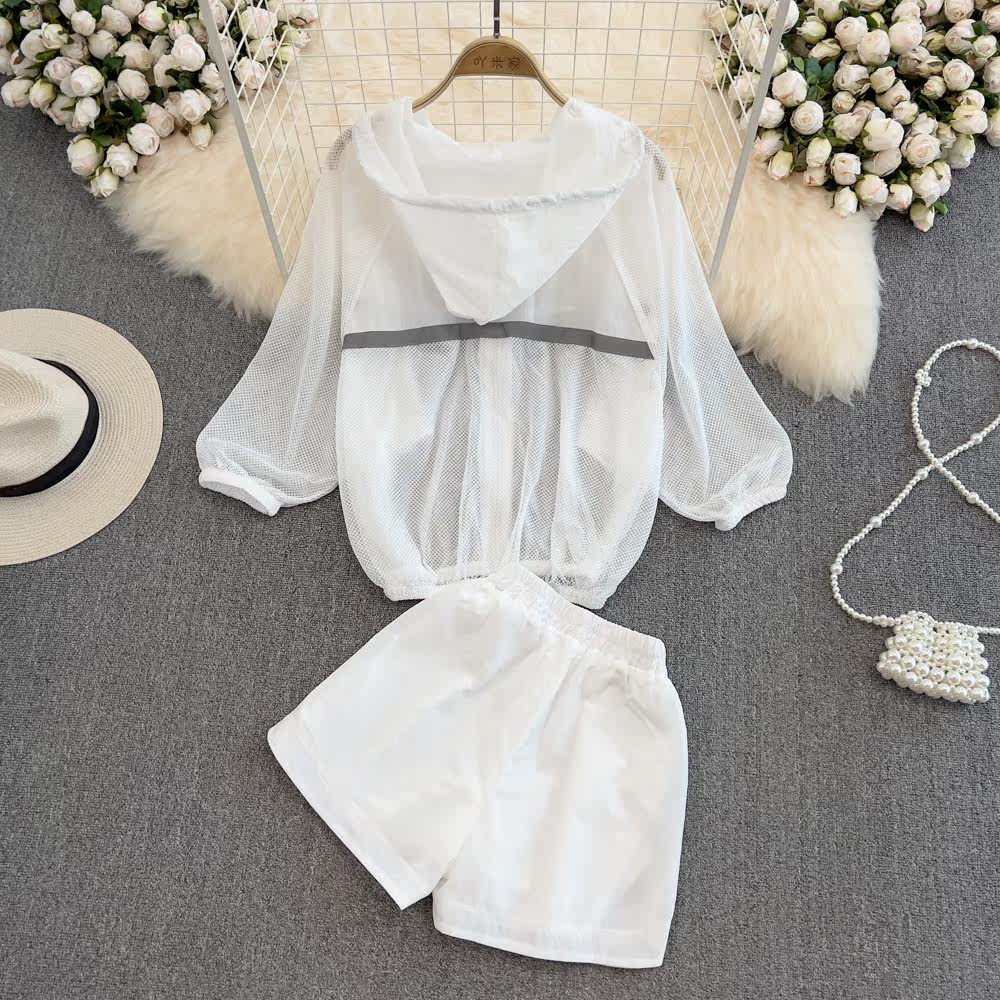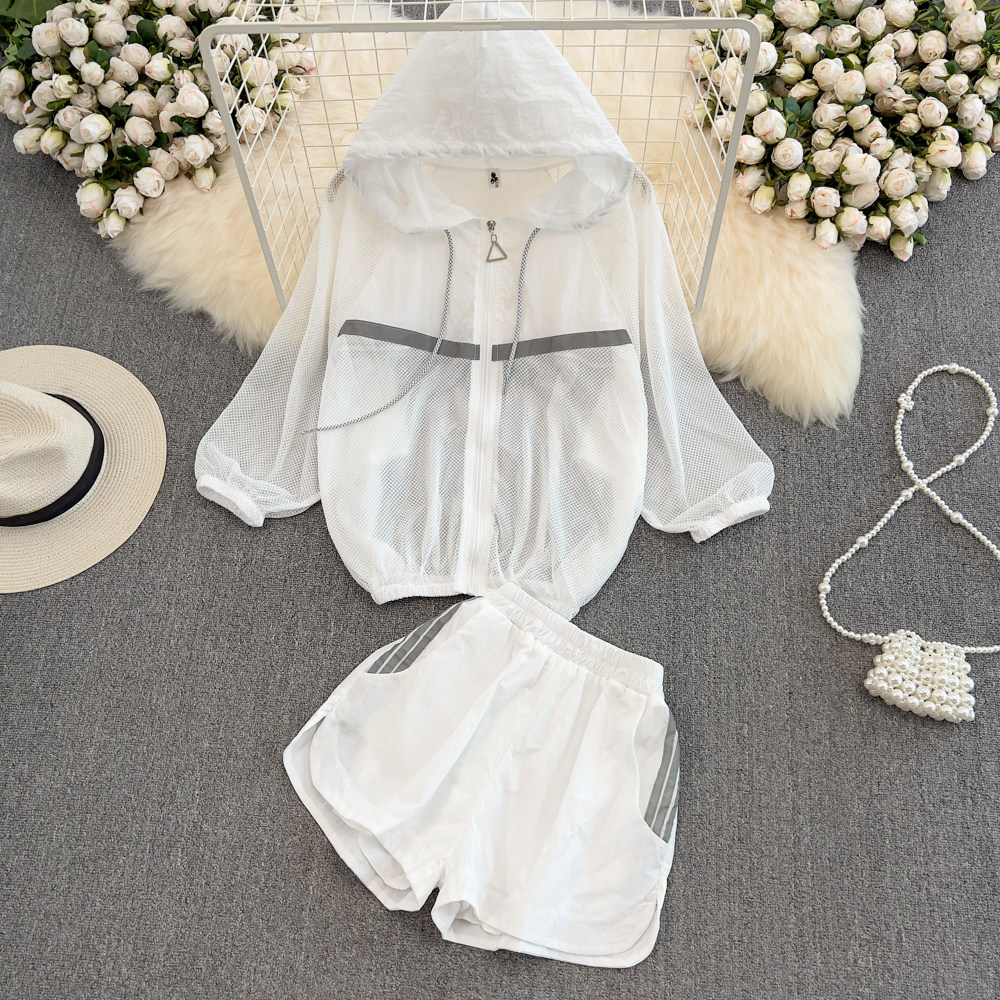 Комплект с молнией с капюшоном, лонгслив, одежда для защиты от солнца, куртка, шорты, штаны, классическая длина, высокая талия