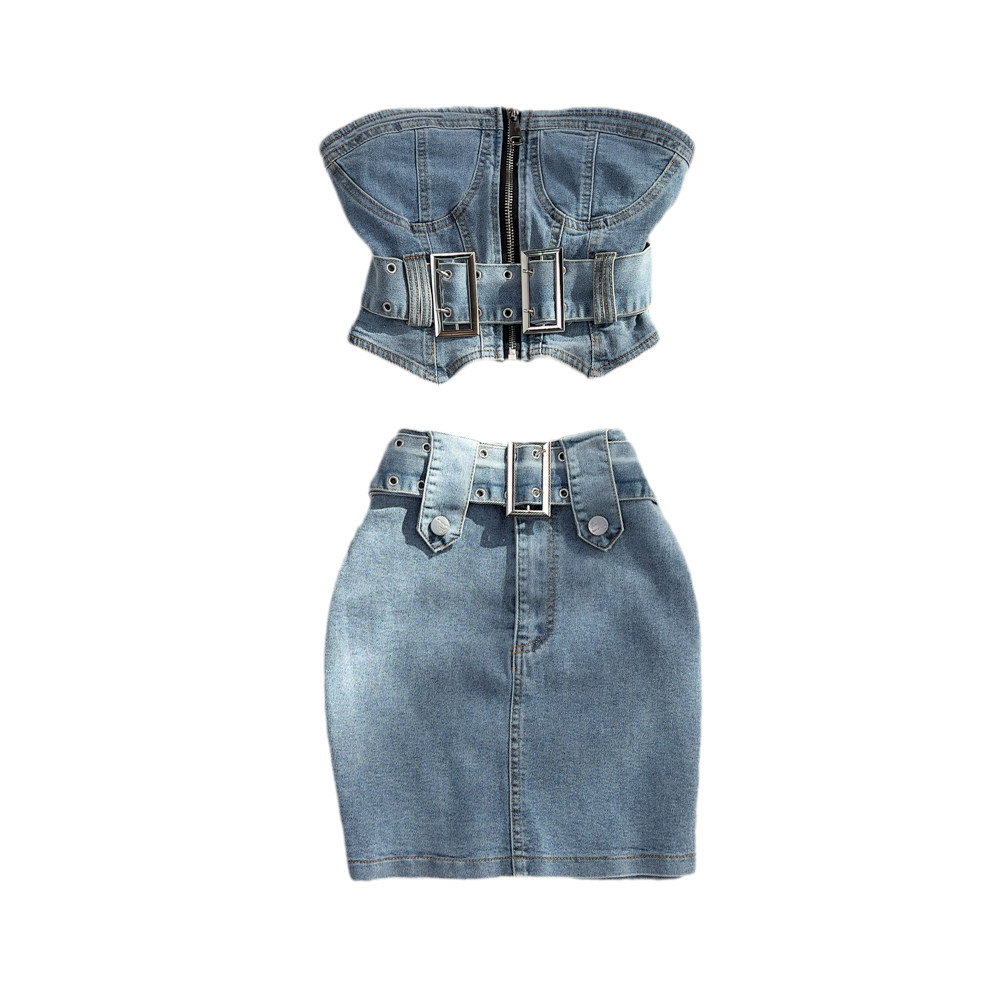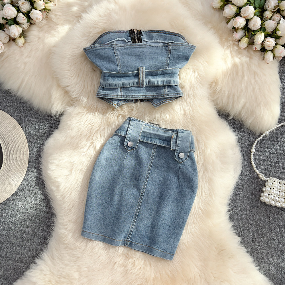 Джинсовый сексуальный комплект, топ без лямок, короткая поясная сумка, юбка, облегающий крой, высокая талия