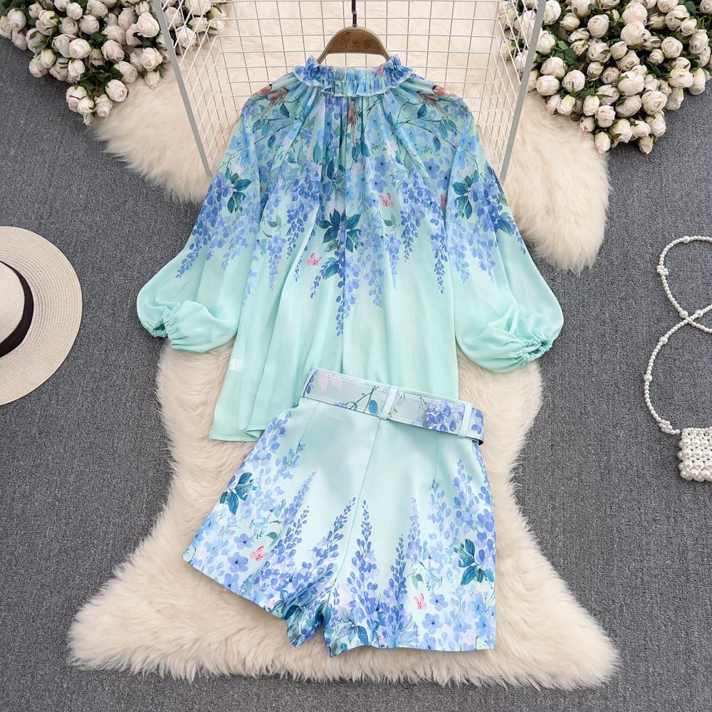 Комплект с круглым воротником с бантиком, фонарь, нарукавники, рубашка, шорты, свободный крой, высокая талия