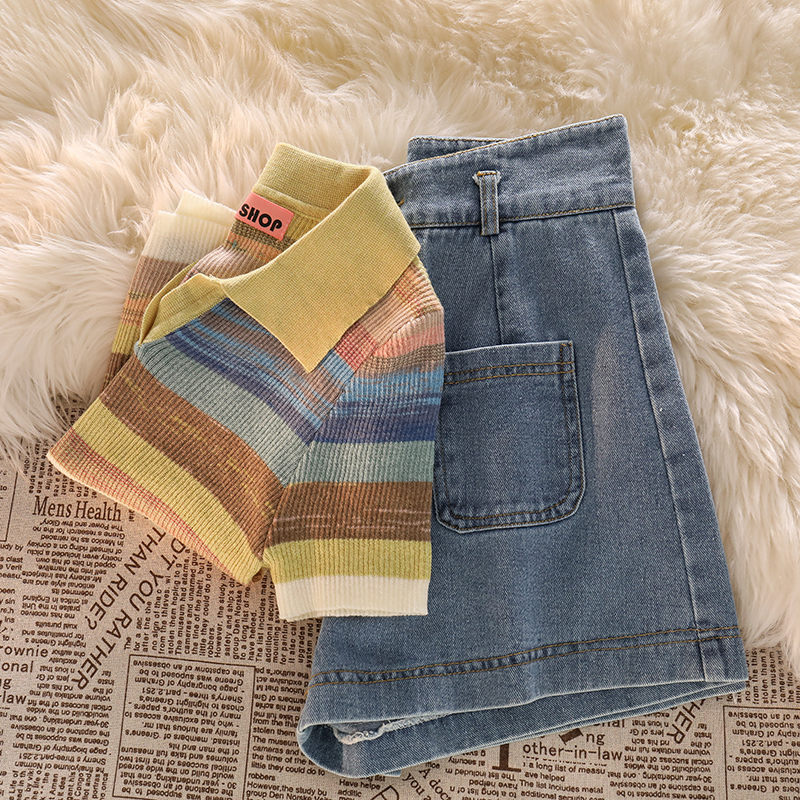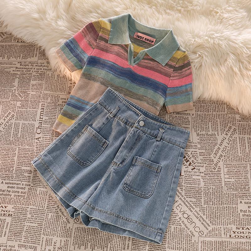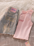 Дизайнерская розовая короткая майка топ, джинсовая юбка, шорты, комплект, тренд сезона, высокая талия