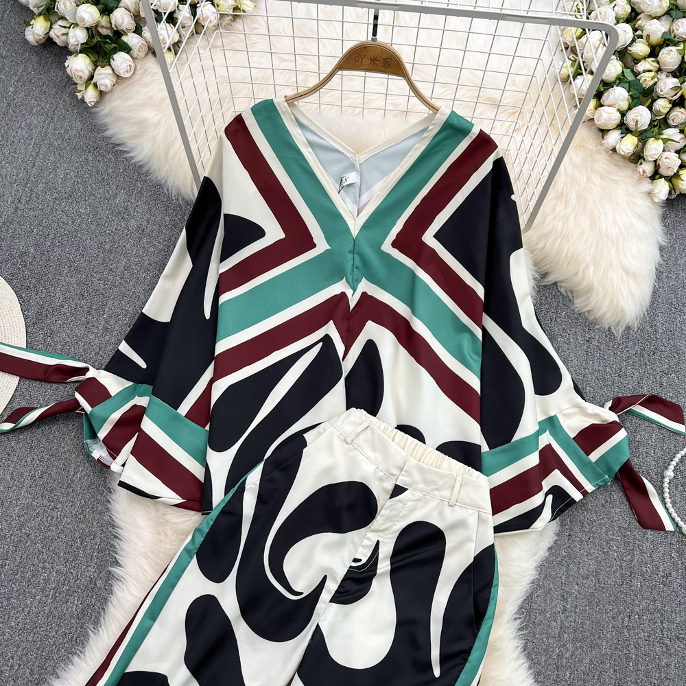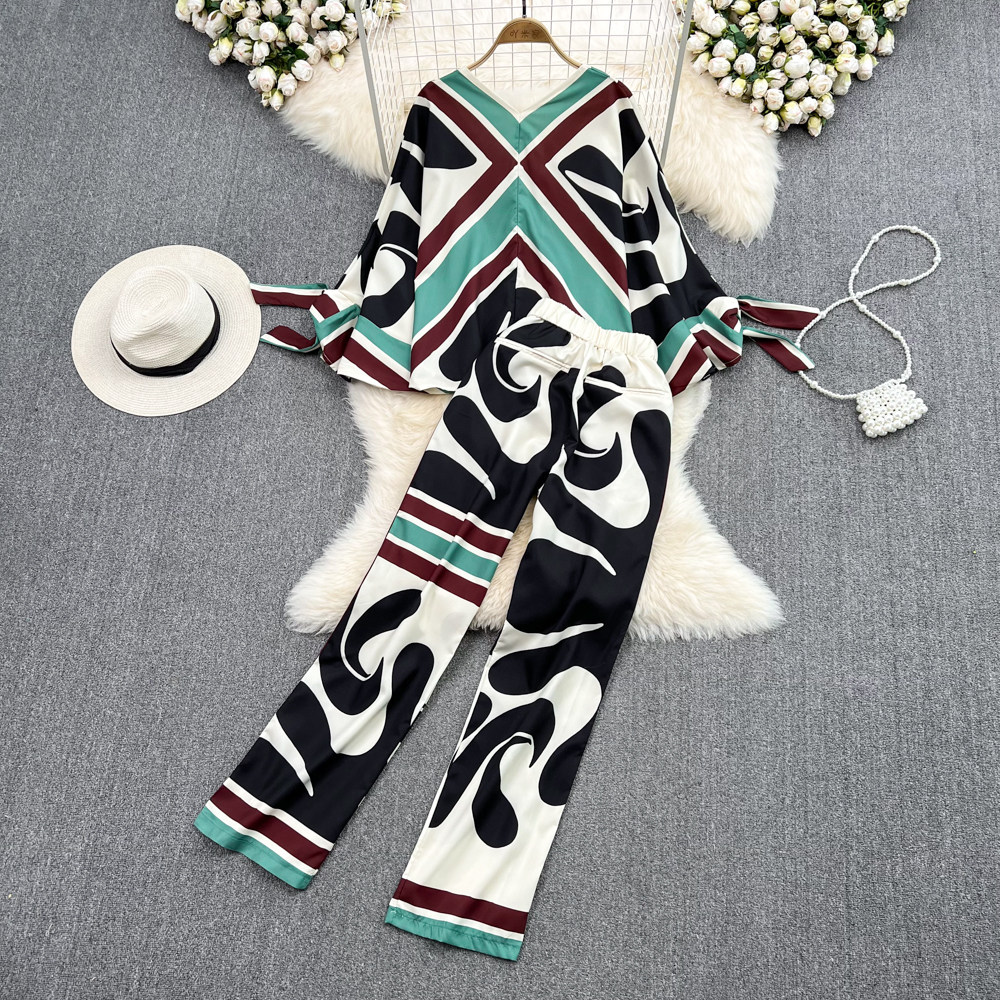 Комплект, мегафон, лонгслив, штаны, европейский стиль, V-образный вырез, высокая талия, свободный прямой крой