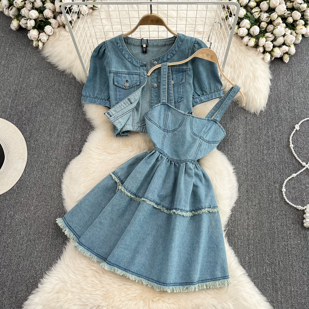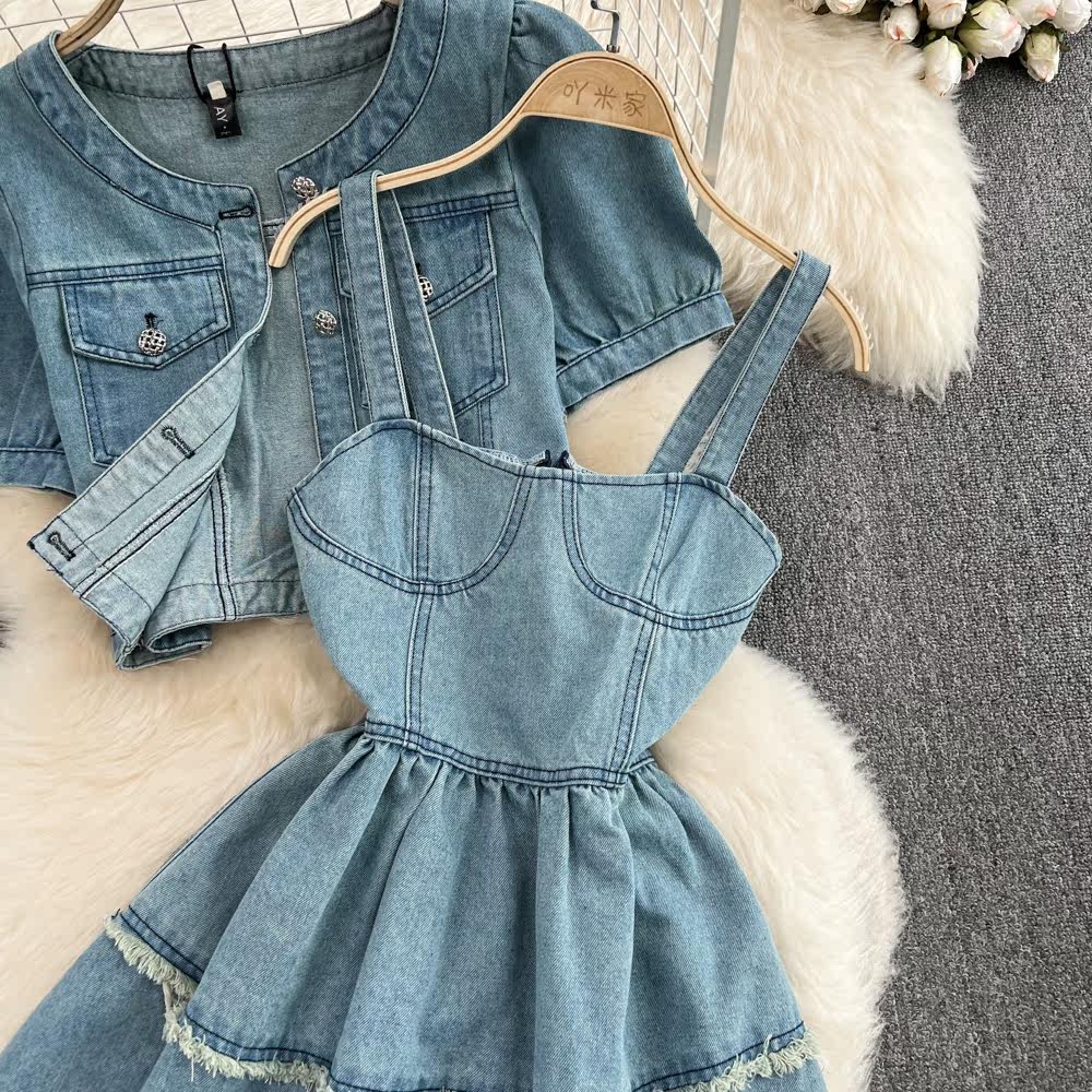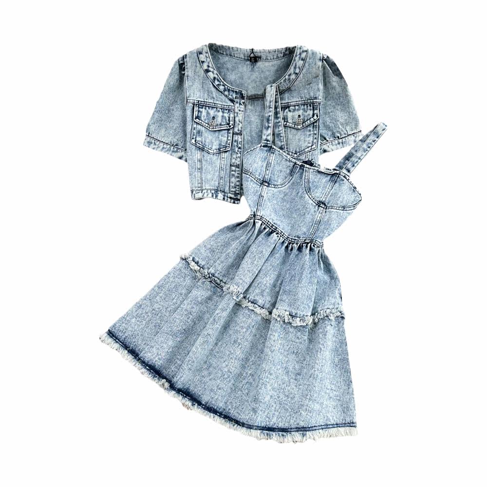 Сексуальный комплект, платье с круглым воротником, джинсовый кардиган, эффект подтяжки