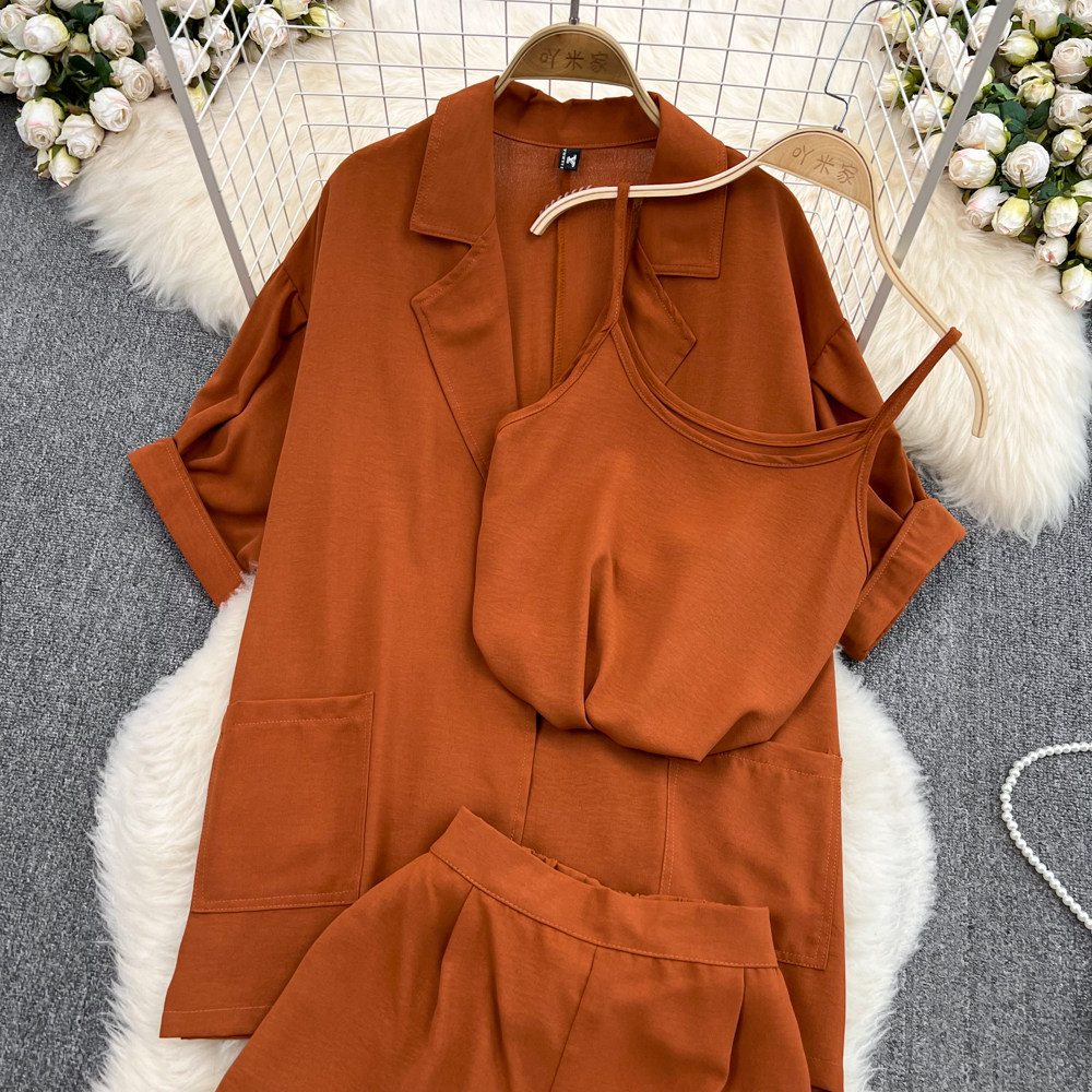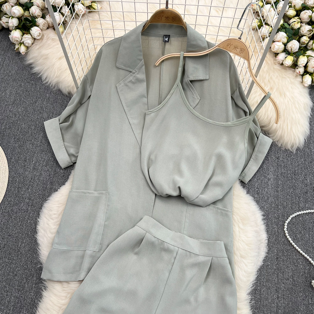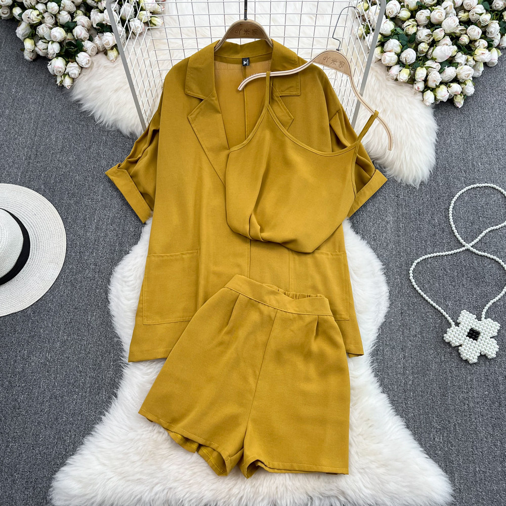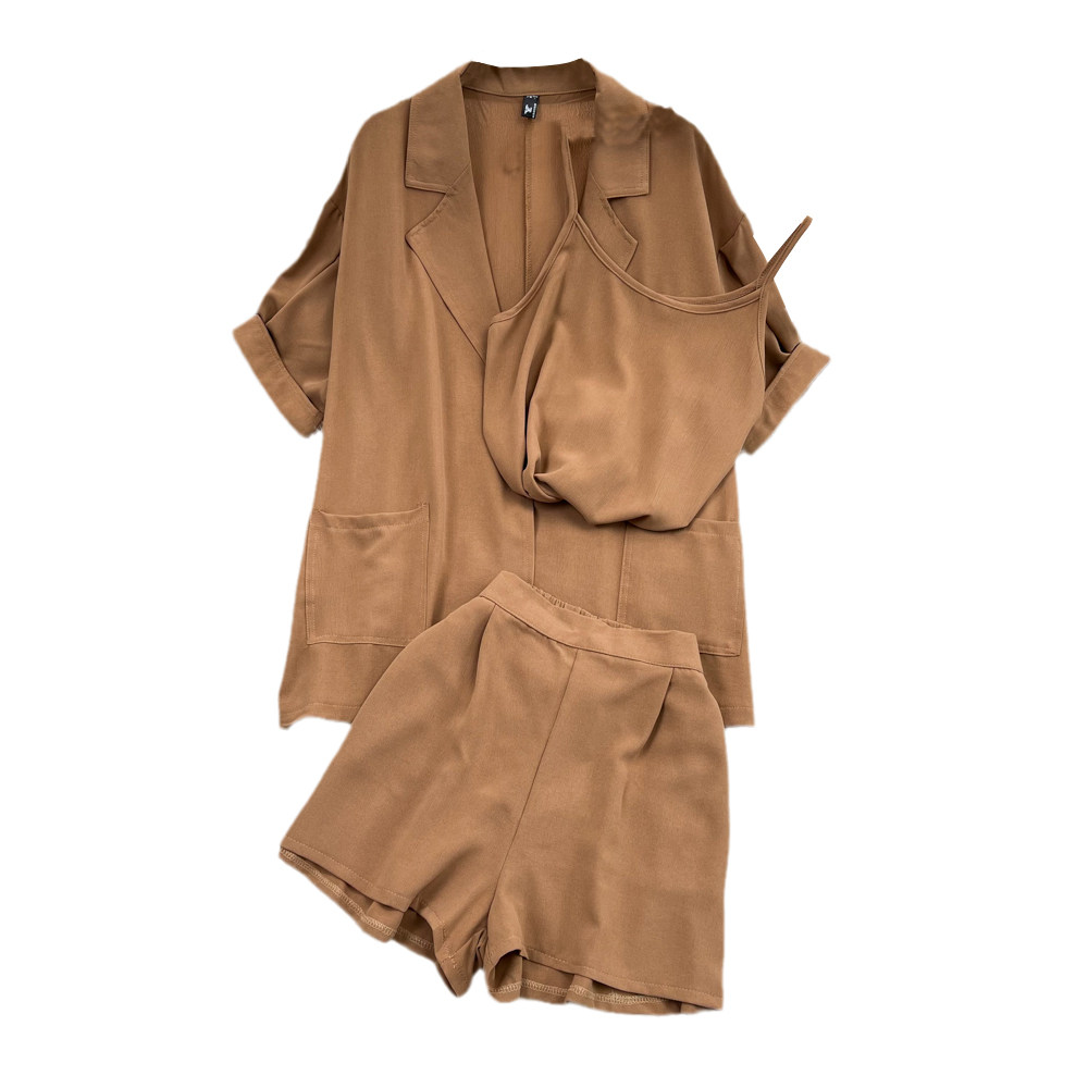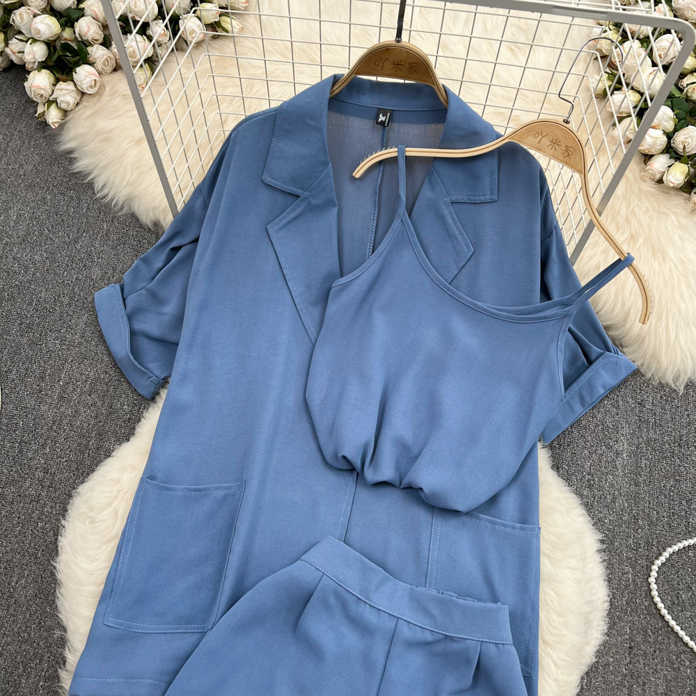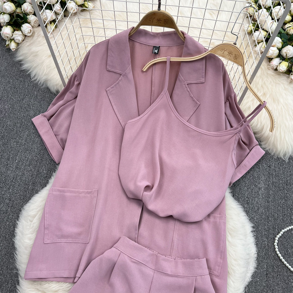 Комплект, длинный пиджак классического кроя, рубашка, топ с чашечками, шорты, штаны, средней длины, 3 предмета, высокая талия