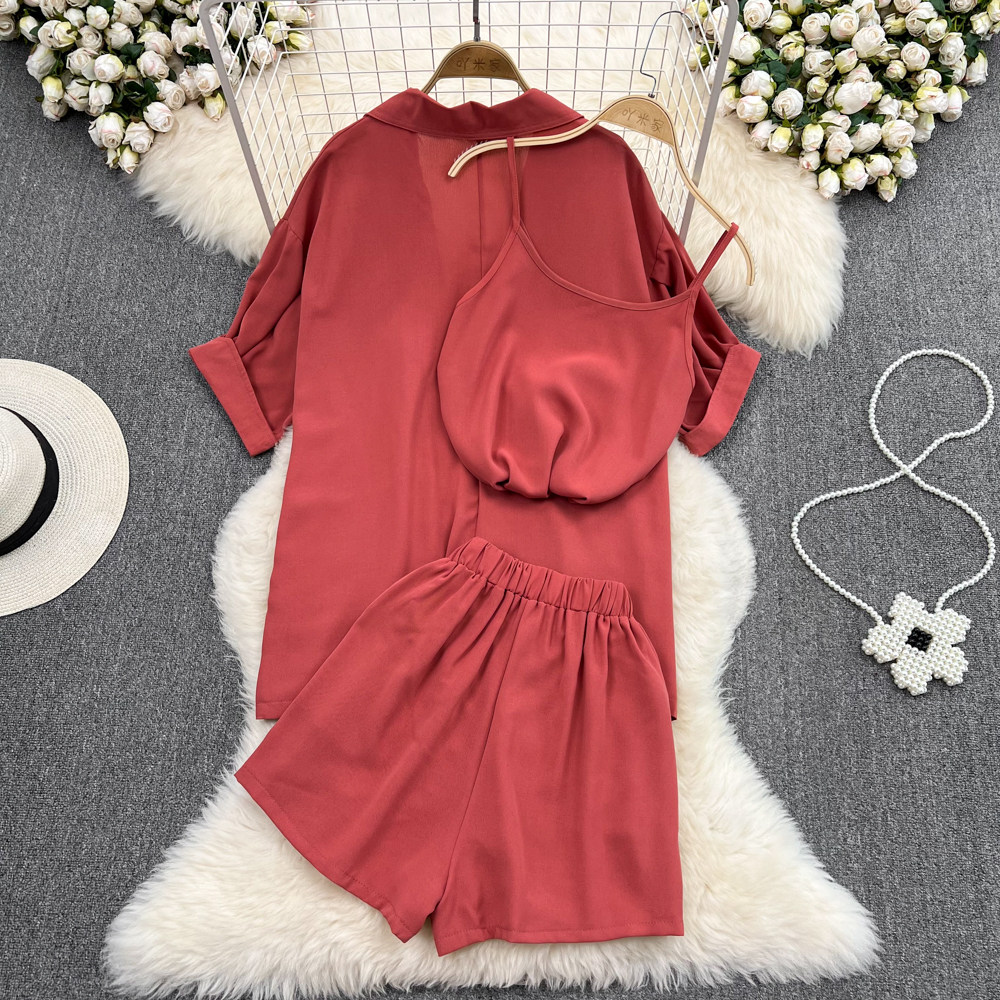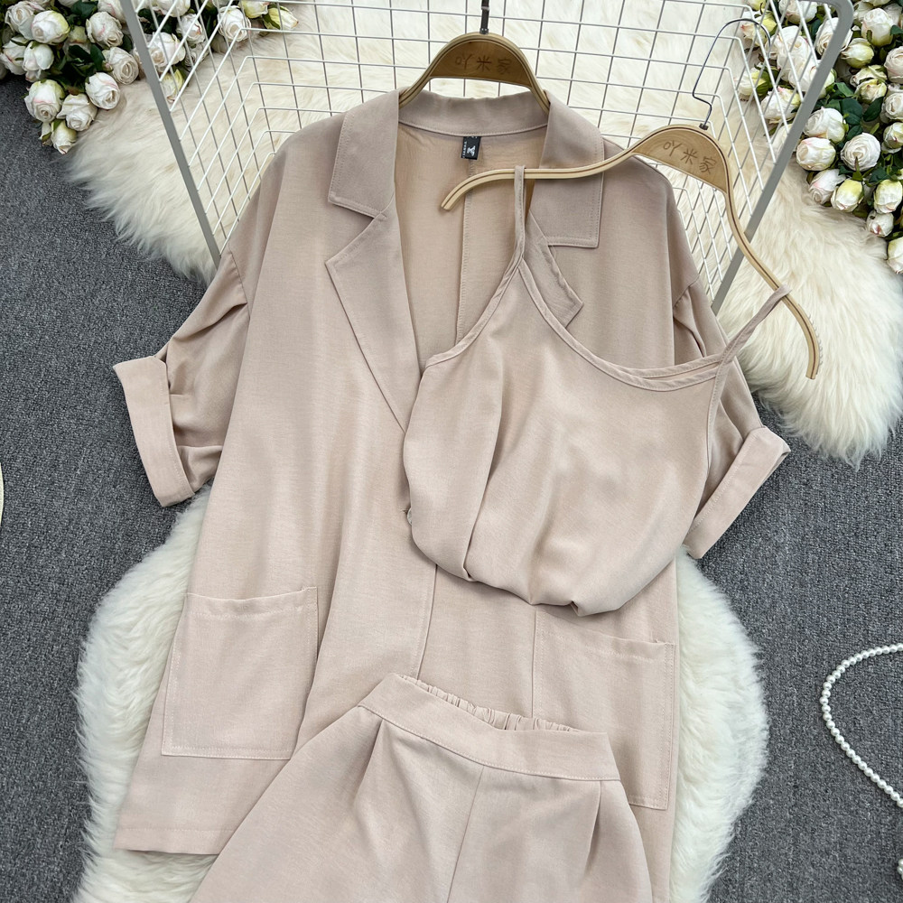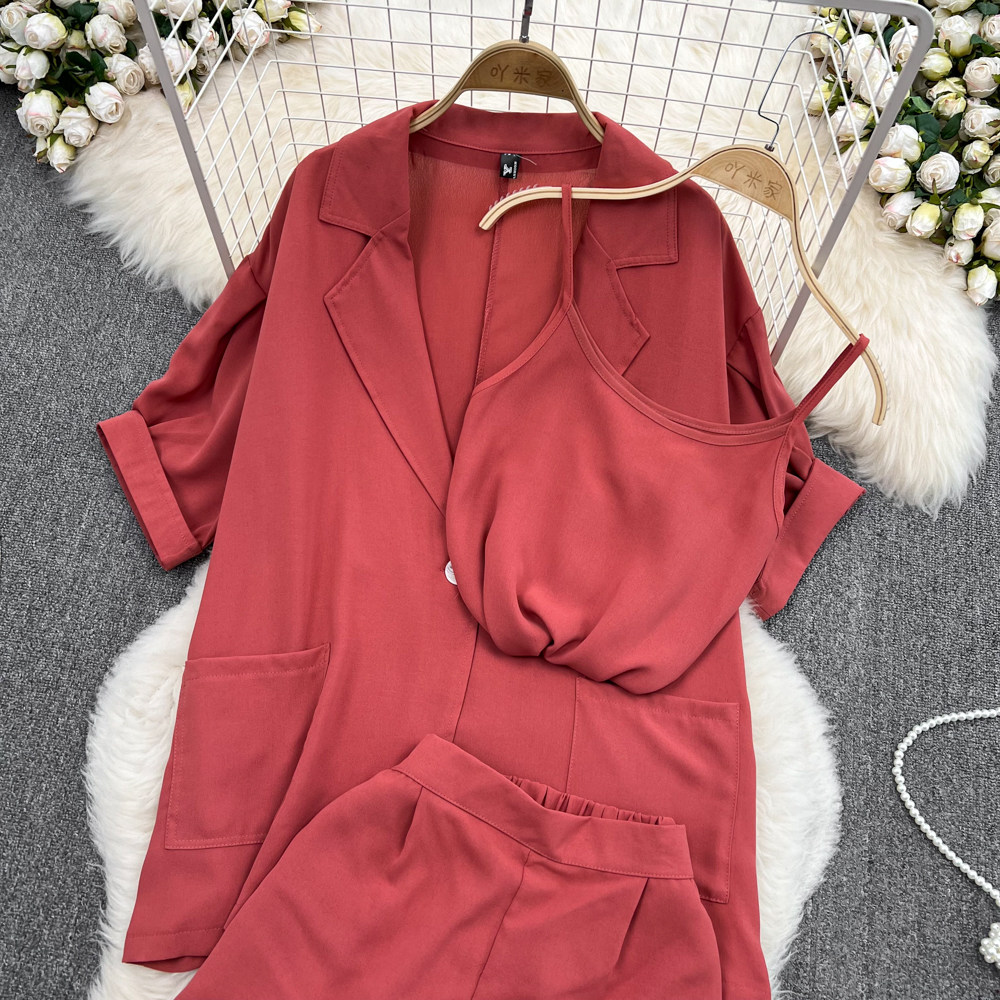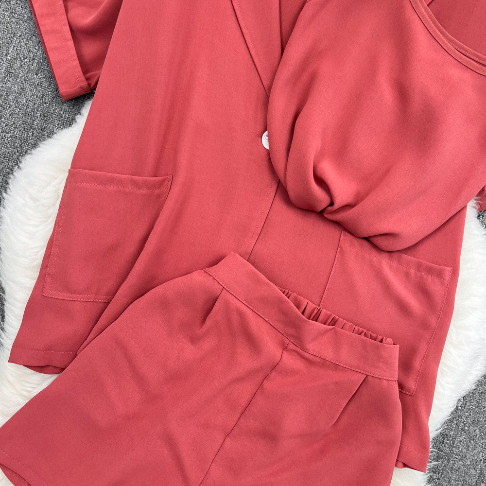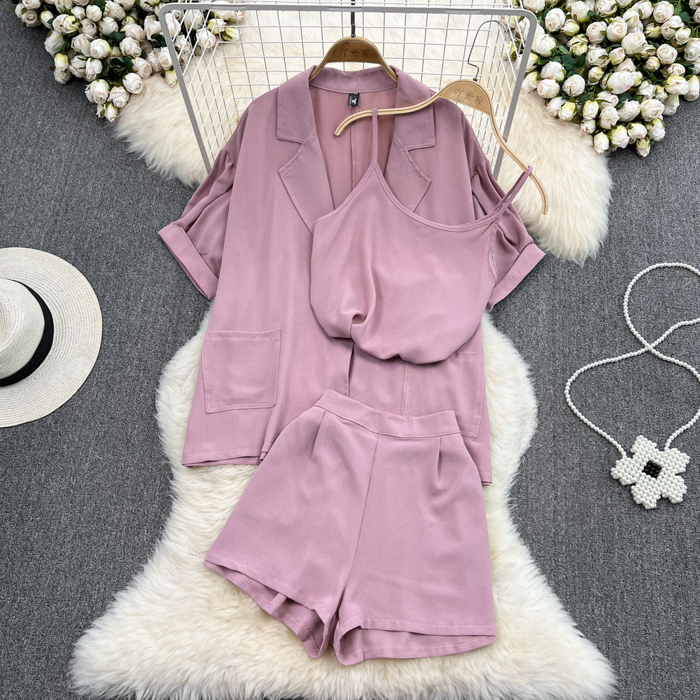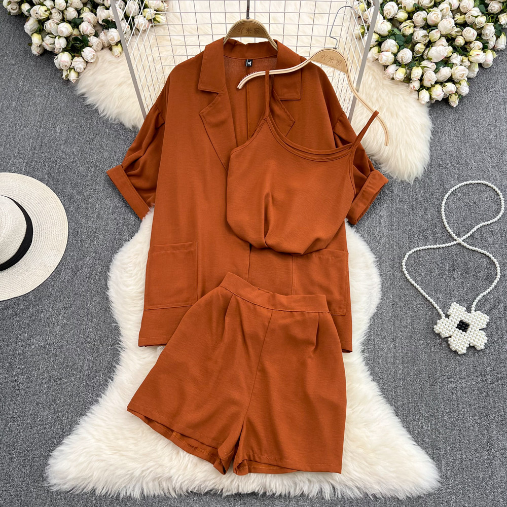 Комплект, длинный пиджак классического кроя, рубашка, топ с чашечками, шорты, штаны, средней длины, 3 предмета, высокая талия