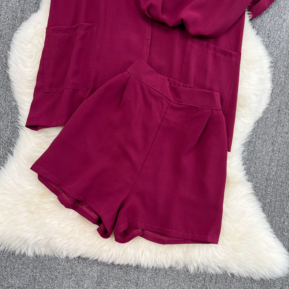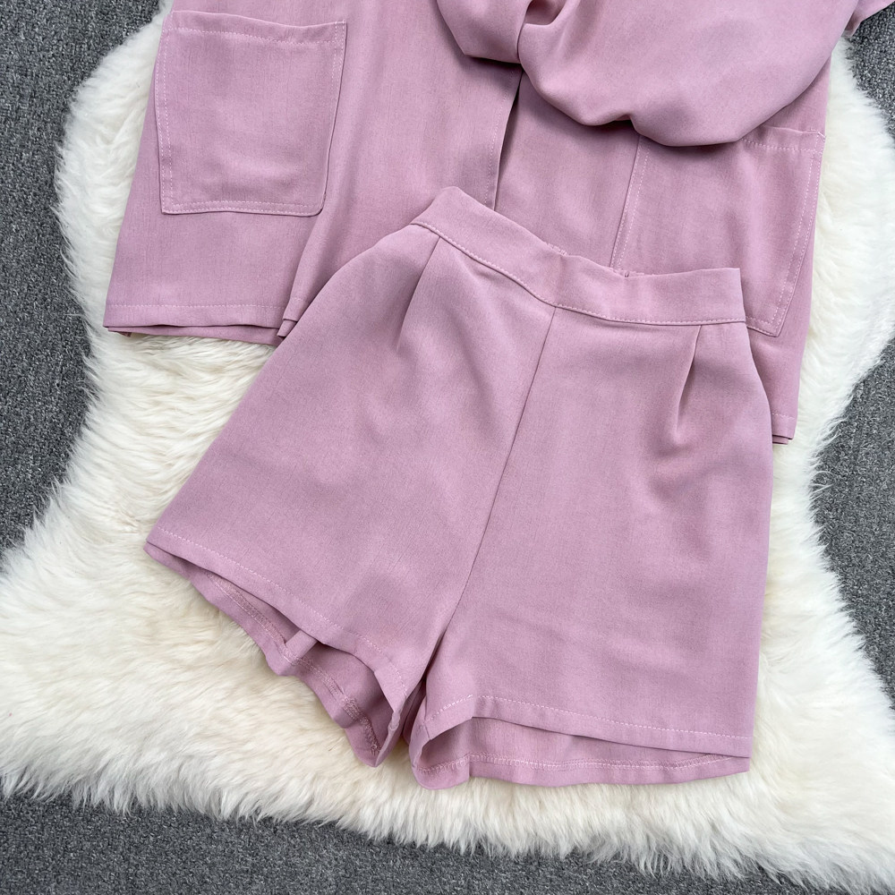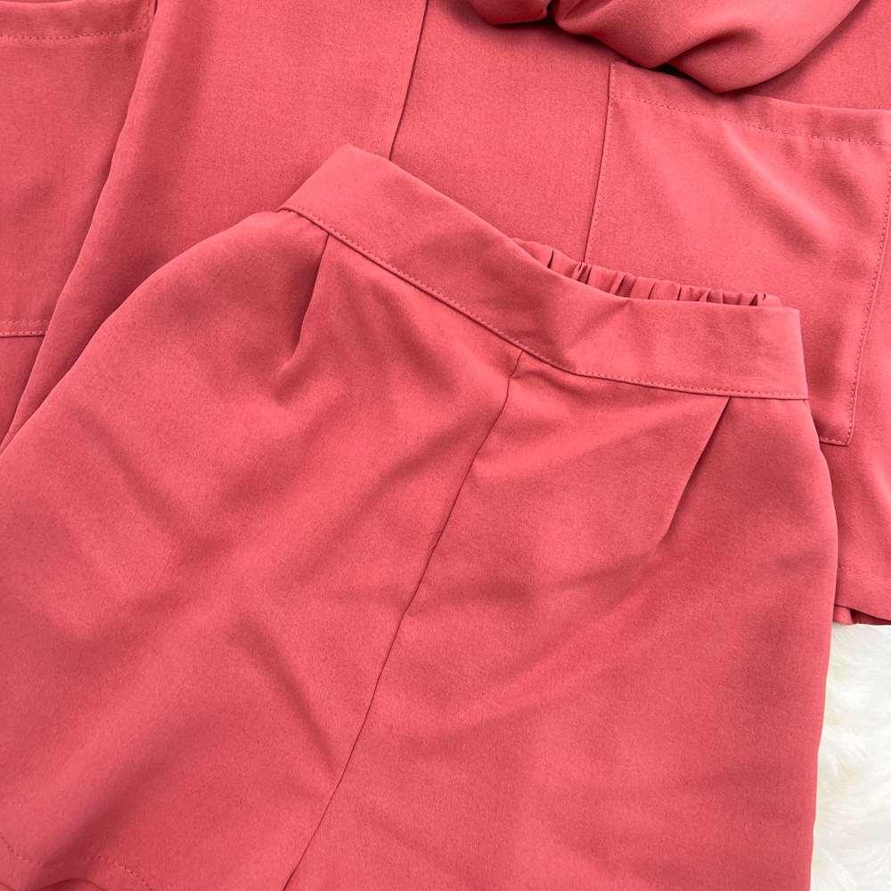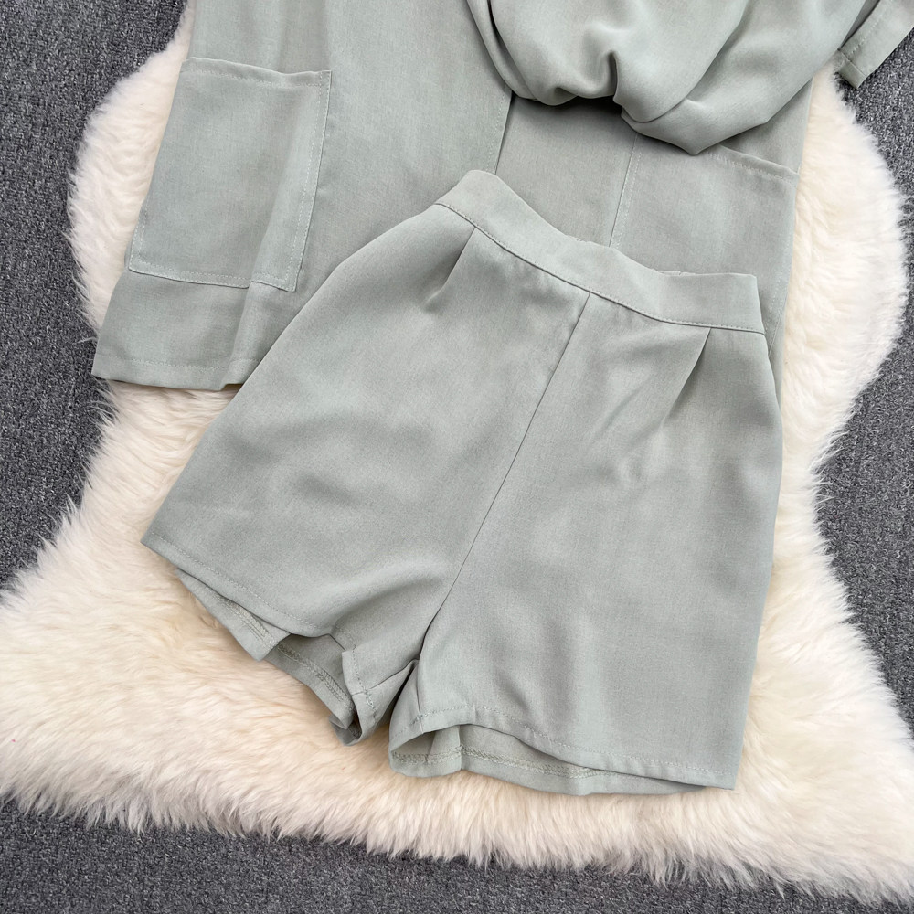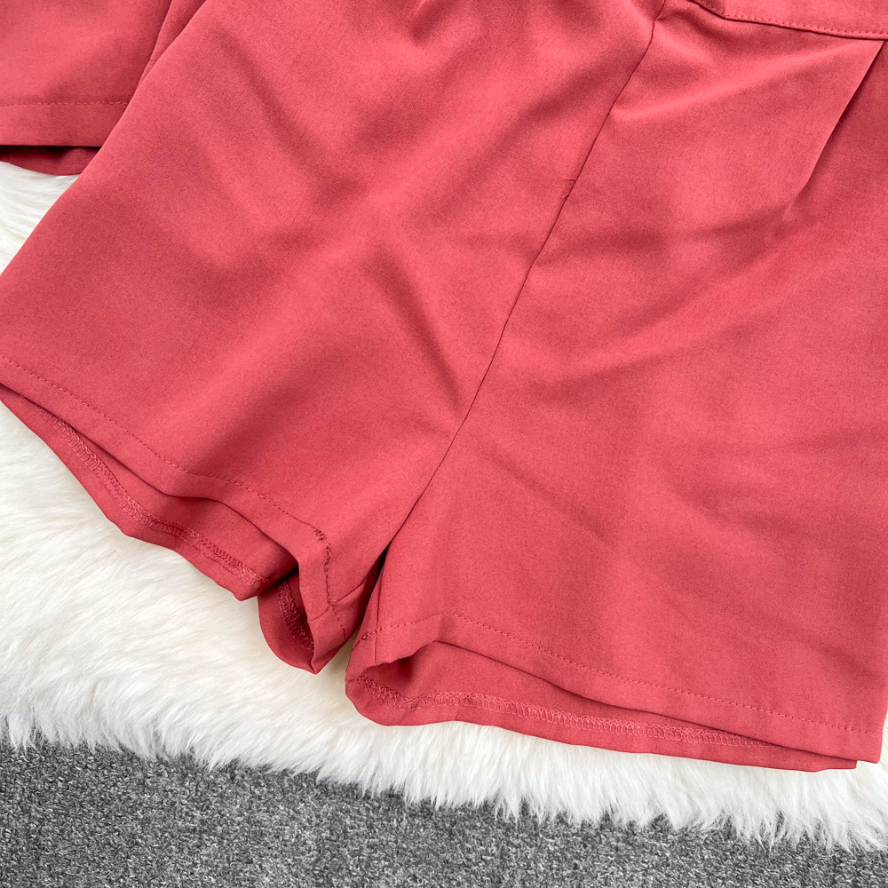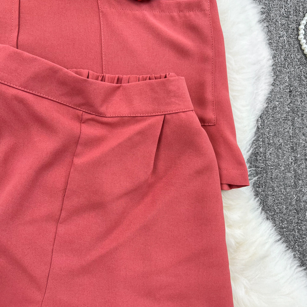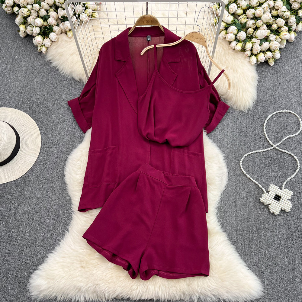 Комплект, длинный пиджак классического кроя, рубашка, топ с чашечками, шорты, штаны, средней длины, 3 предмета, высокая талия