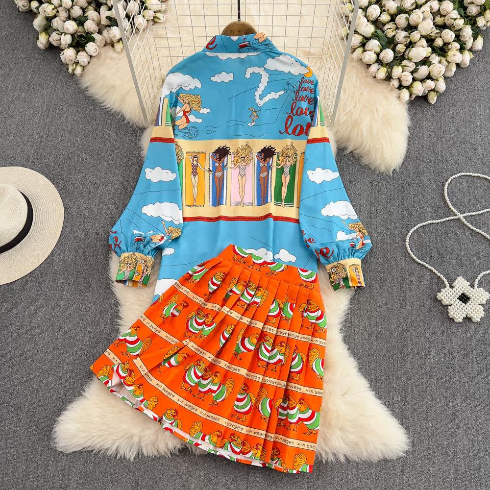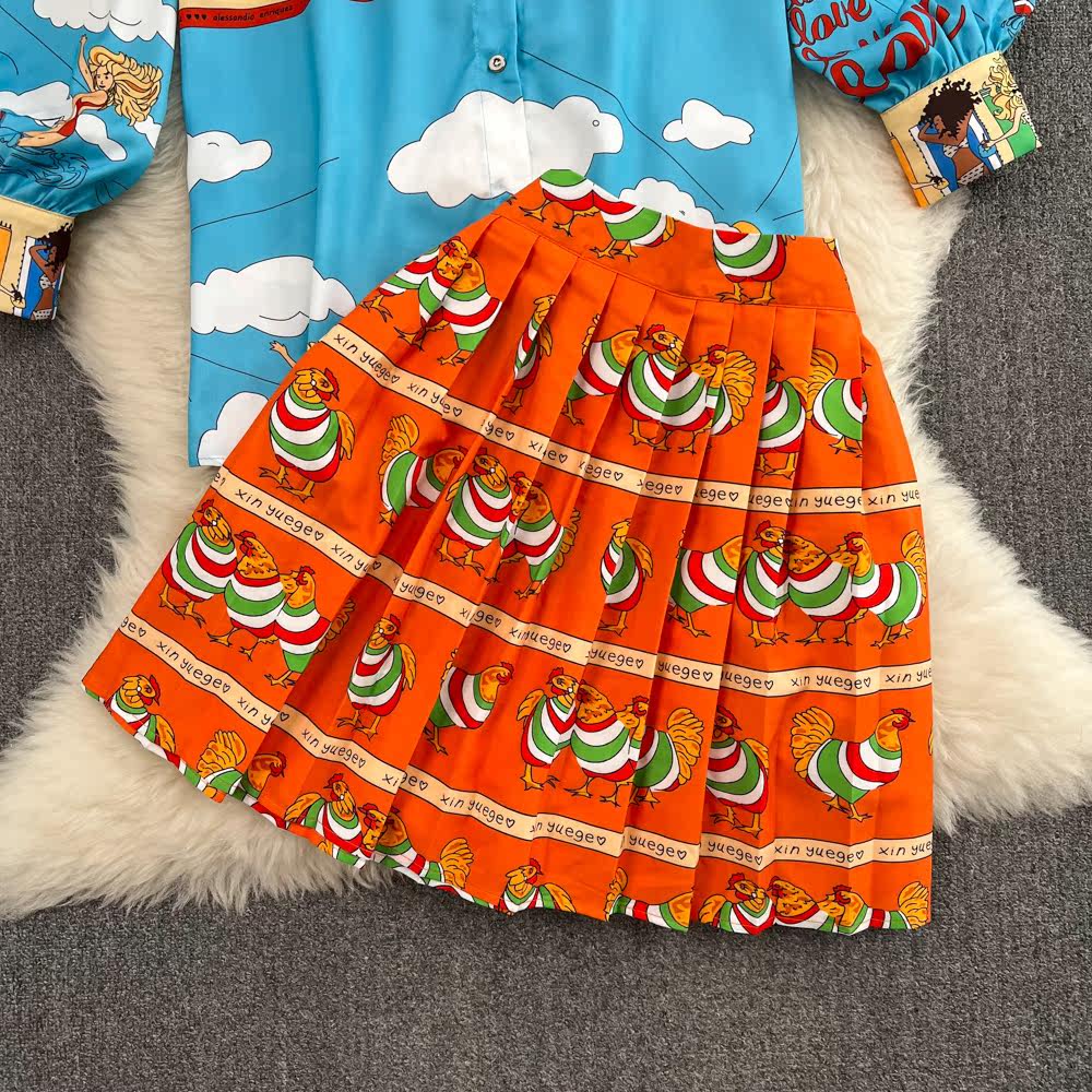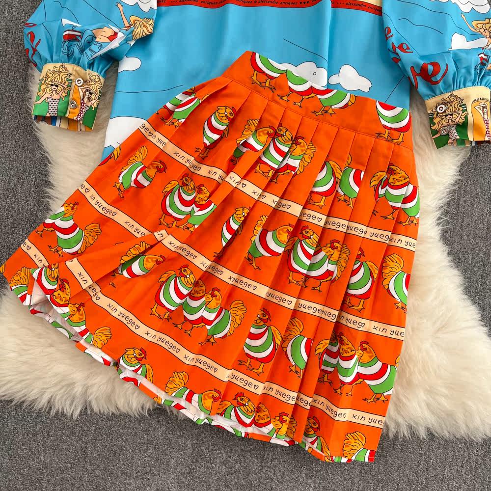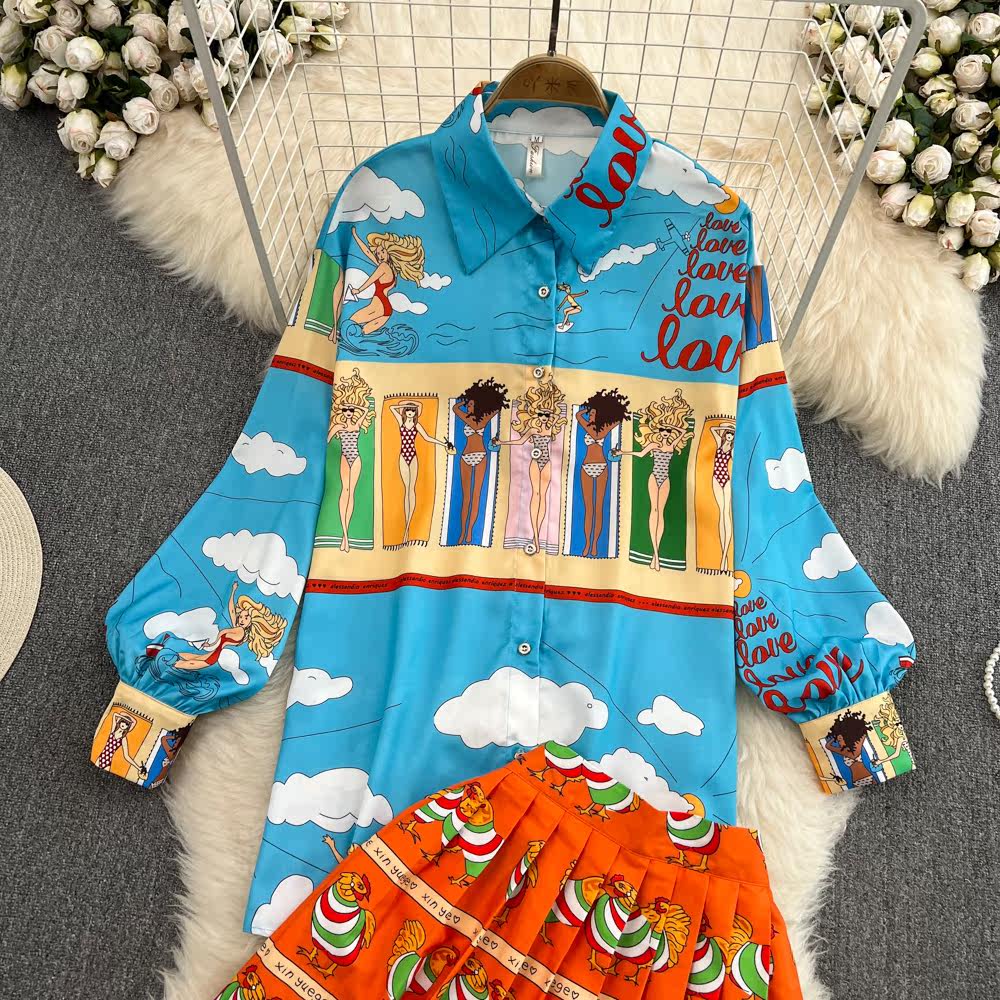 Комплект, лонгслив, фонарь, рубашка, юбка в складку, европейский стиль, свободный крой, высокая талия