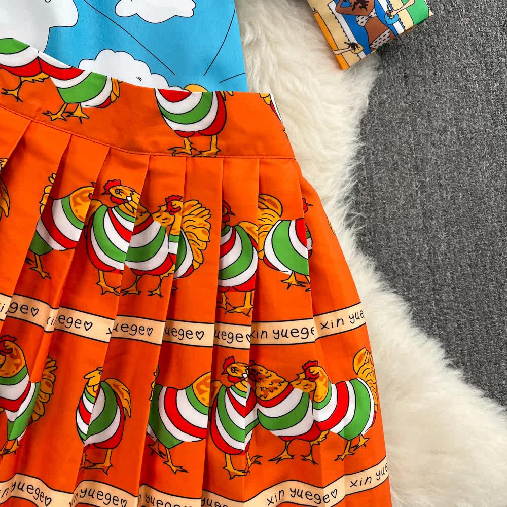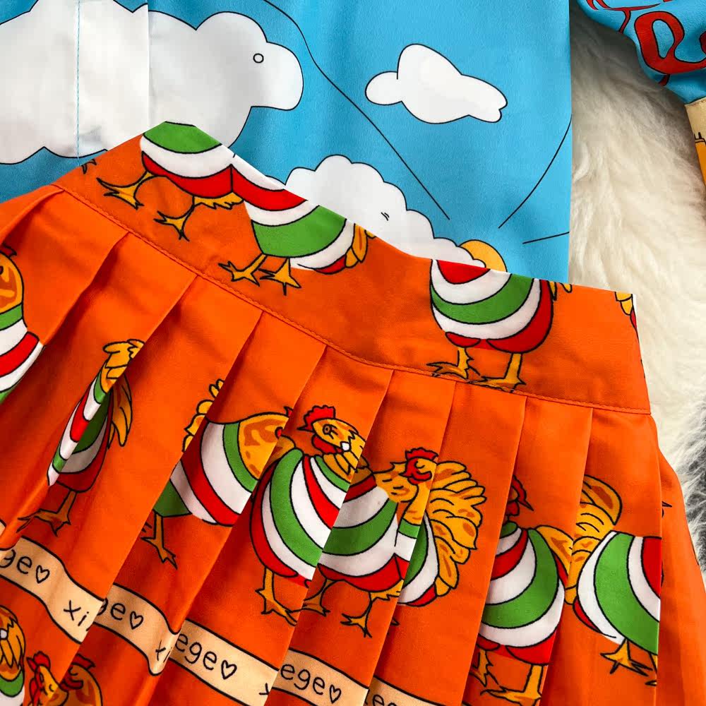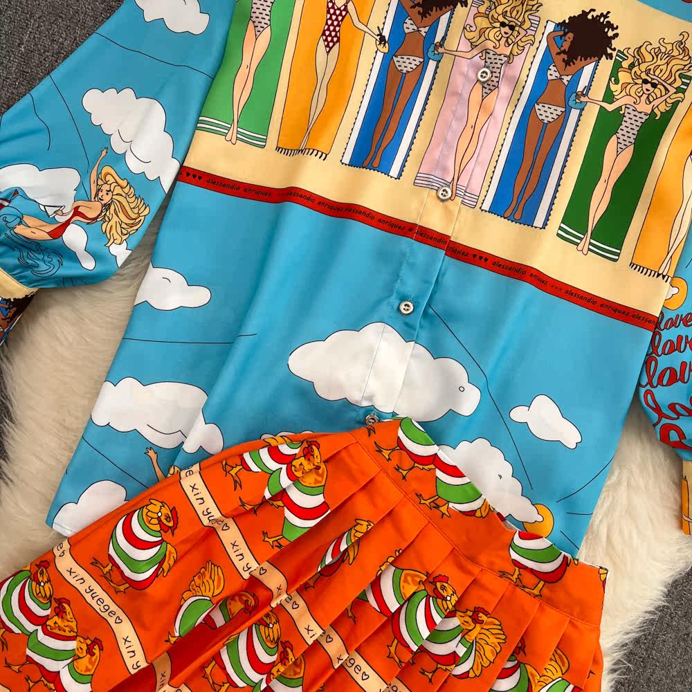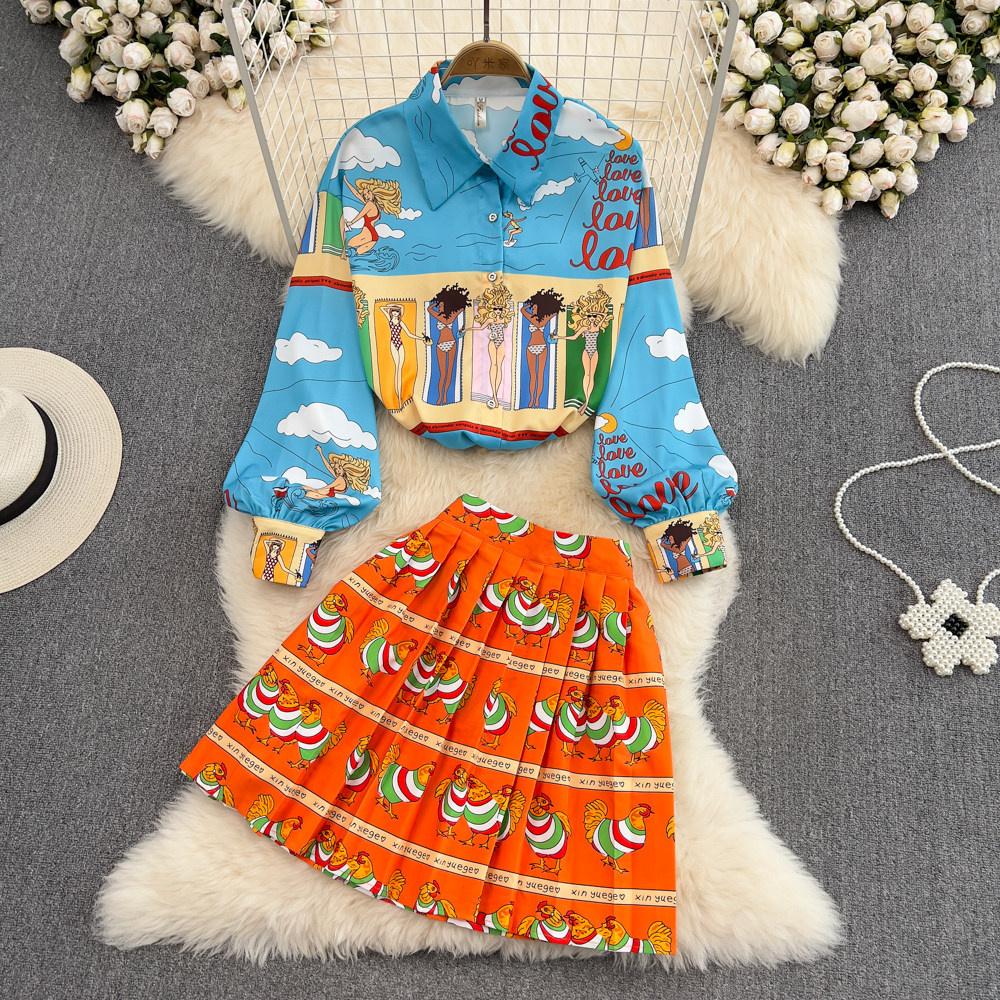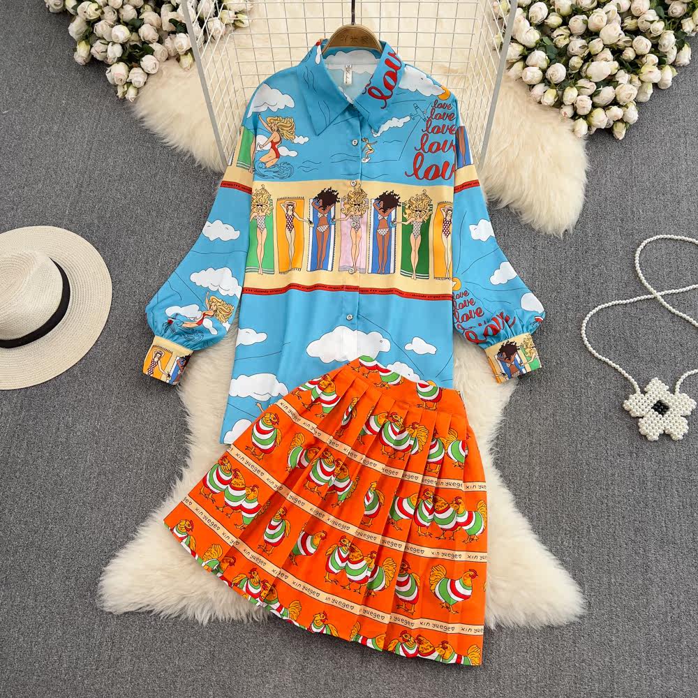 Комплект, лонгслив, фонарь, рубашка, юбка в складку, европейский стиль, свободный крой, высокая талия