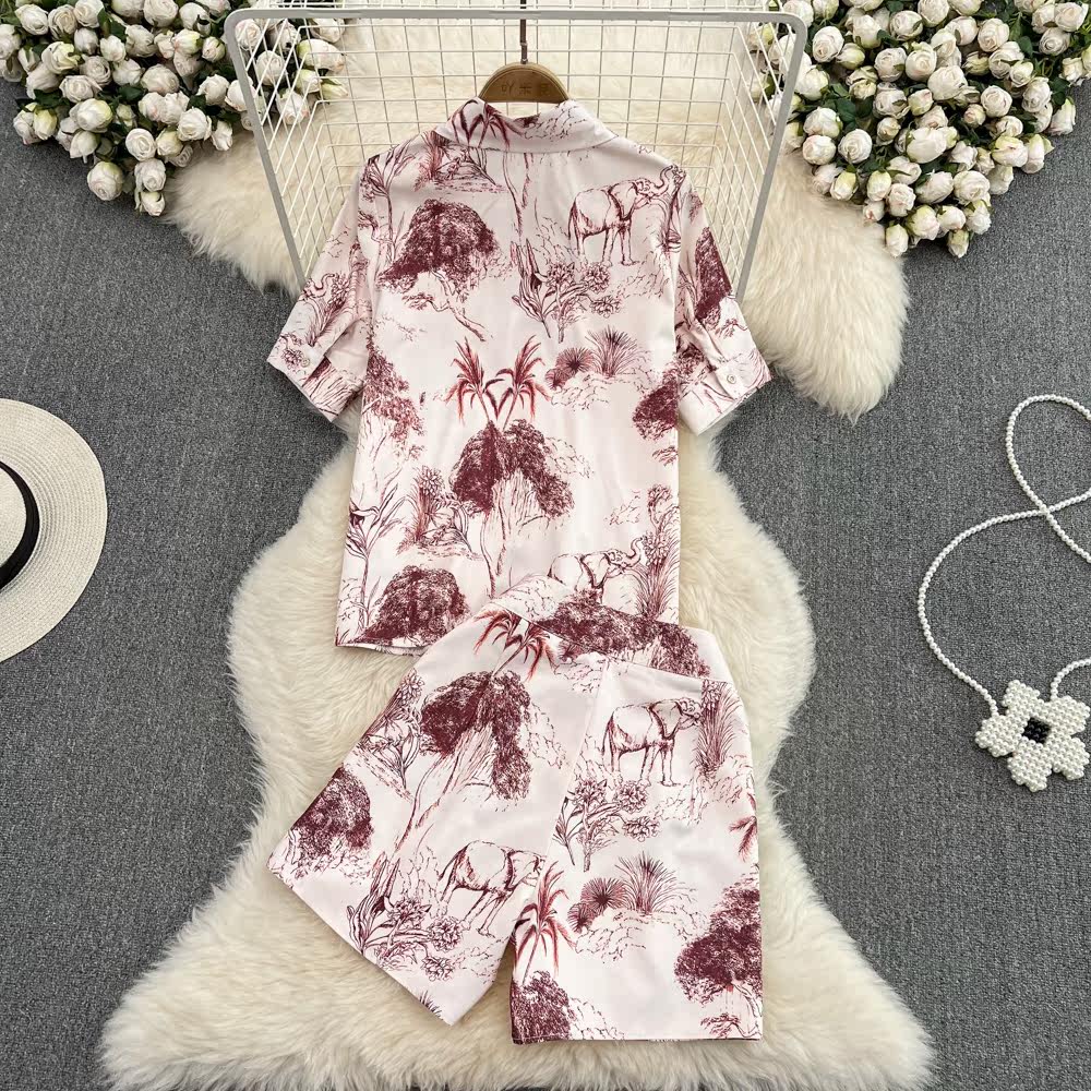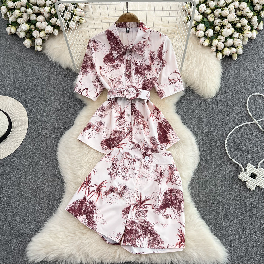Модная ретро рубашка, шорты, комплект, ремень, европейский стиль, короткий рукав, свободный крой, яркий броский стиль, 2 предмета