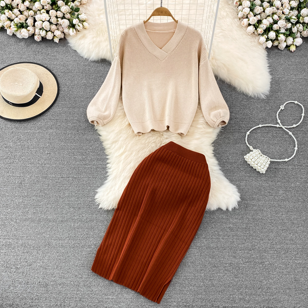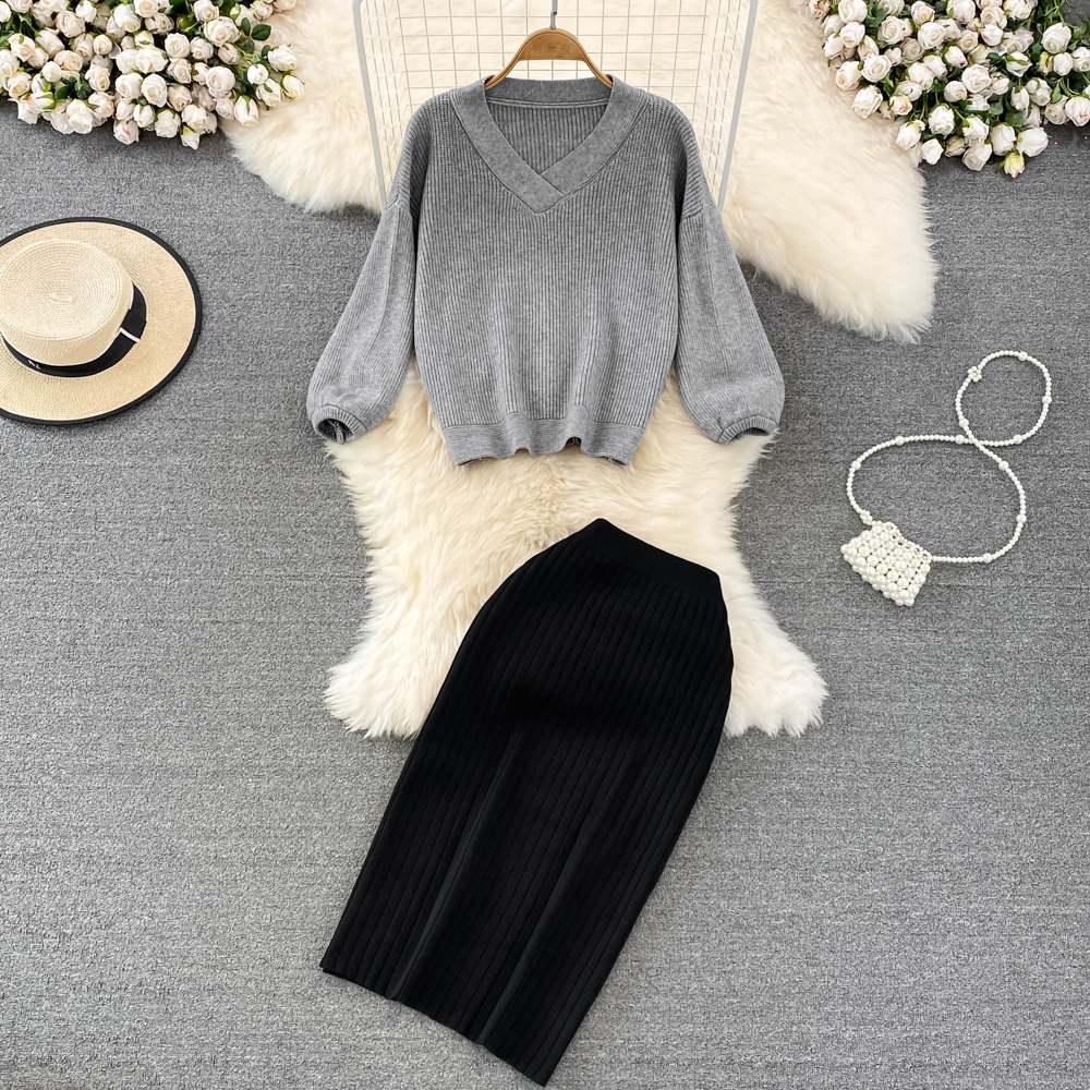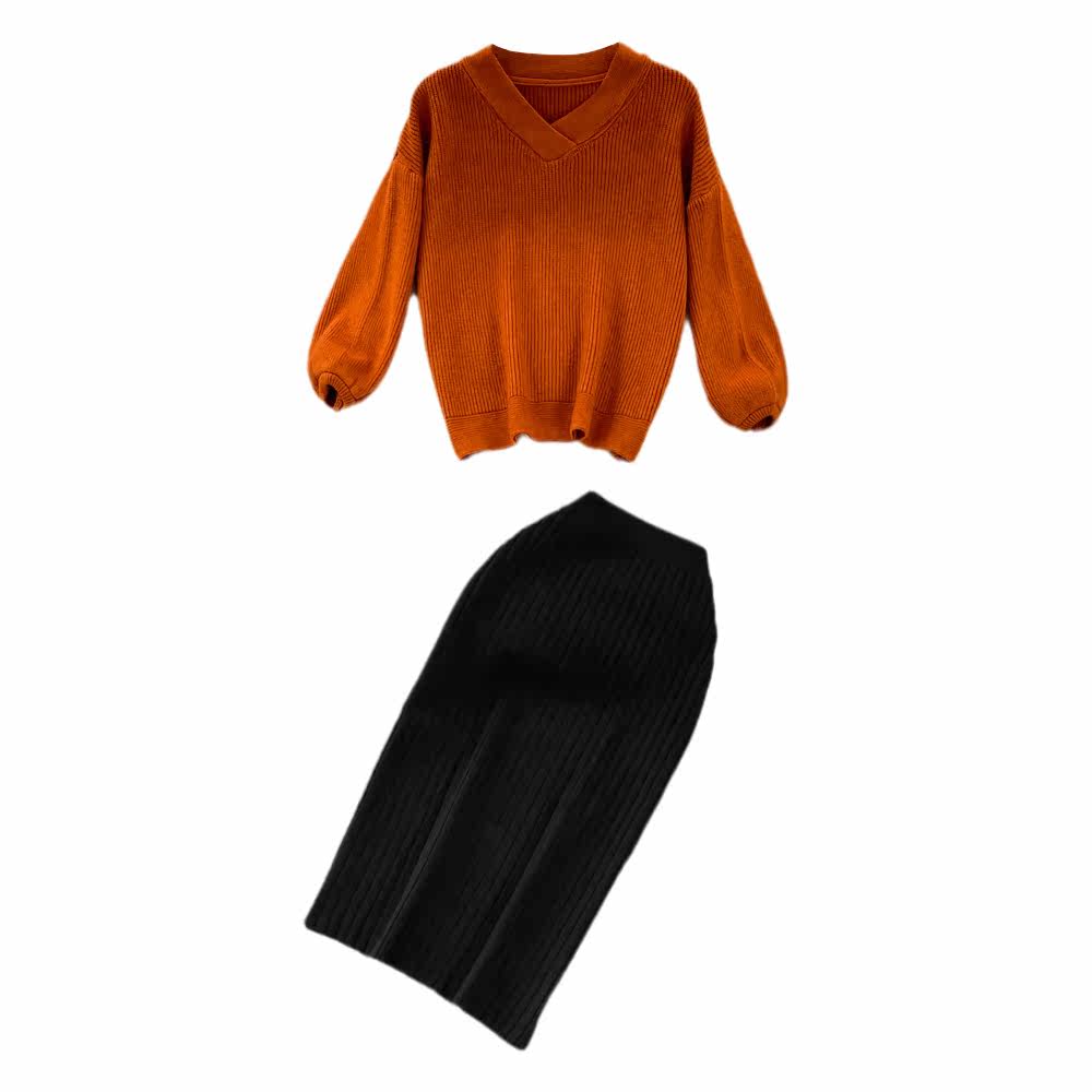 Ретро комплект, трикотажная приталенная юбка, V-образный вырез, высокая талия, с акцентом на бедрах