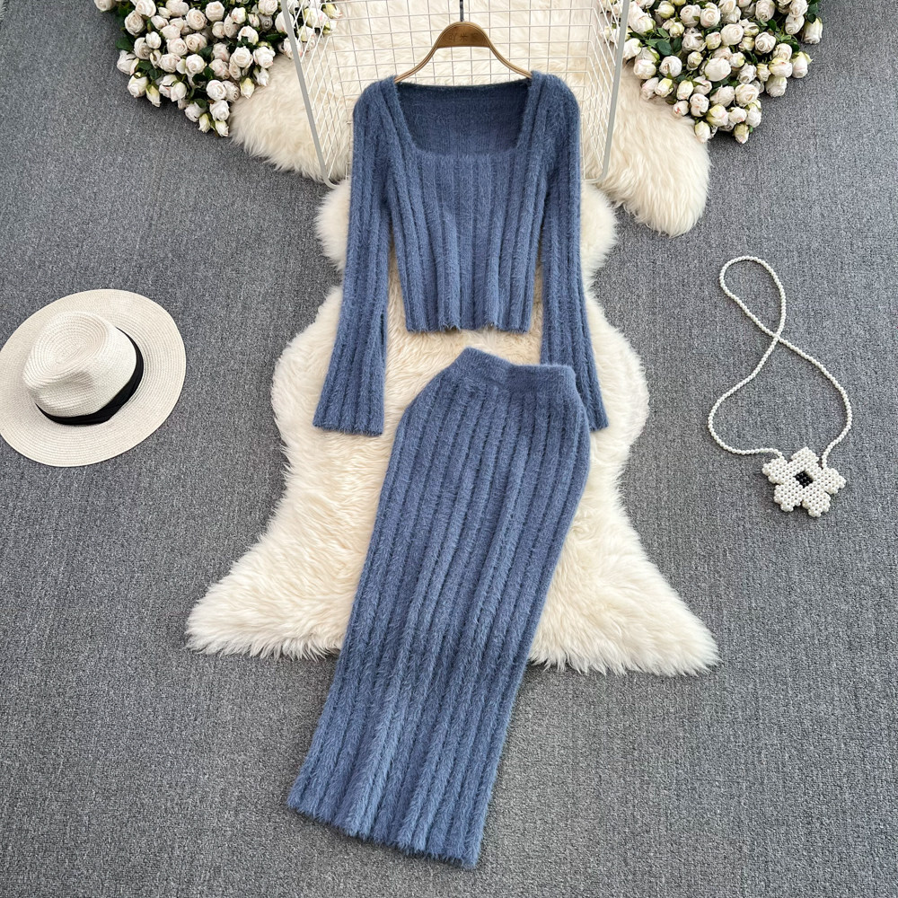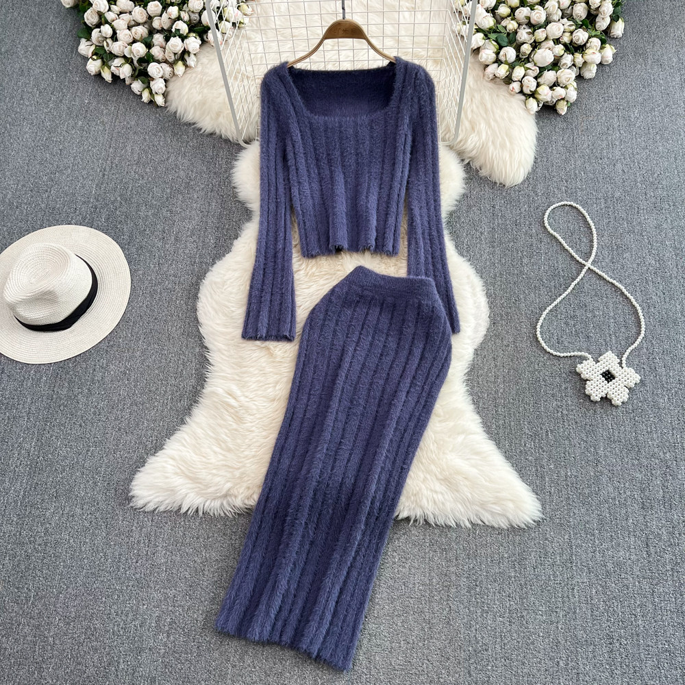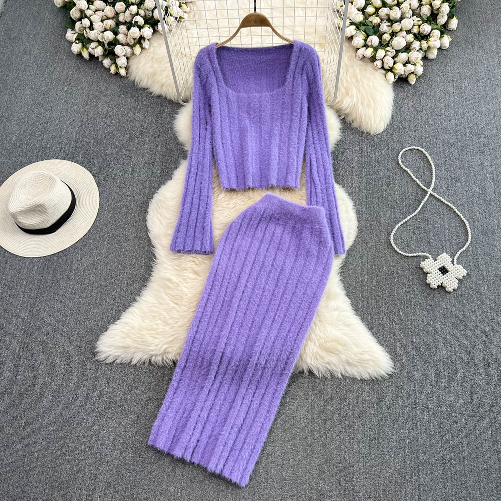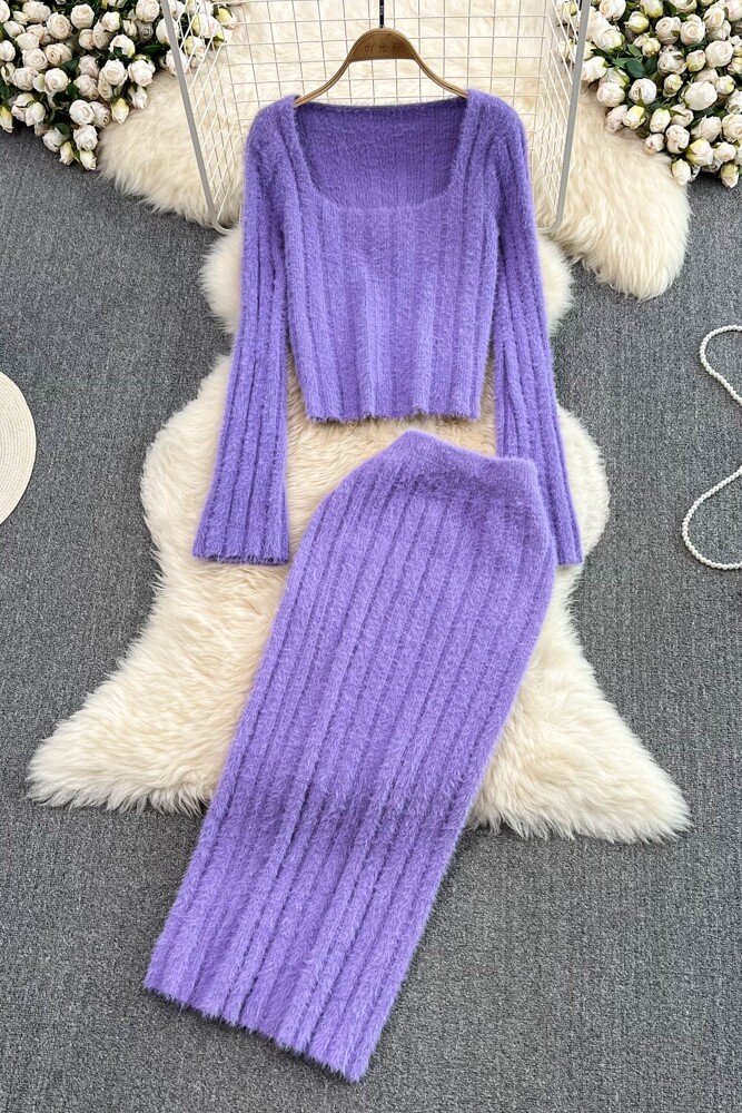 Ретро комплект, плюшевый мегафон, свитер, поясная сумка, юбка, французский стиль, квадратный вырез, высокая талия