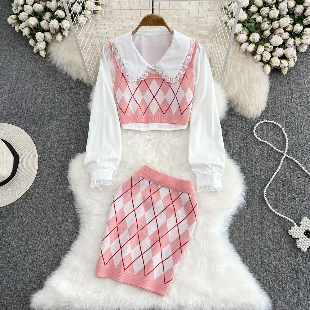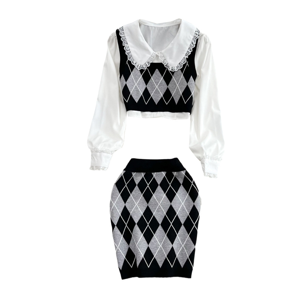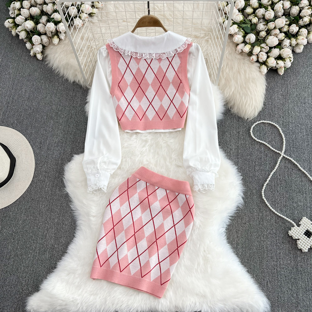 Белая кукла, короткая рубашка, комплект с ромбовидным узором, трикотажный жилет, юбка, кукольный воротник, 3 предмета