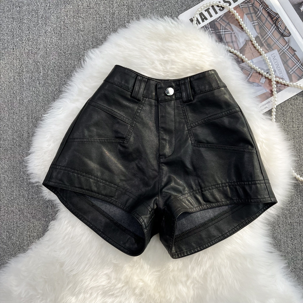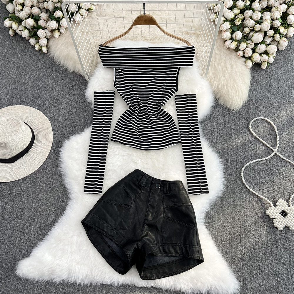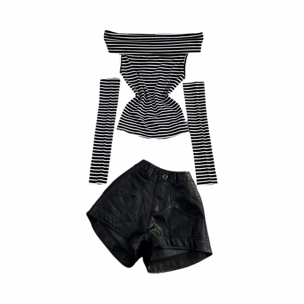 Комплект, полиуретановые приталенные штаны, шорты, открытые плечи, высокая талия, свободный крой