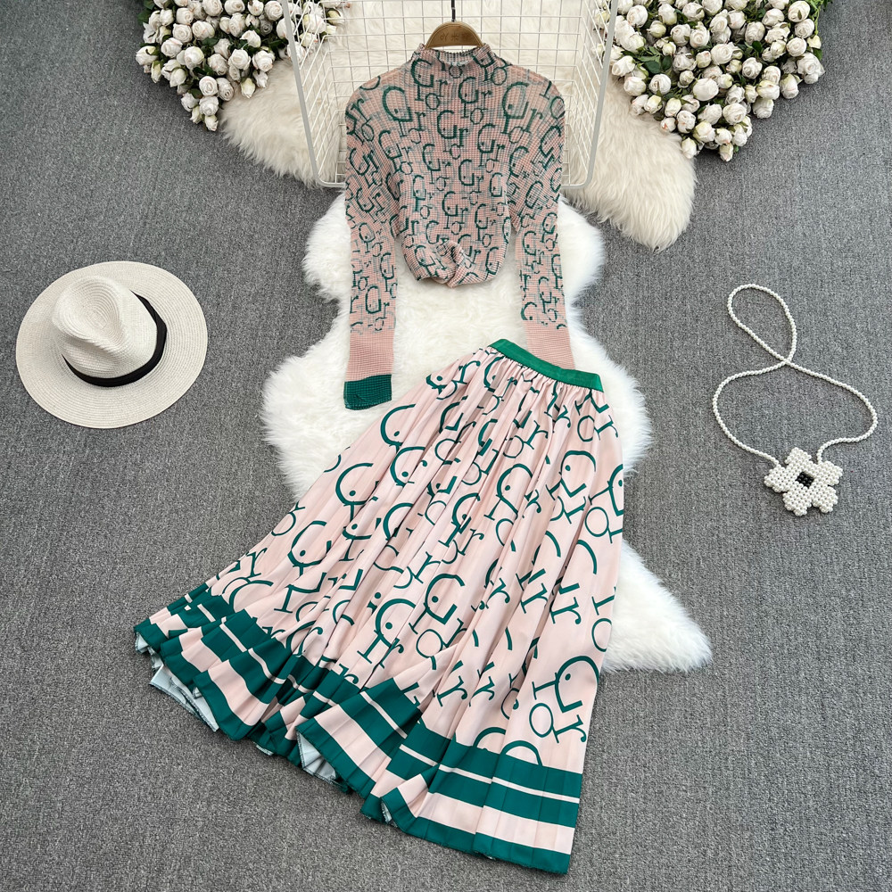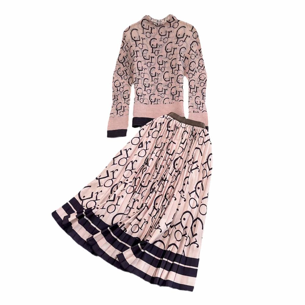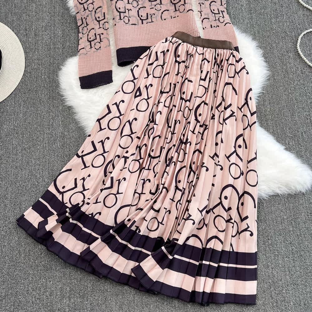 Комплект, лонгслив с буквами, приталенная футболка, юбка в складку, облегающий крой, высокая талия