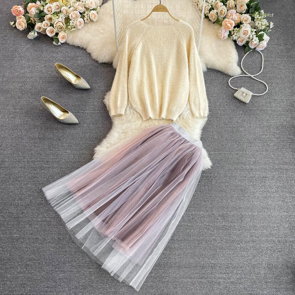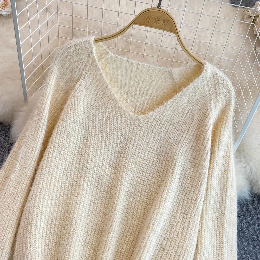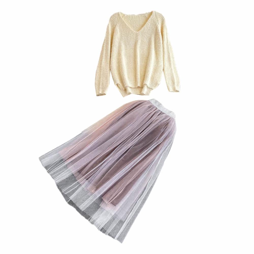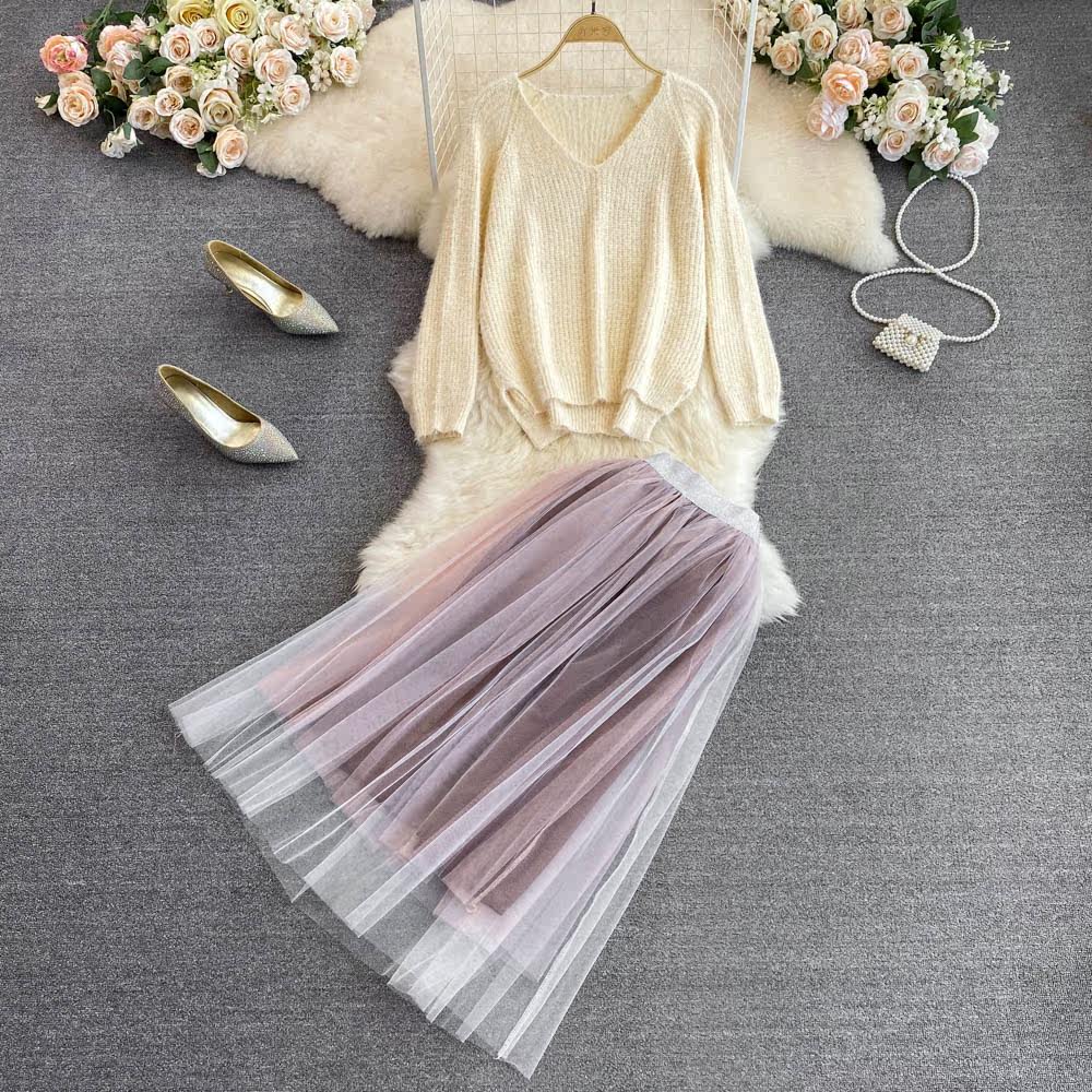 Комплект, трикотажный длинный свитер, юбка, V-образный вырез, длина миди, высокая талия, А-силуэт