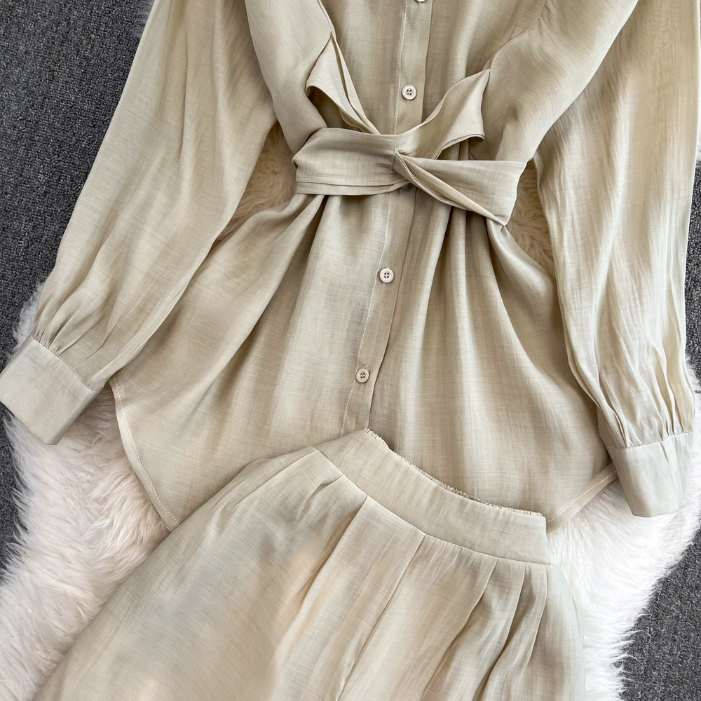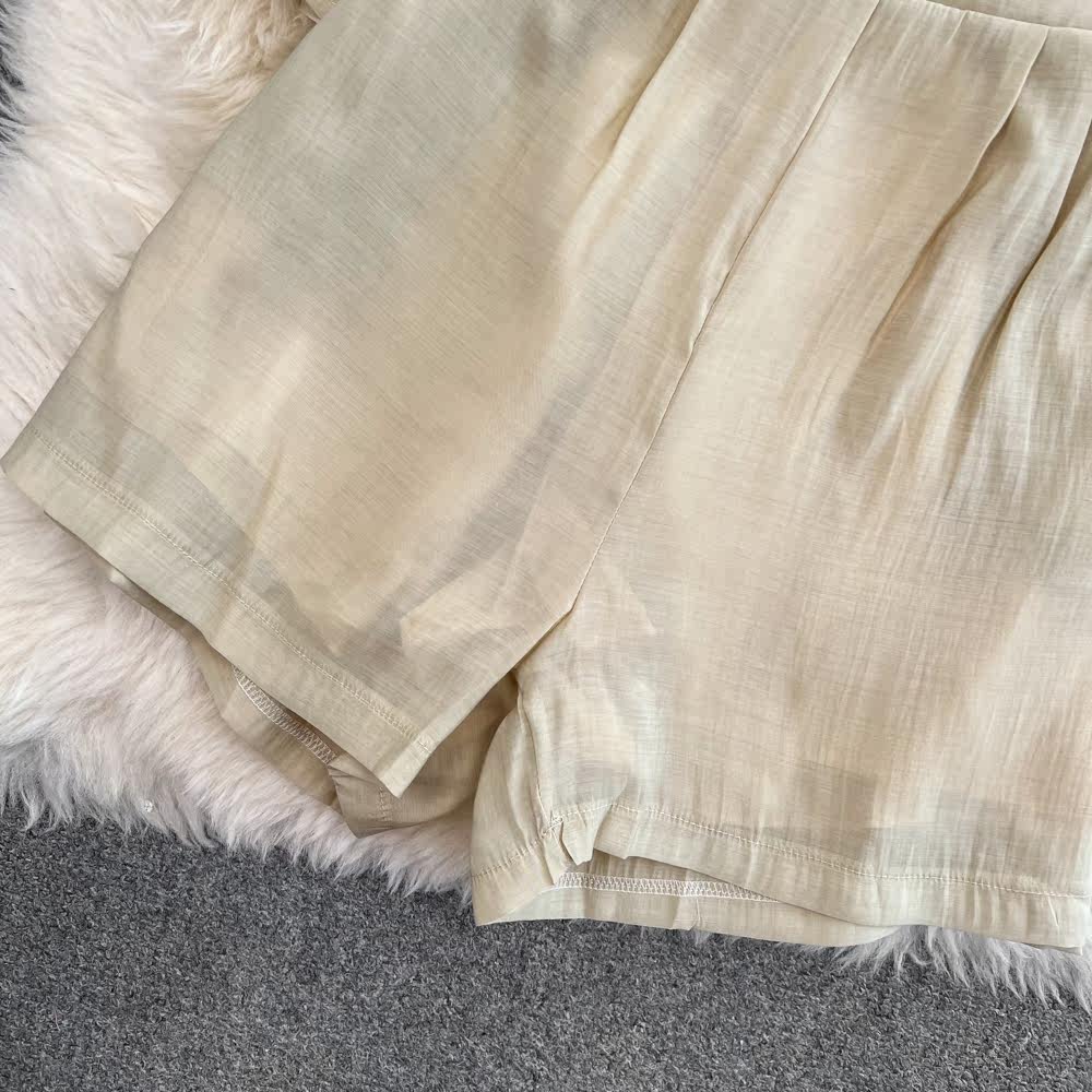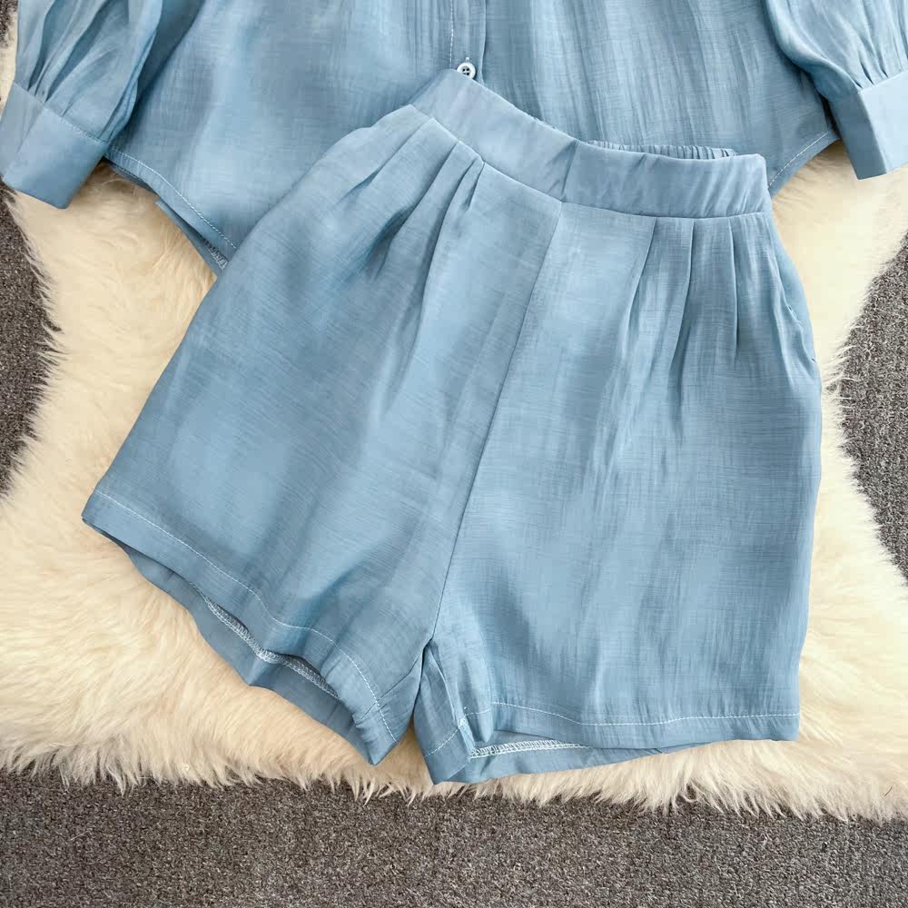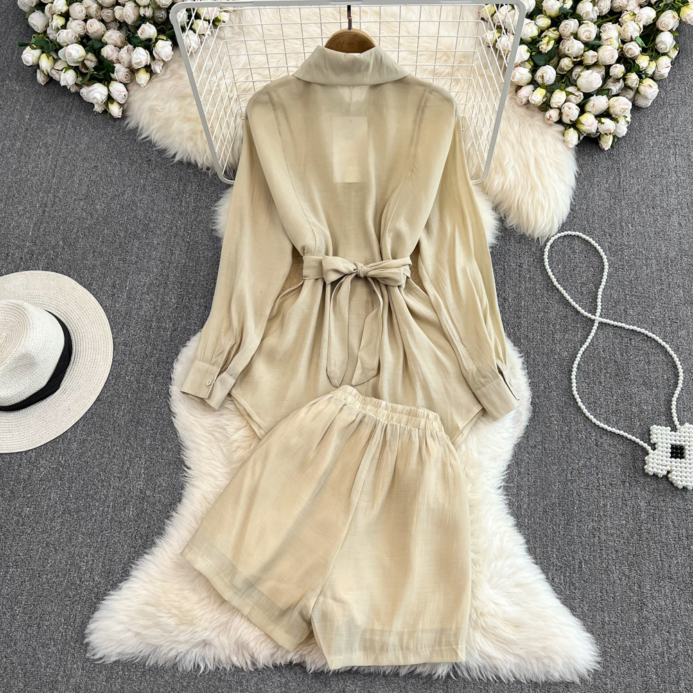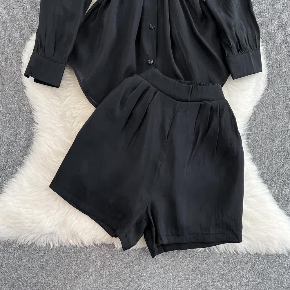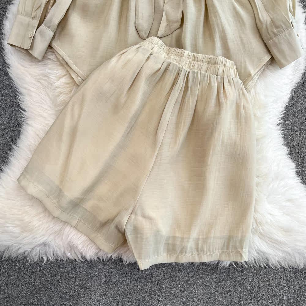 Комплект для отдыха, длинный лонгслив, приталенная рубашка, шорты, с рукавом, высокая талия, свободный крой