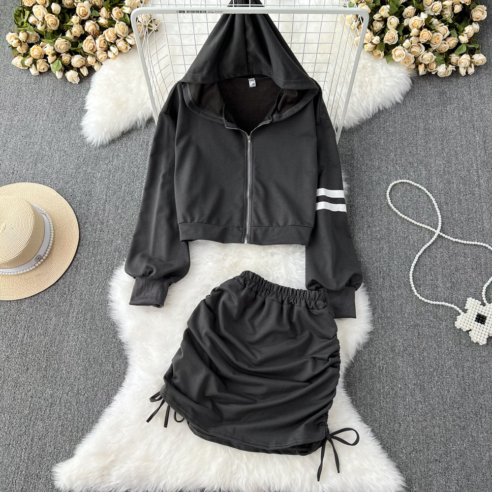 Комплект для отдыха с капюшоном, толстовка с молнией, юбка, свободный крой, высокая талия, с акцентом на бедрах
