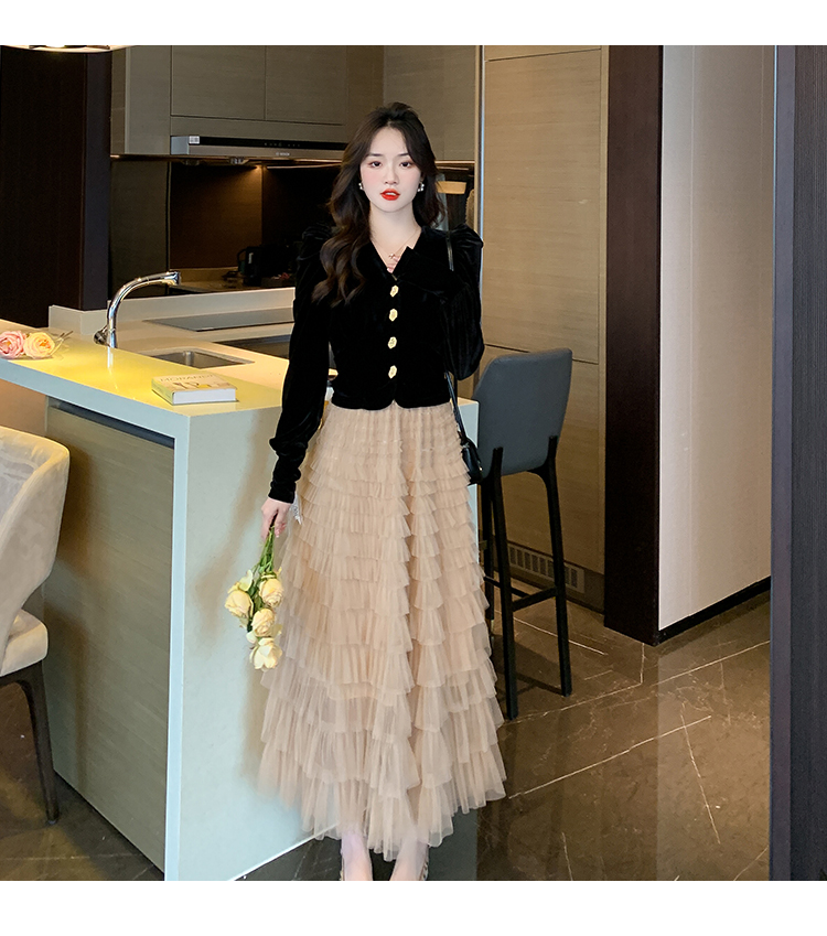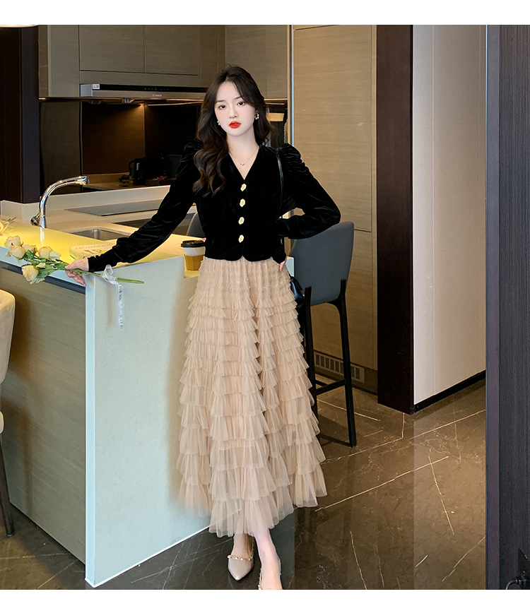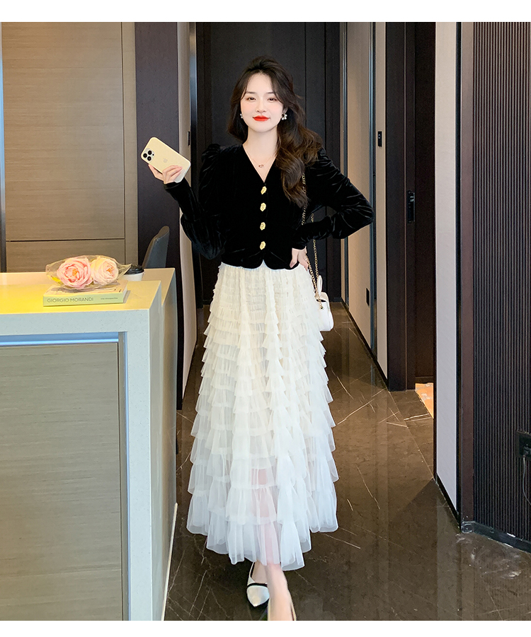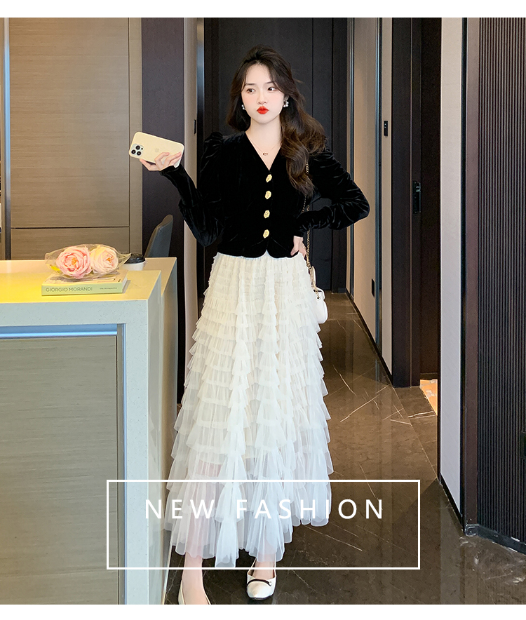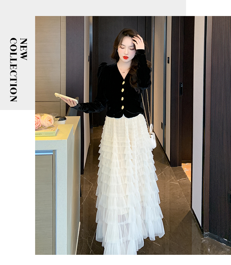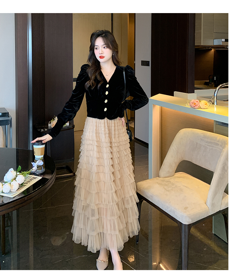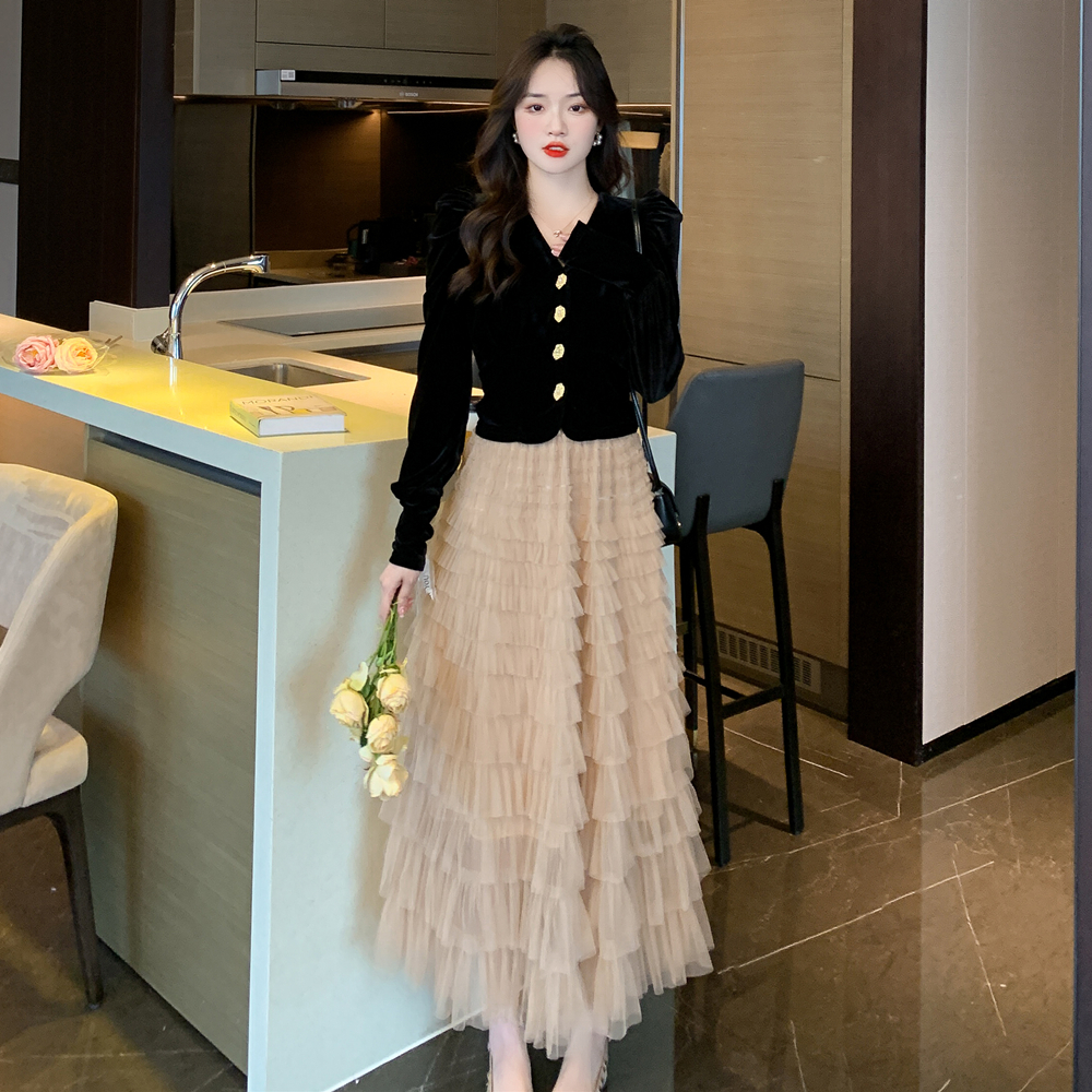 Демисезонный бархатный комплект, длинная юбка, французский стиль, V-образный вырез