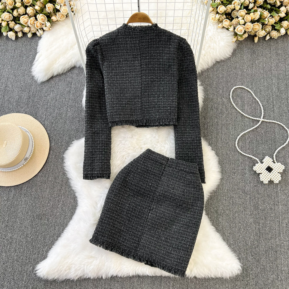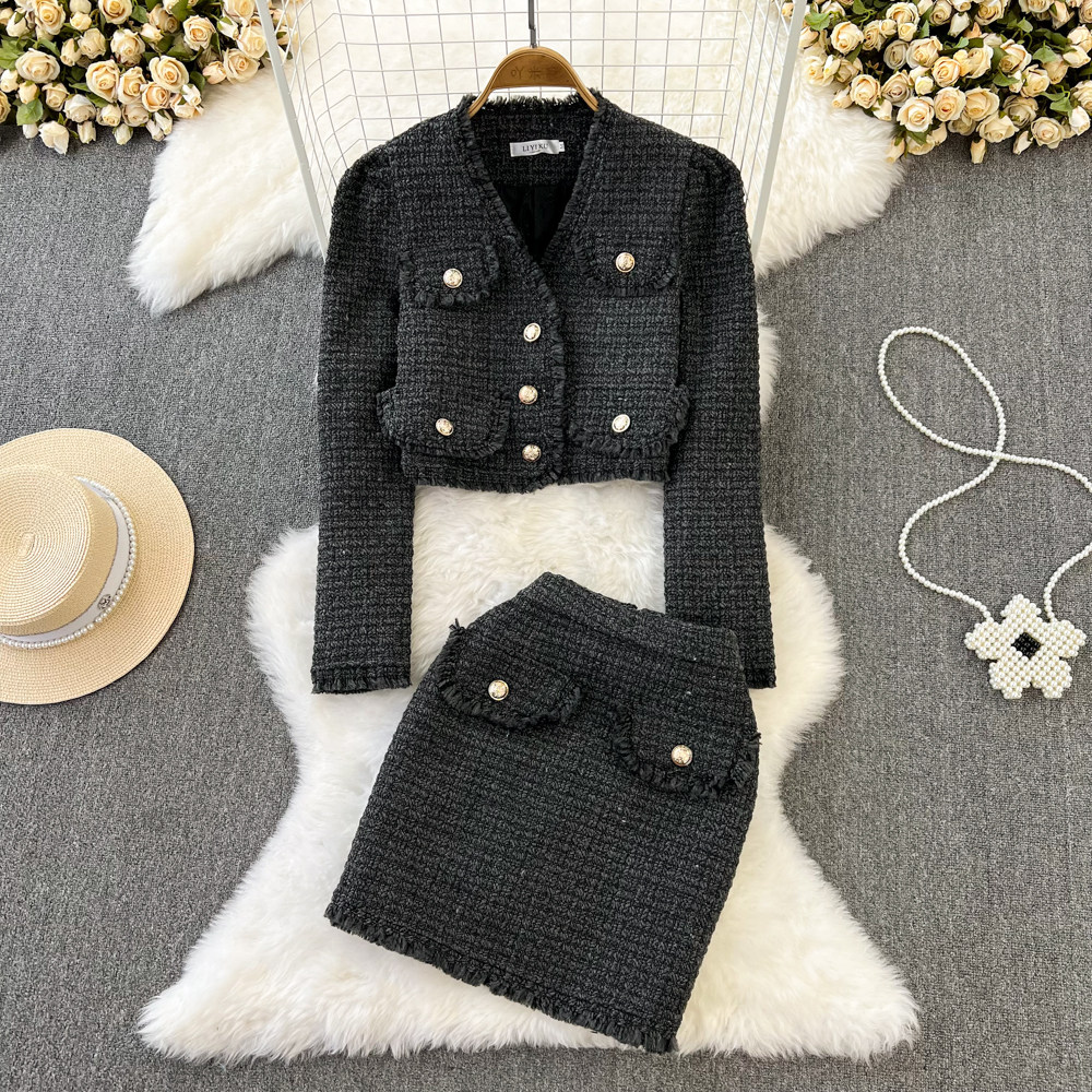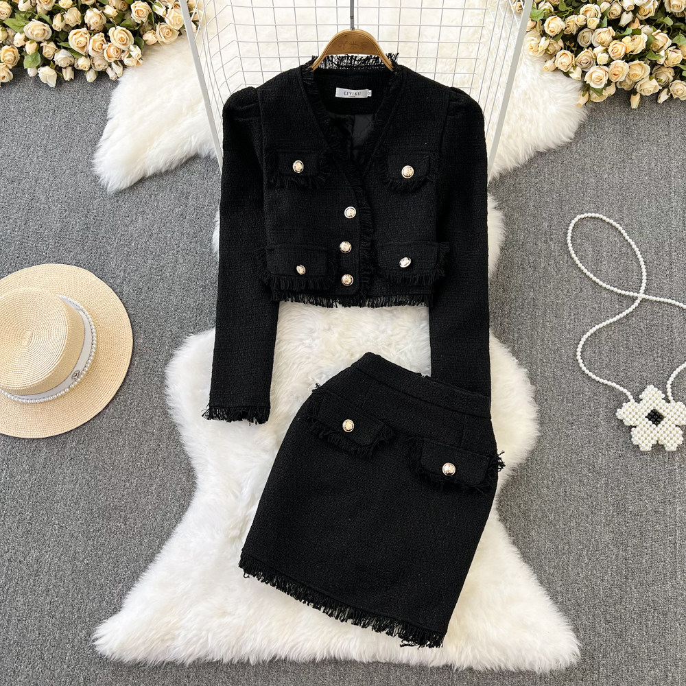 Ретро комплект, куртка с кисточками, поясная сумка, юбка, в стиле Шанель, V-образный вырез, высокая талия