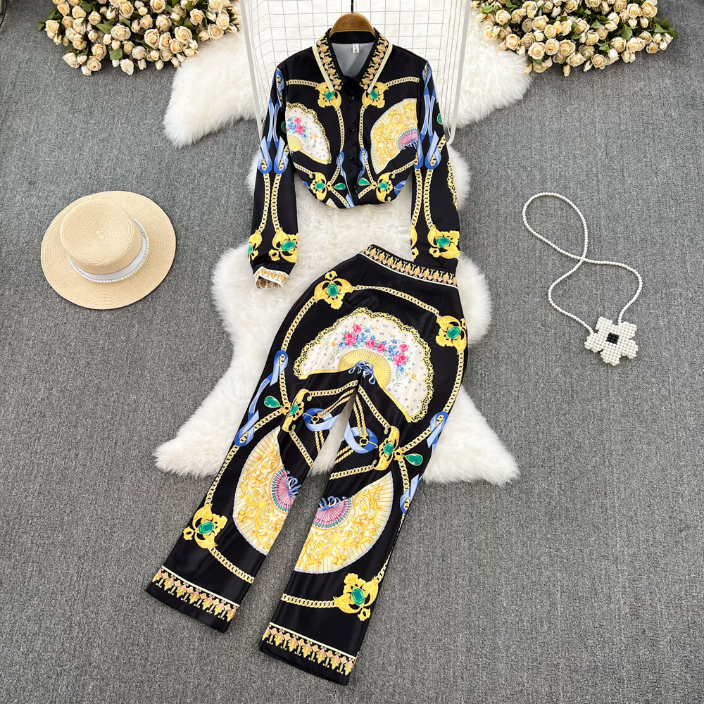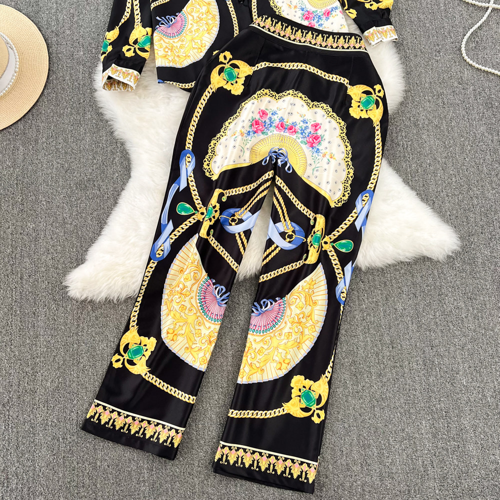 Ретро комплект, рубашка, штаны, европейский стиль, свободный крой, высокая талия