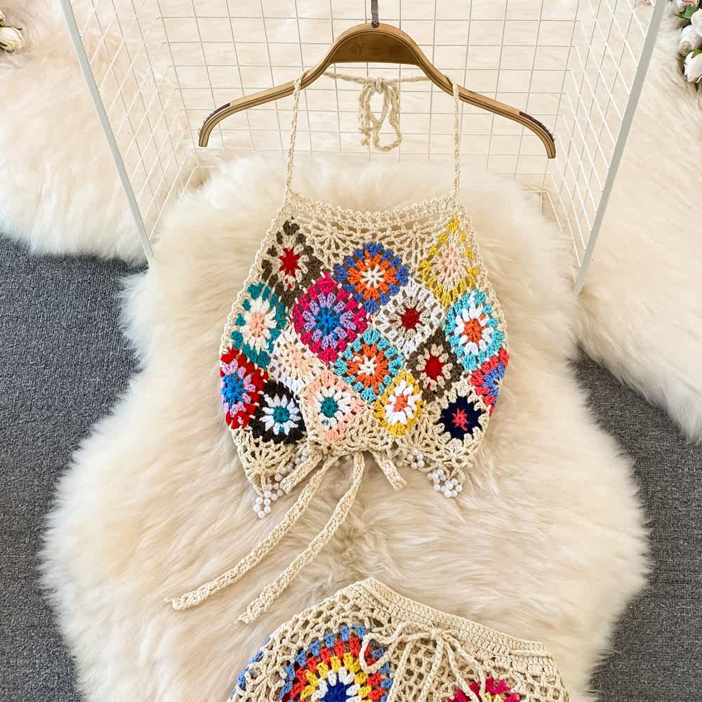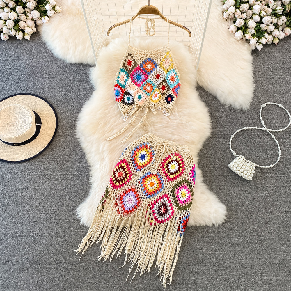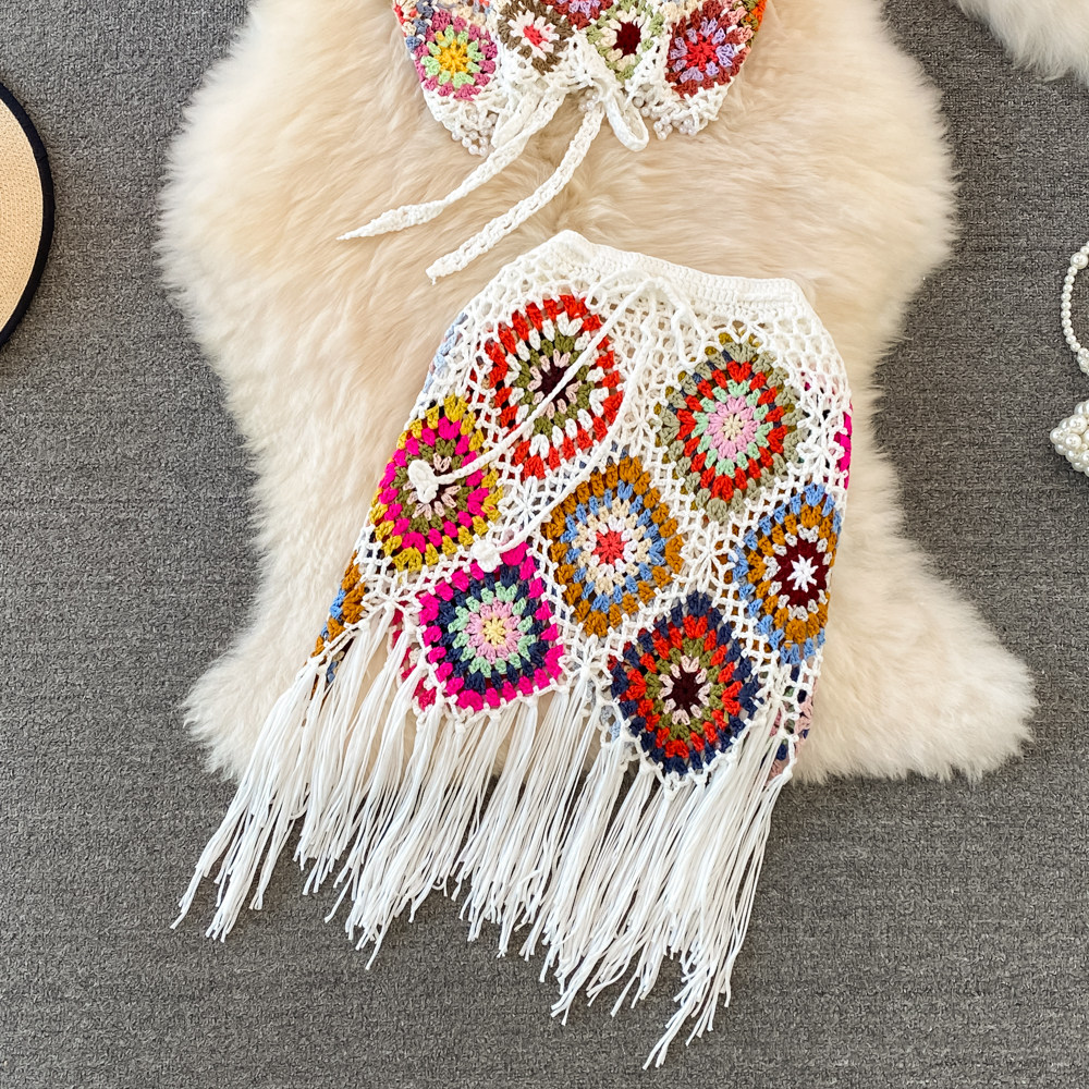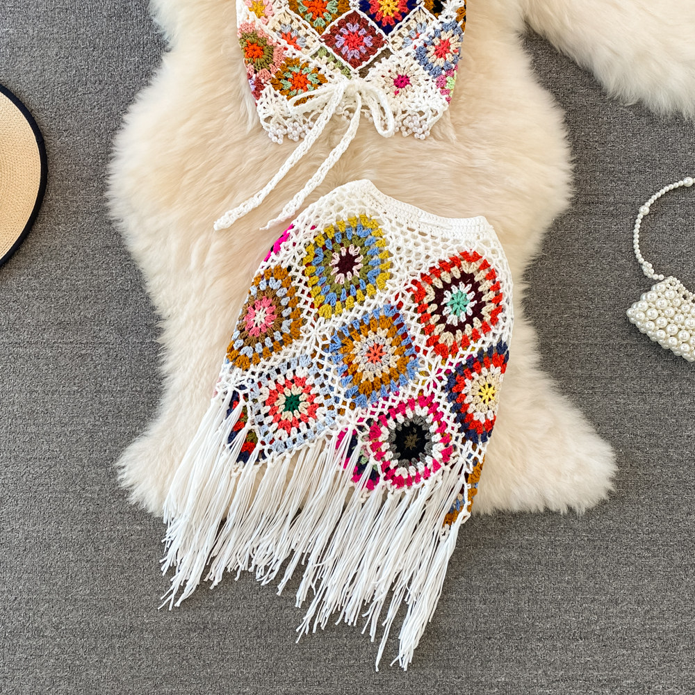 Трикотажный комплект, топ с чашечками, юбка с кисточками, высокая талия