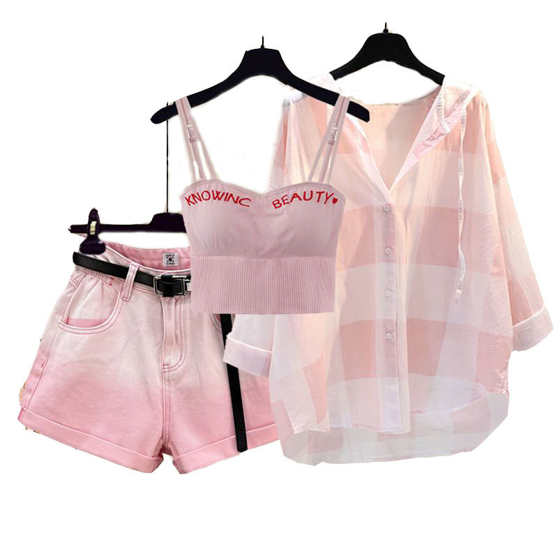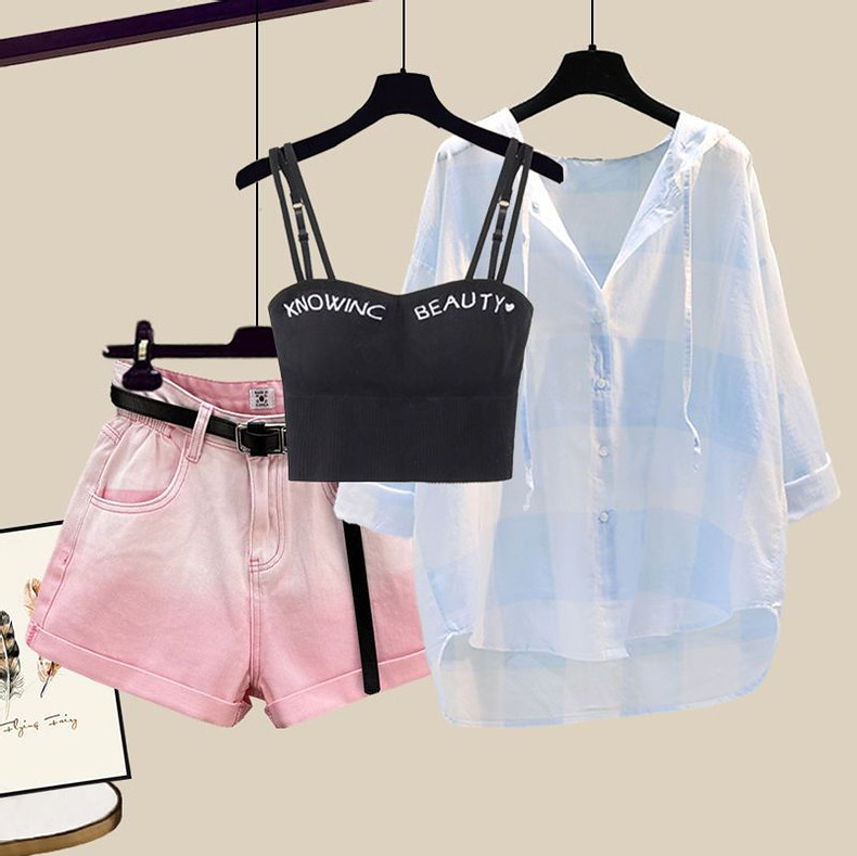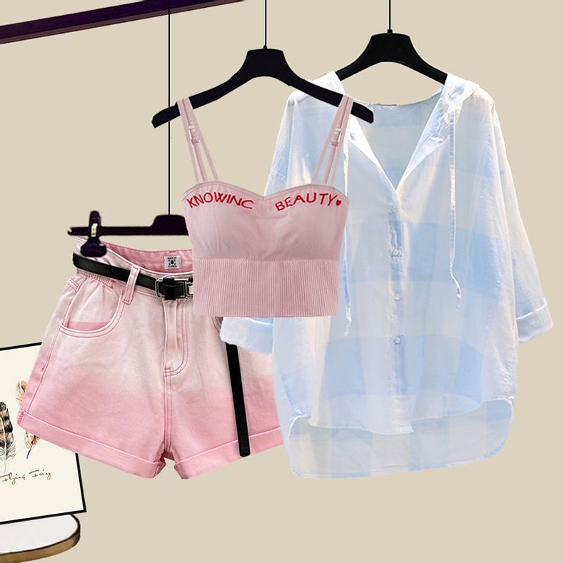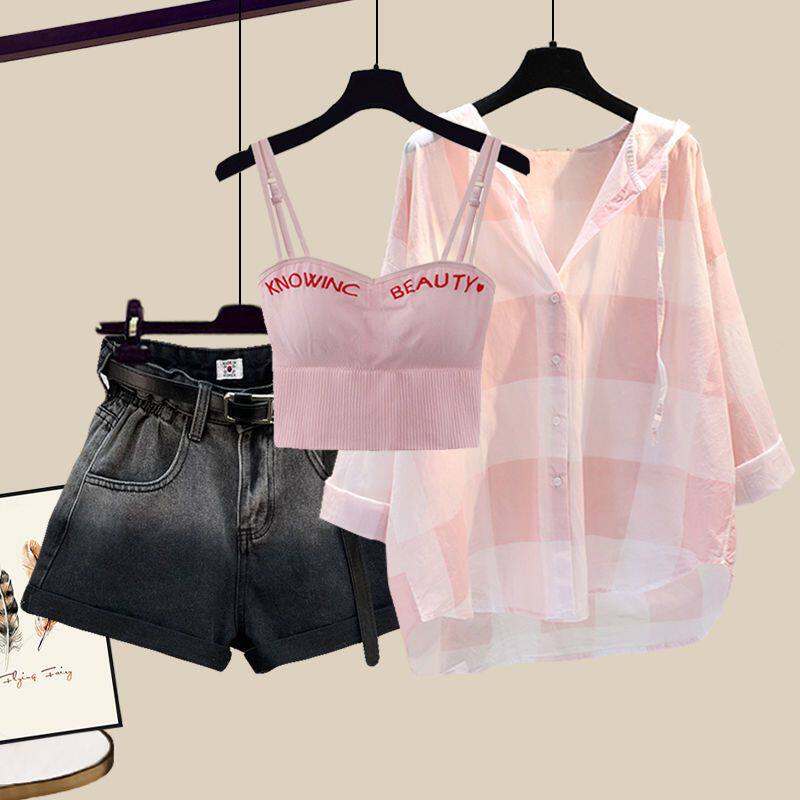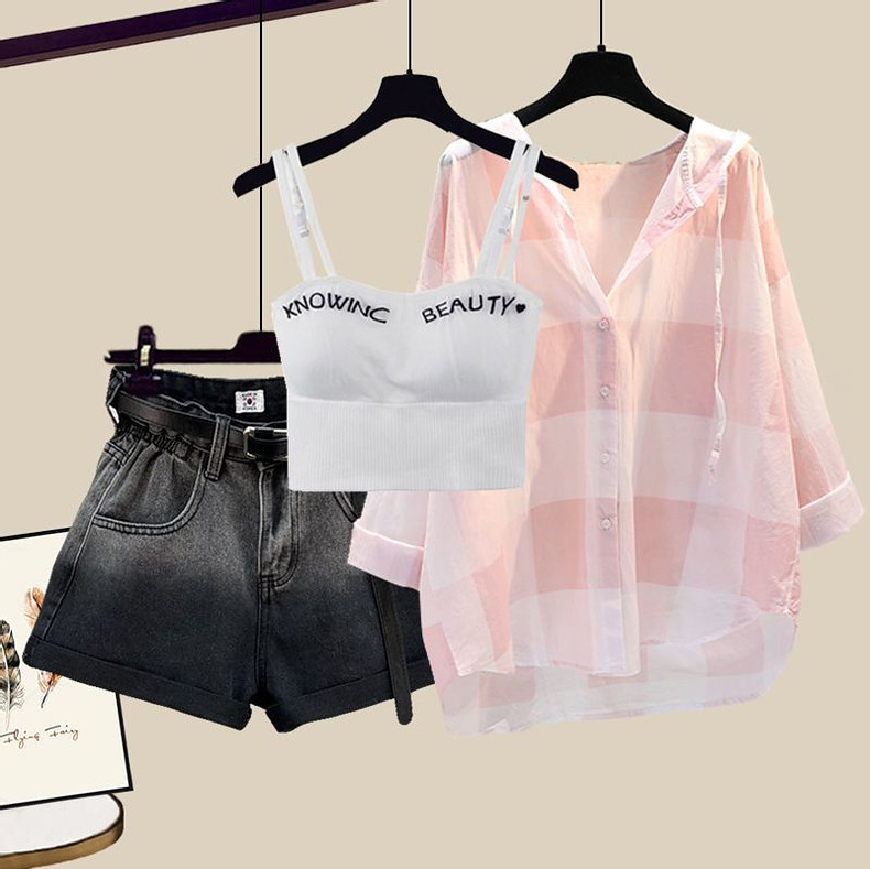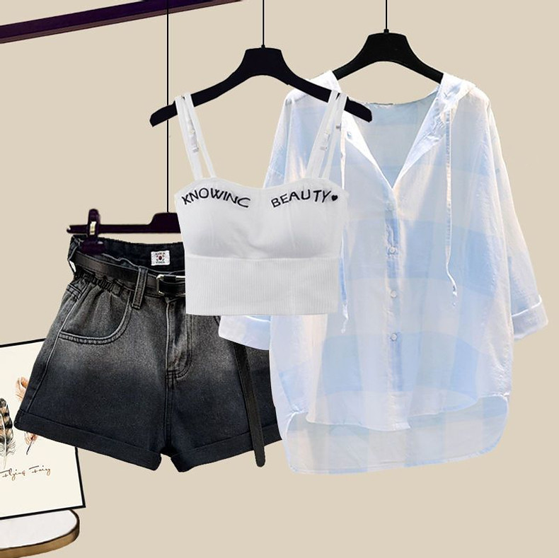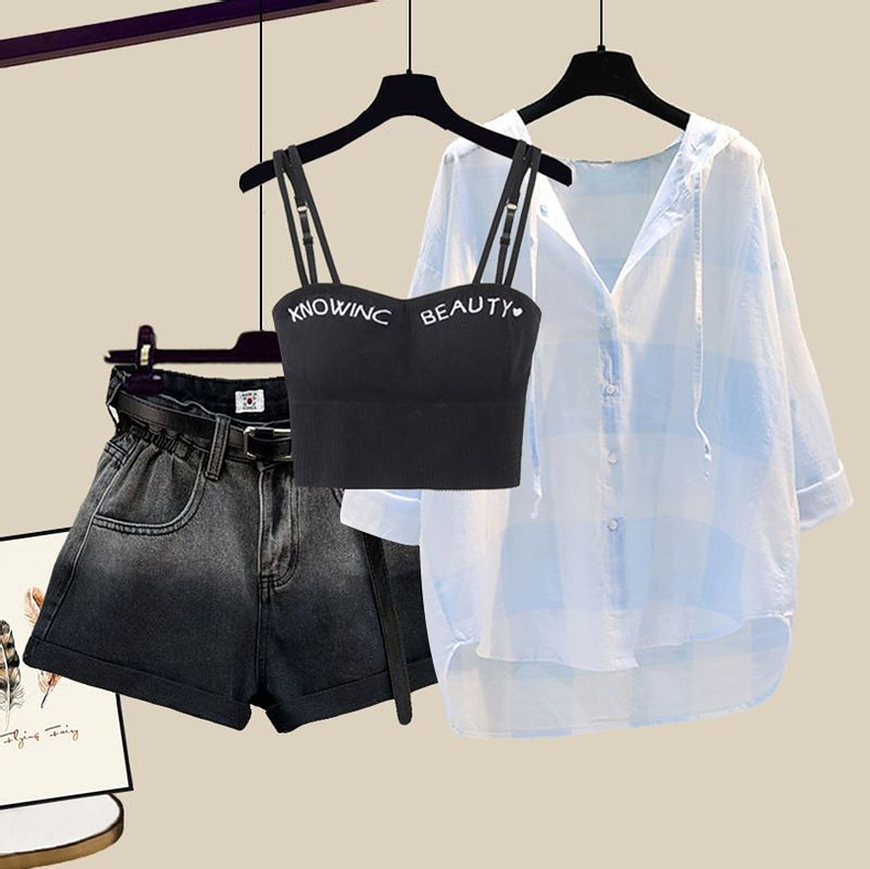 Комплект, рубашка, жилет, джинсовая юбка, шорты, защита от солнца, по фигуре, 3 предмета