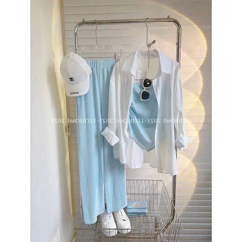 Спортивный костюм для отдыха, летняя одежда, рубашка, синие штаны, комплект, защита от солнца, 3 предмета