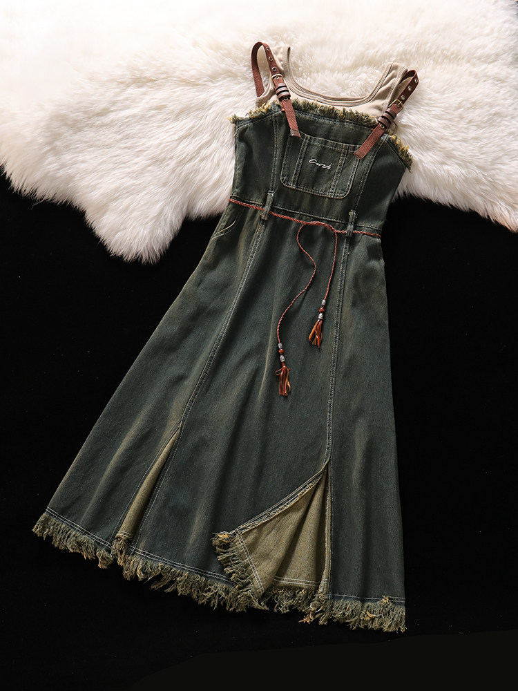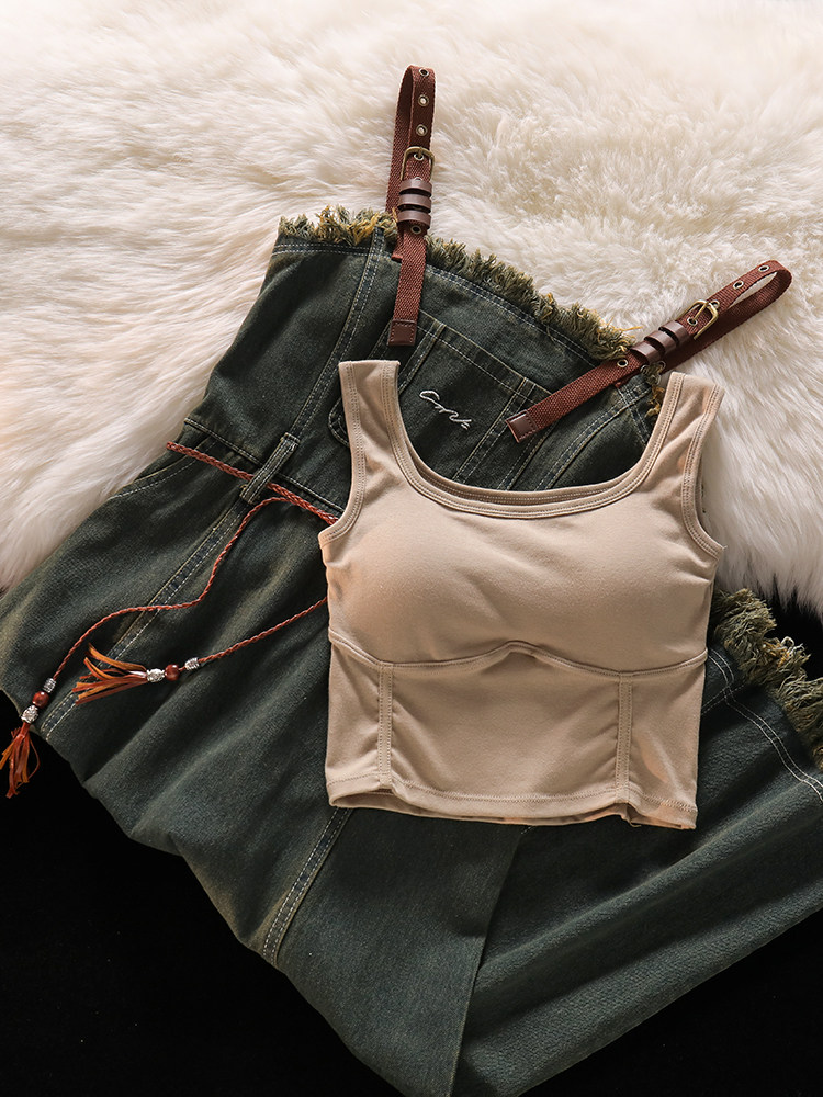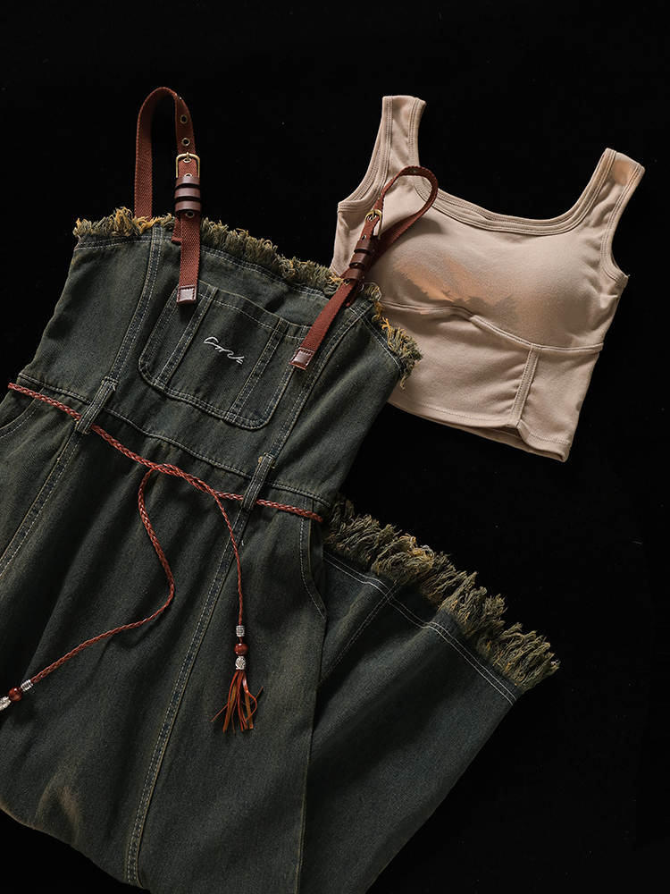 Короткий приталенный жилет, летнее джинсовое платье, юбка, комплект, А-силуэт, эффект подтяжки