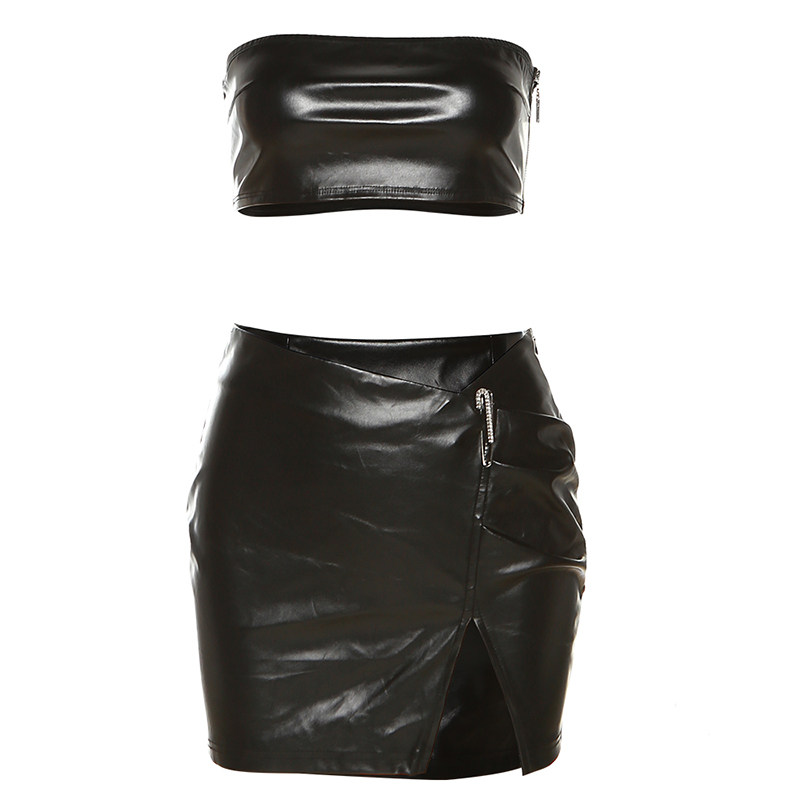 Бюстгальтер-топ, майка, мини-юбка, черный полиуретановый комплект, сексуальная юбка, европейский стиль