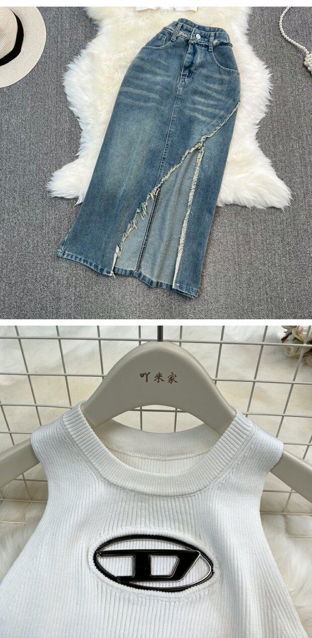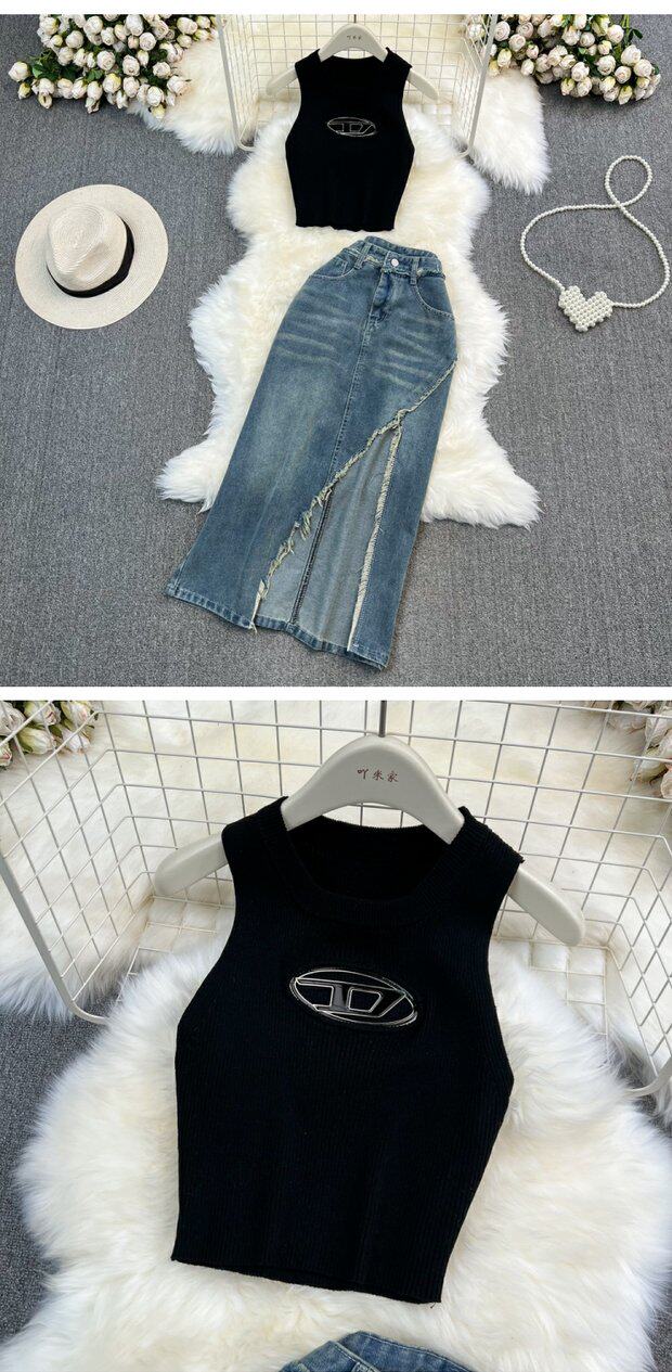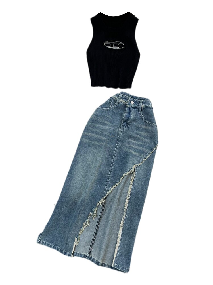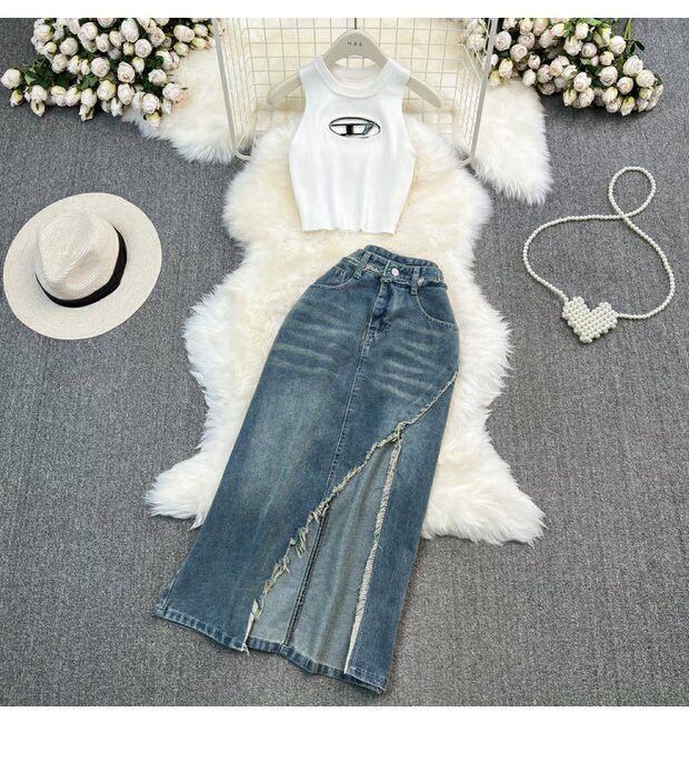 | Цвет: | Белый жилет, джинсовая юбка, Черный жилет, джинсовая юбка |