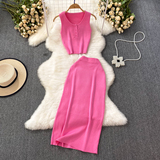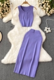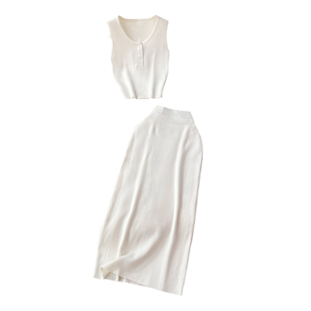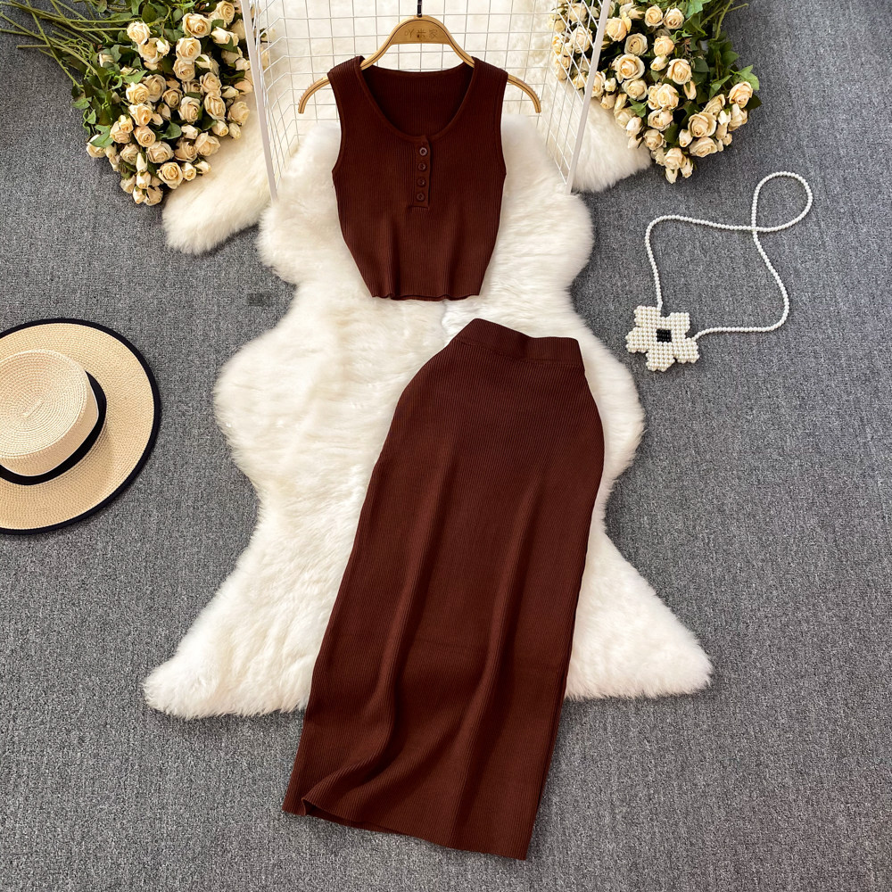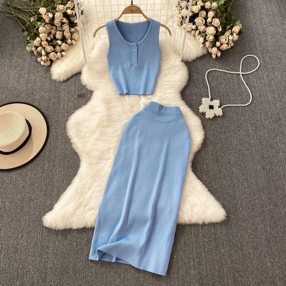 Комплект без рукавов с круглым воротником, приталенный трикотажный жилет, поясная сумка, юбка, в корейском стиле, высокая талия