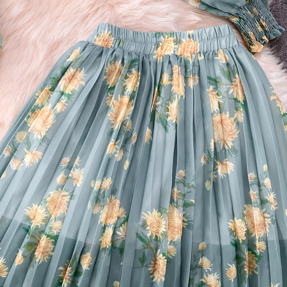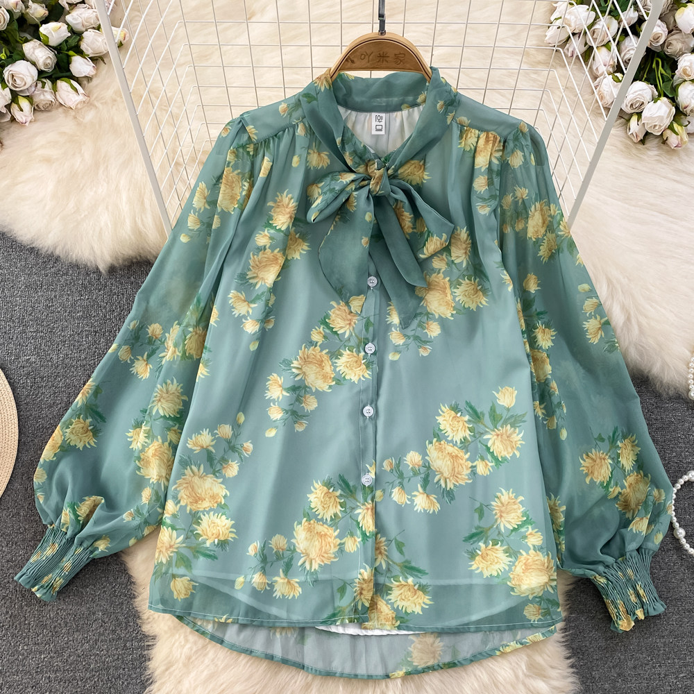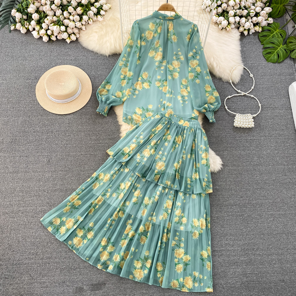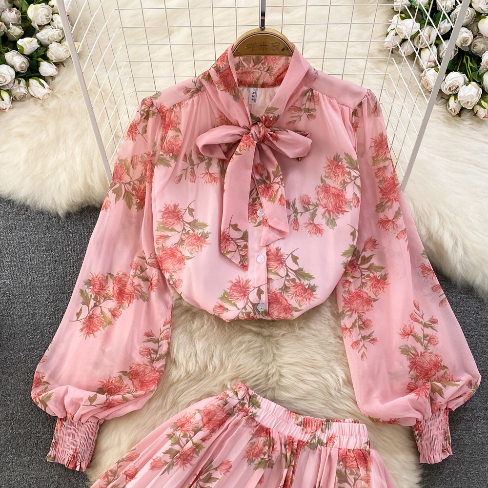 Комплект, фонарь, лонгслив с бантиком, шифоновая юбка, свободный крой, шифоновый с принтом, высокая талия