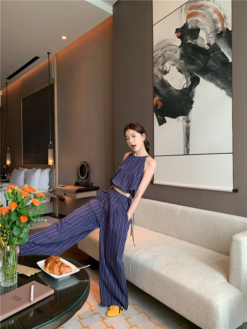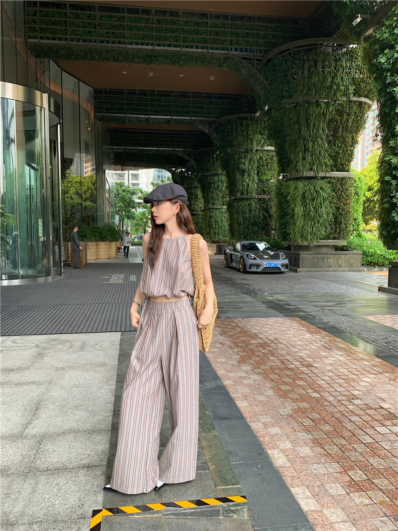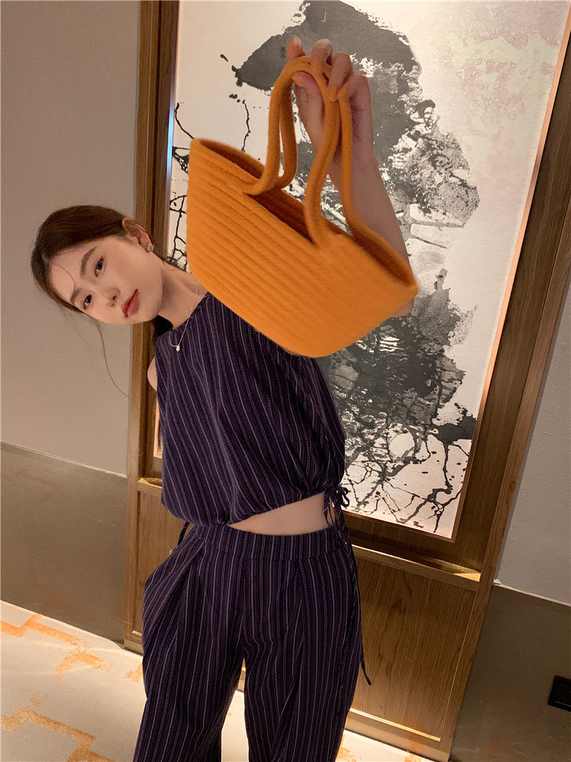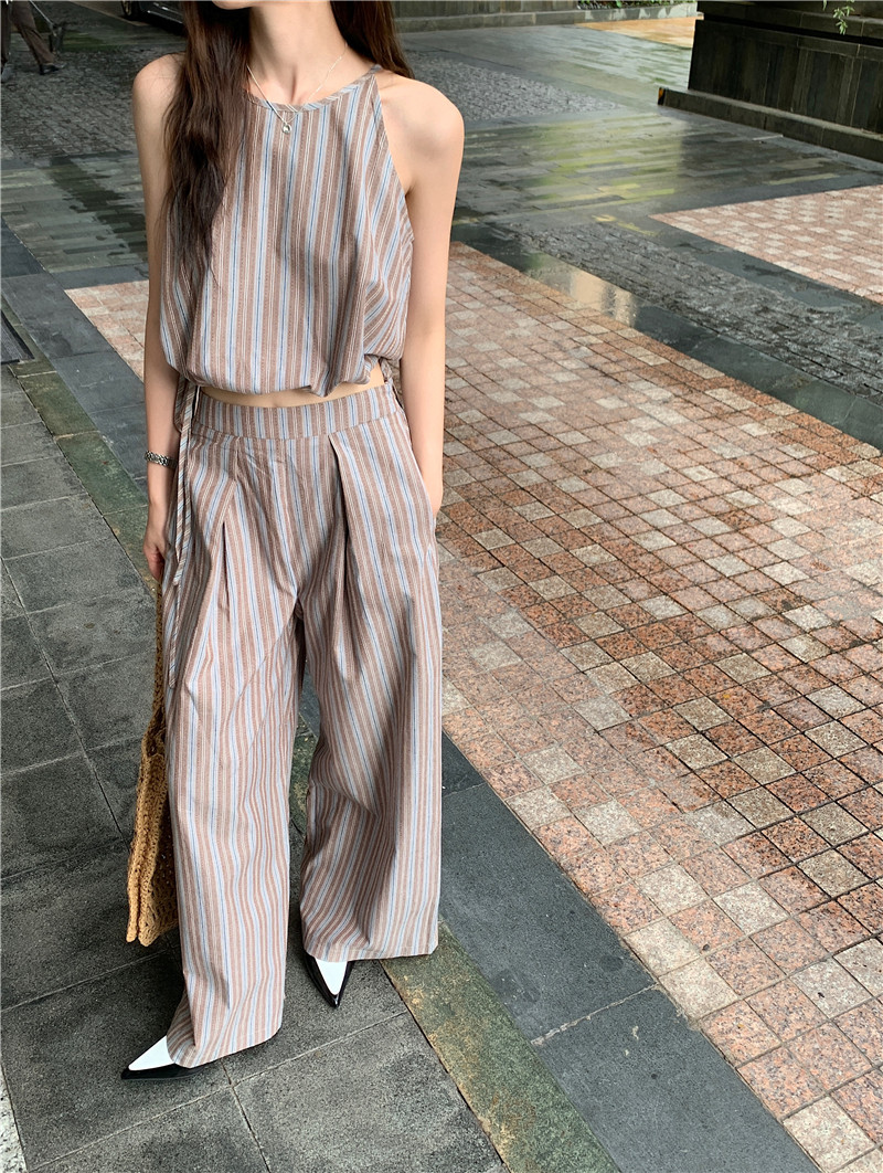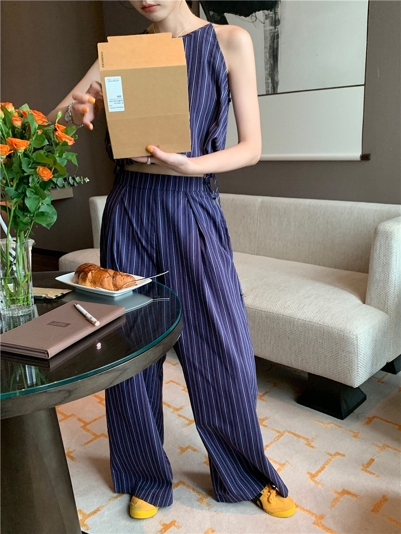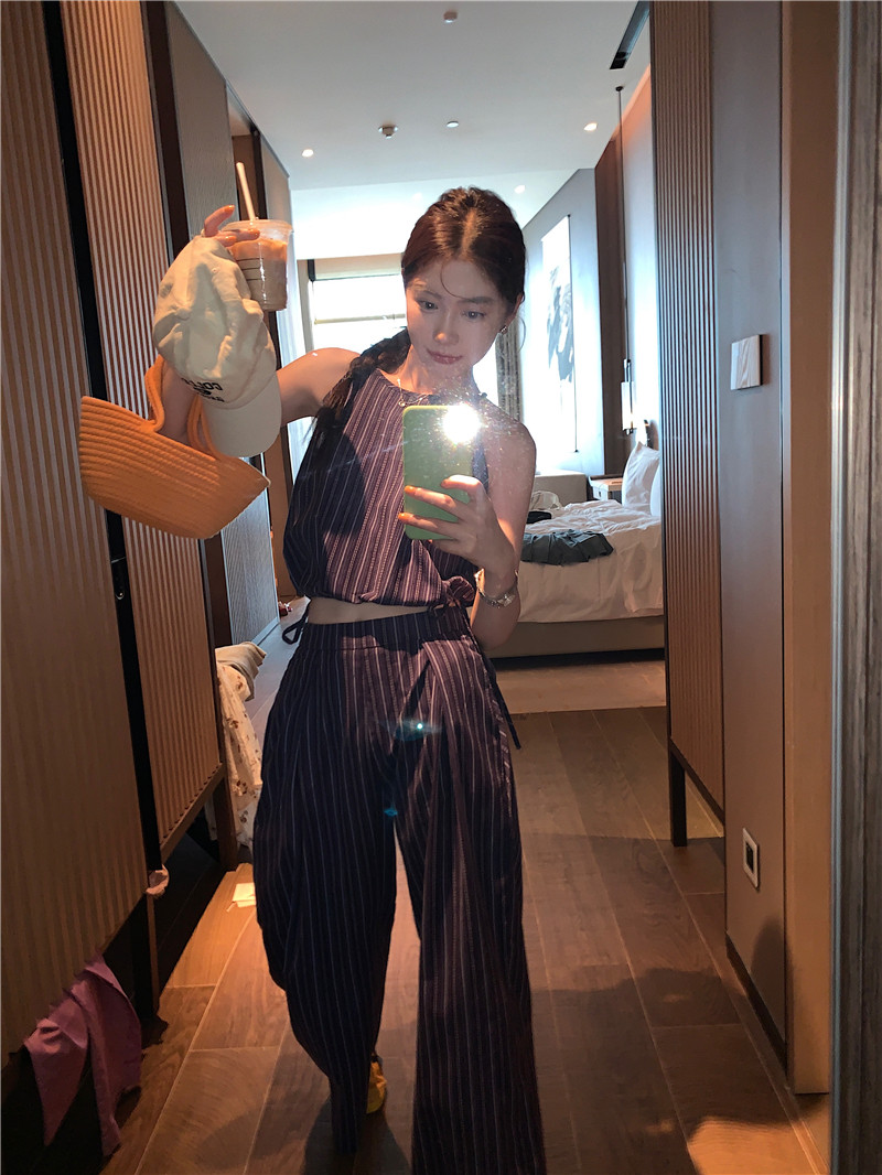 Комплект, летняя майка топ, штаны, китайский стиль, высокая талия, свободный прямой крой