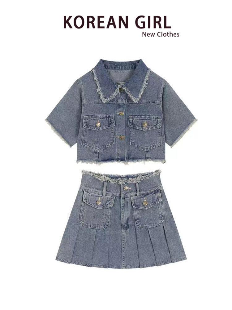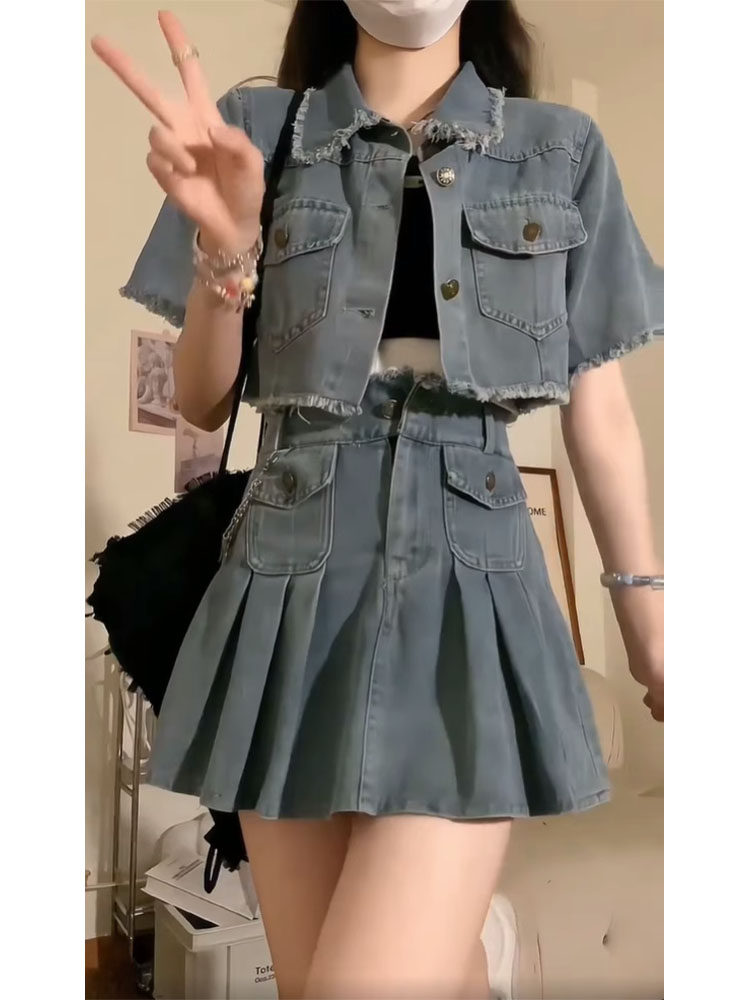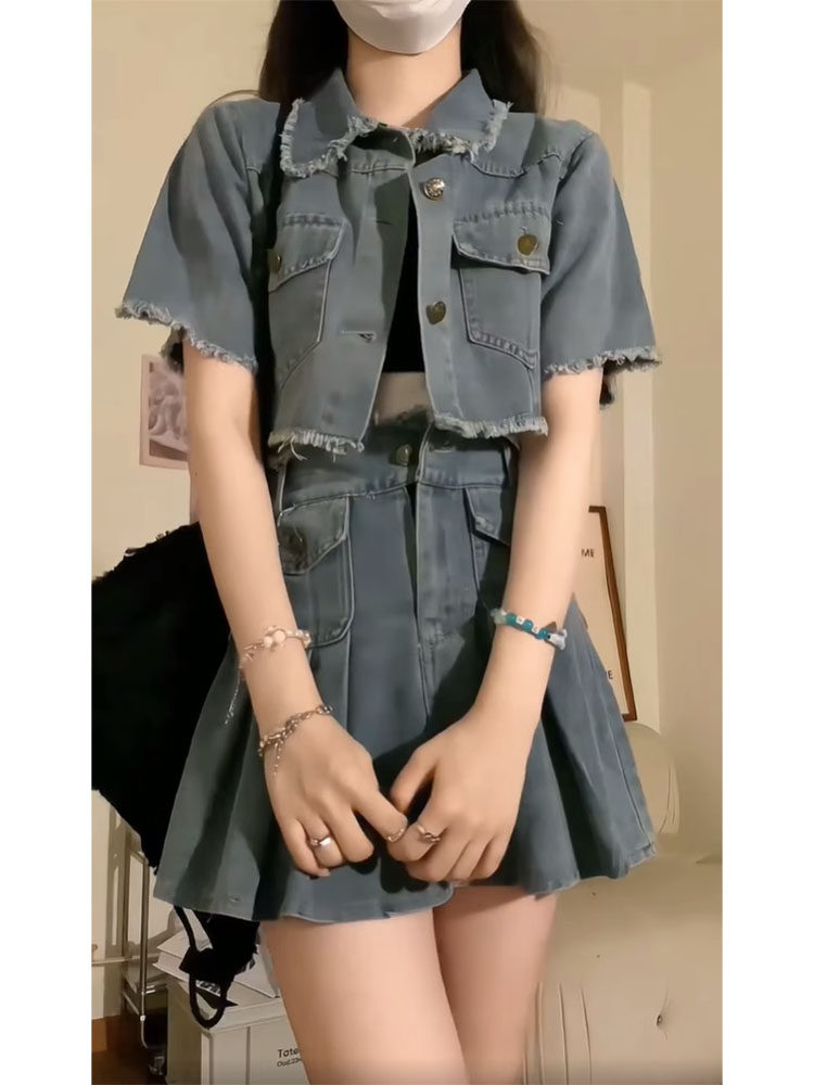 Синяя цветная джинсовая юбка, летний комплект, куртка, платье, подходит для подростков