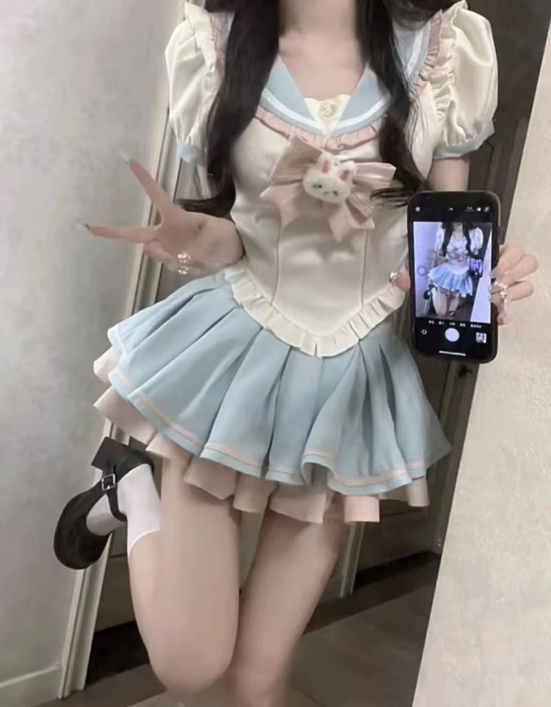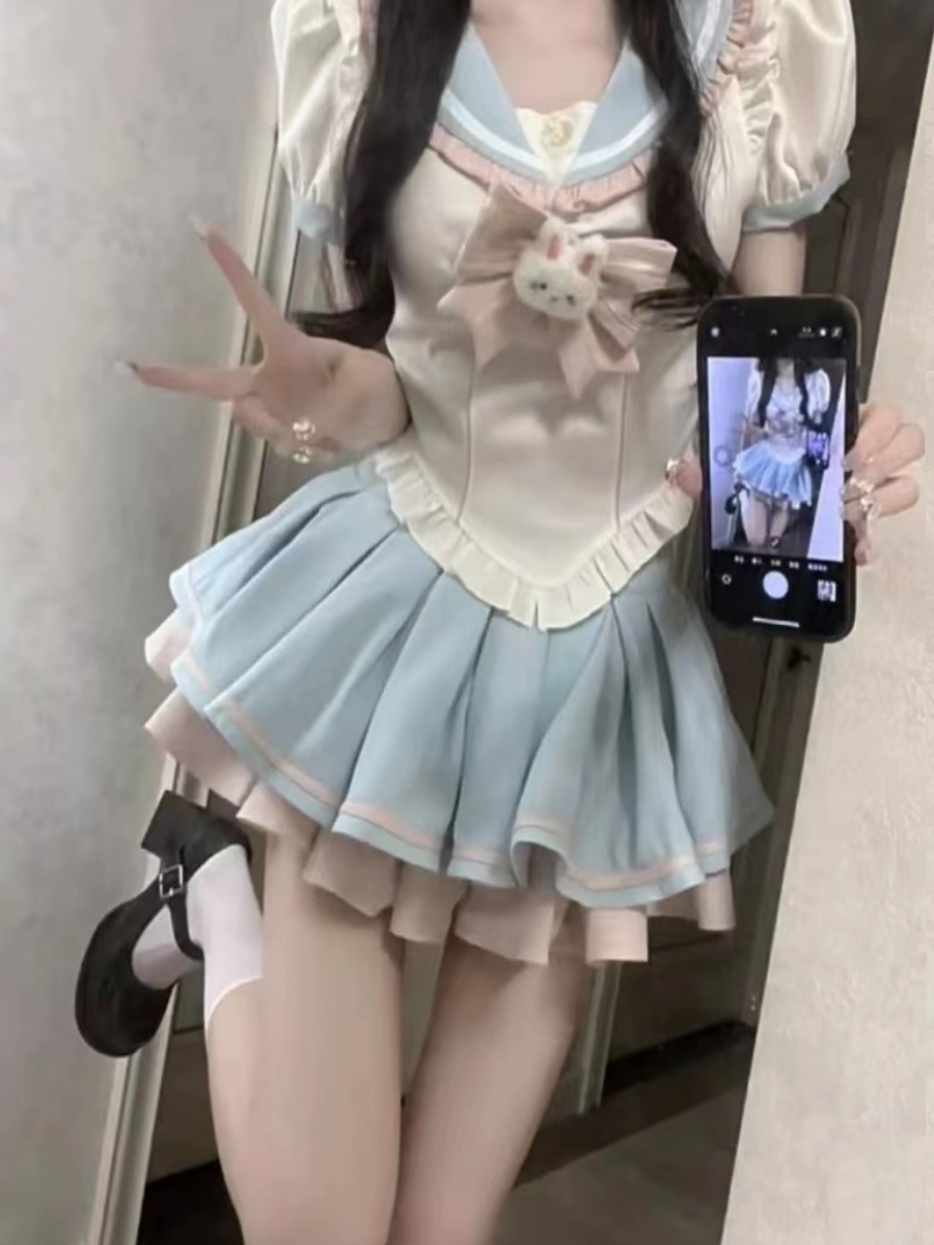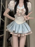 Милая студенческая юбка в складку, военно-морская рубашка с бантиком, мини-юбка, брендовый комплект, высокая талия, в западном стиле