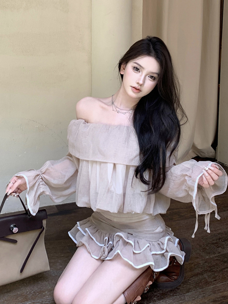 Осенний комплект, сексуальная рубашка, мини-юбка, открытые плечи, с акцентом на бедрах