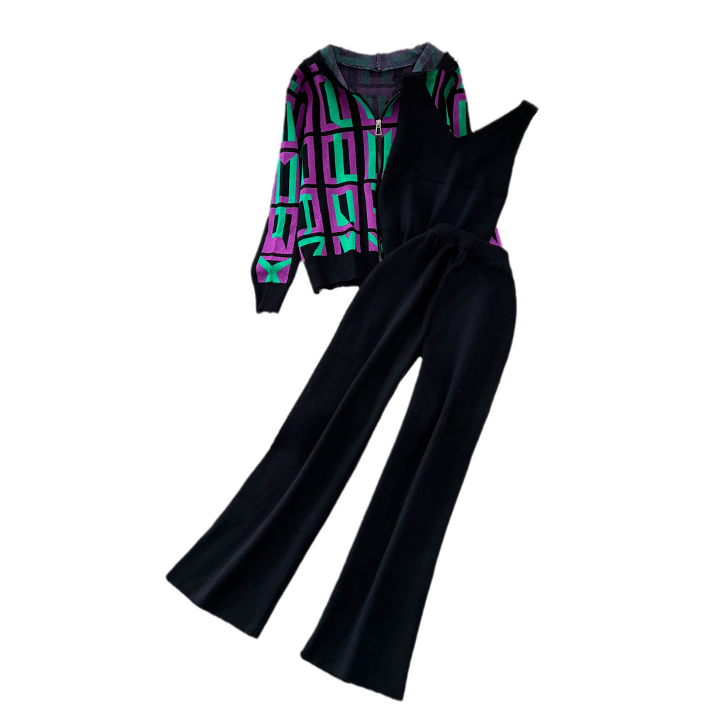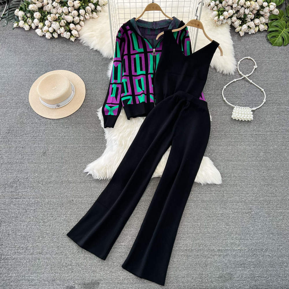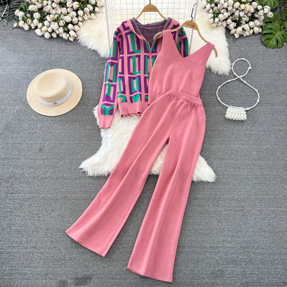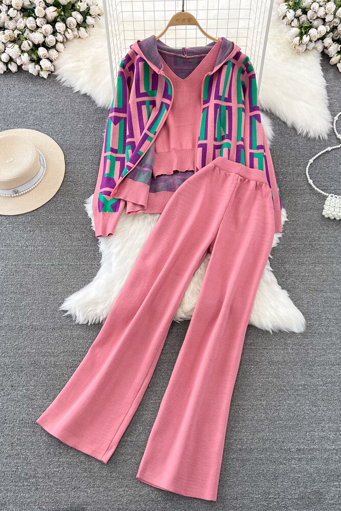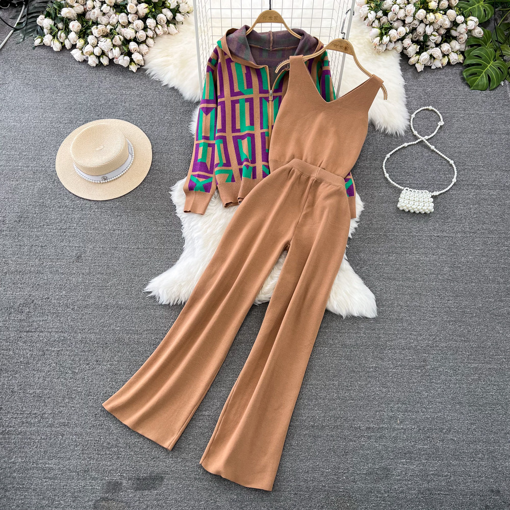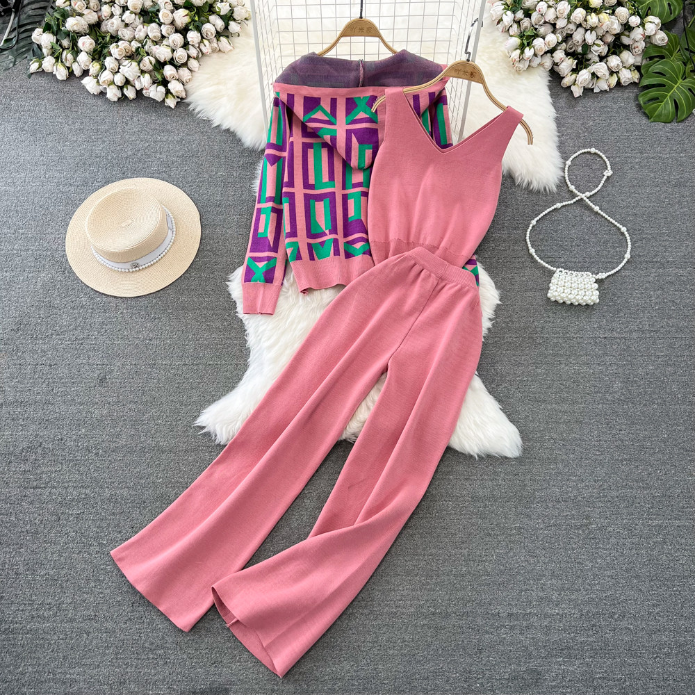 Комплект, лонгслив с капюшоном с ромбовидным узором, трикотажная толстовка, приталенный жилет, штаны, в корейском стиле, 3 предмета, высокая талия, свободный прямой крой
